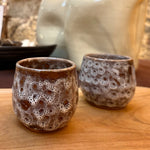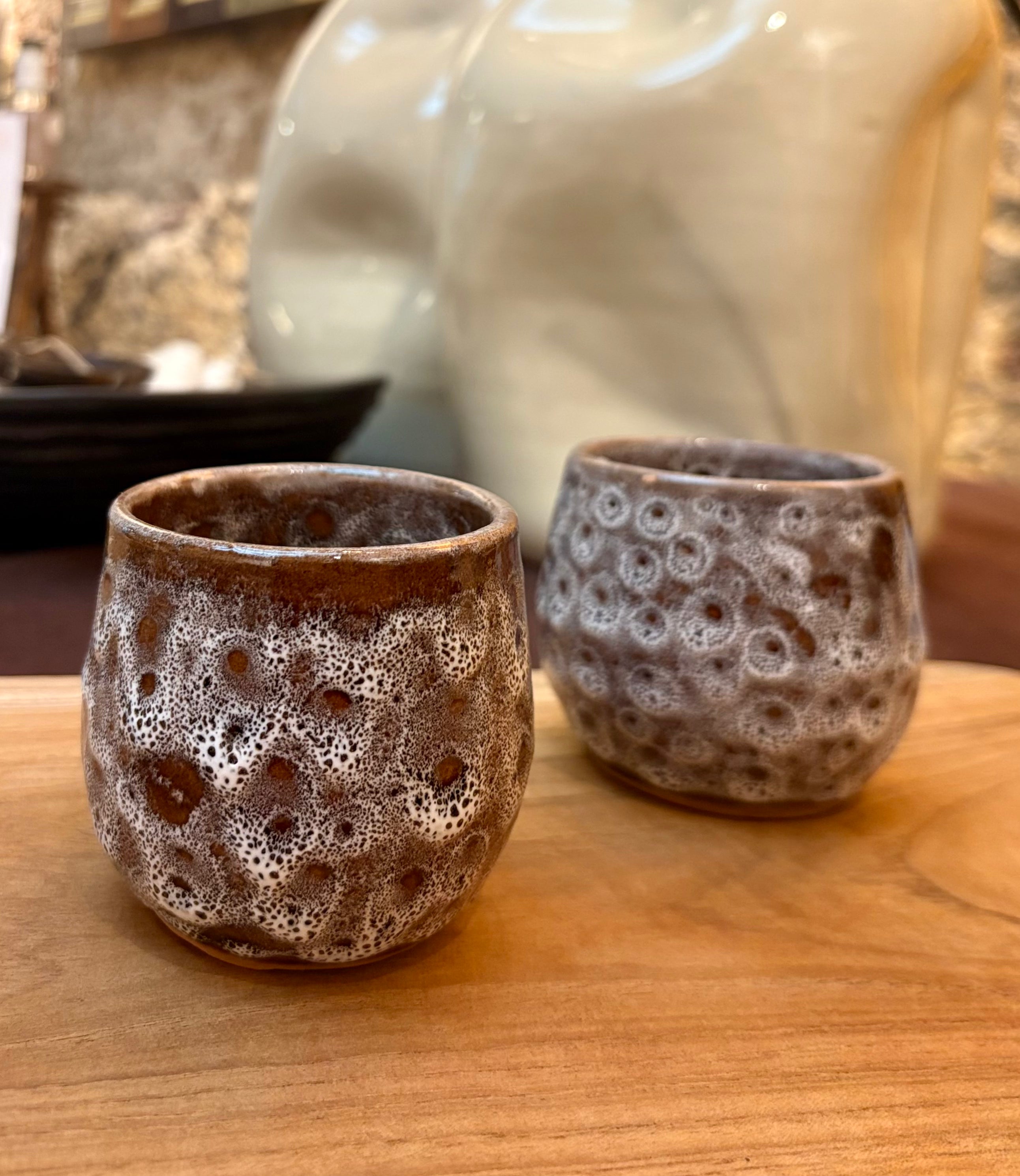 Deze handgemaakte kopjes hebben een warme, aardse uitstraling met een speels patroon van bubbels en cirkels in bruine en witte tinten. De organische glazuurafwerking maakt elk kopje uniek, perfect voor een knusse thee- of koffiemoment.
