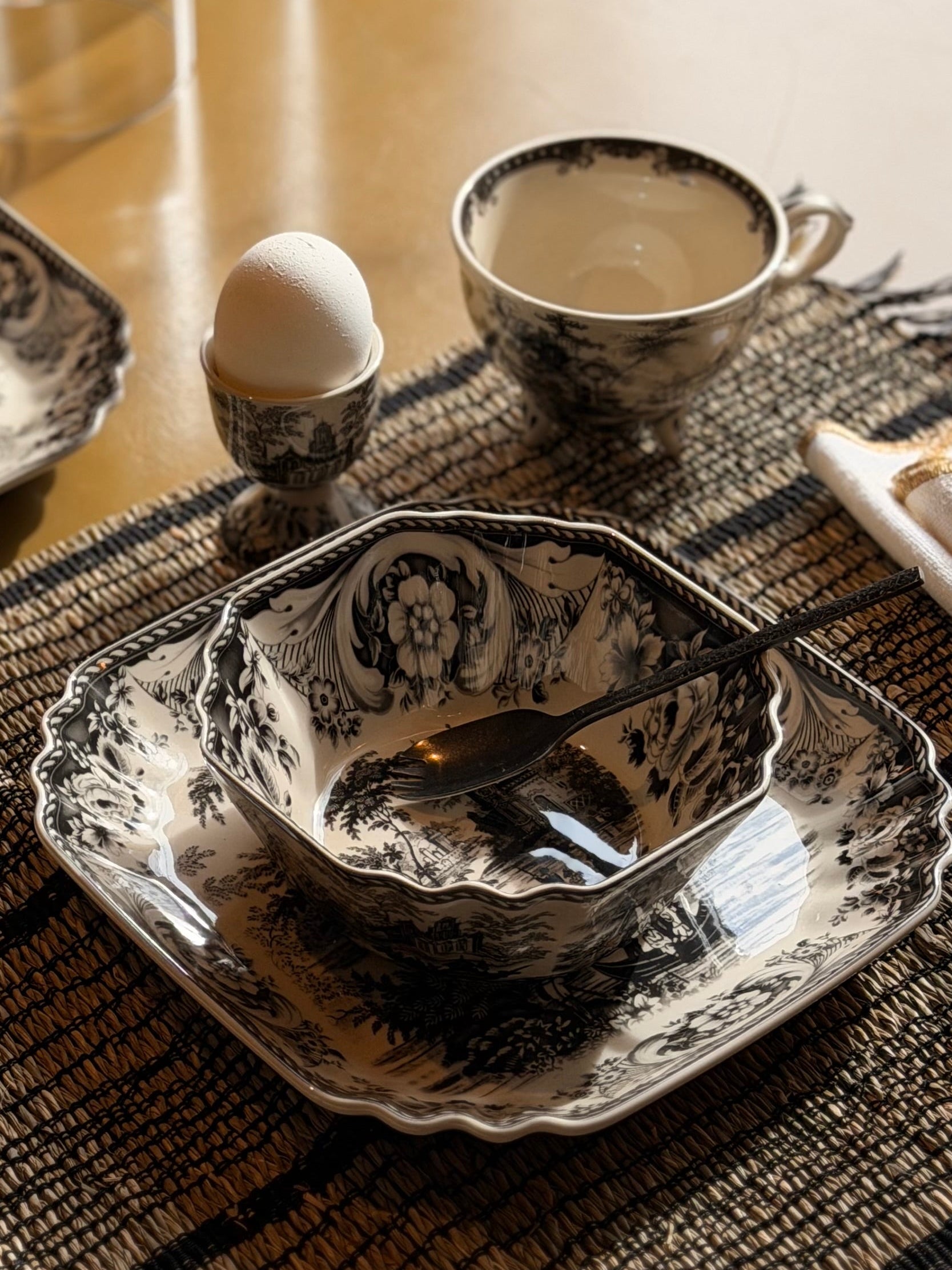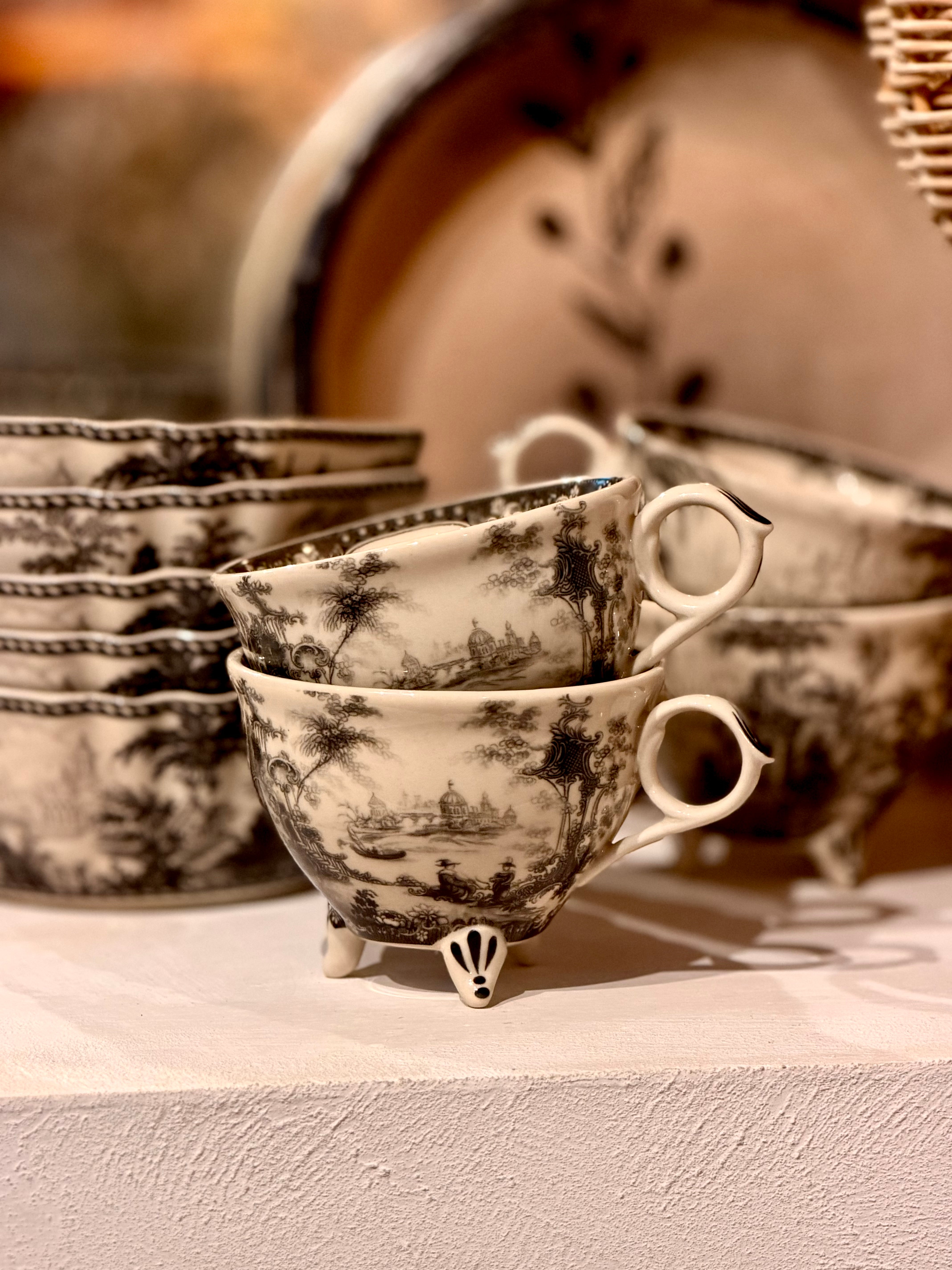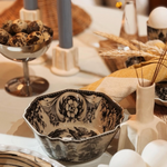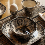 Het Ella servies brengt de charme van vroeger samen met een eigentijdse uitstraling. Dit unieke servies, geïnspireerd op vintage designs, wordt gekenmerkt door verfijnde zwarte tekeningen die elk item een speels en artistiek karakter geven.
