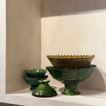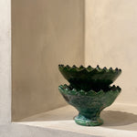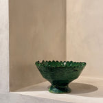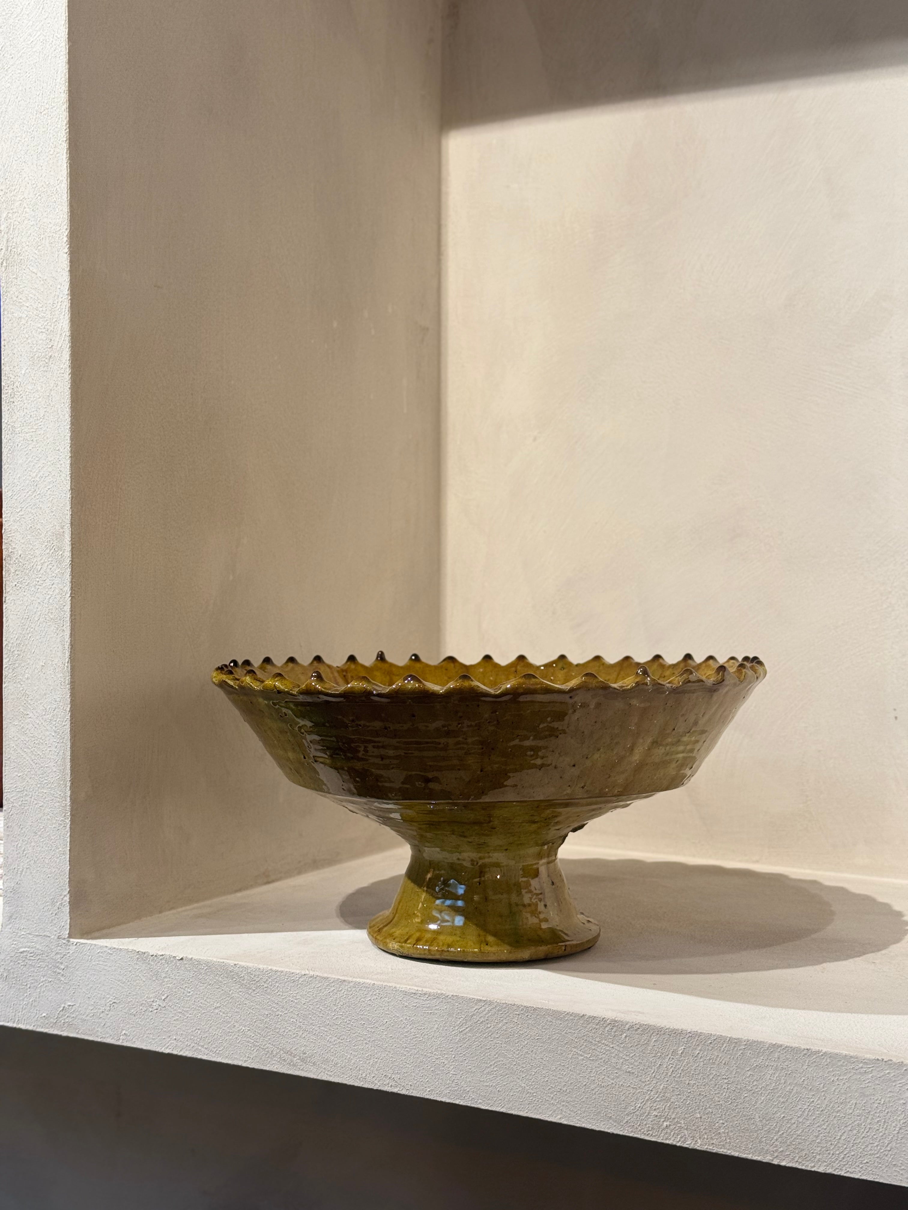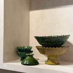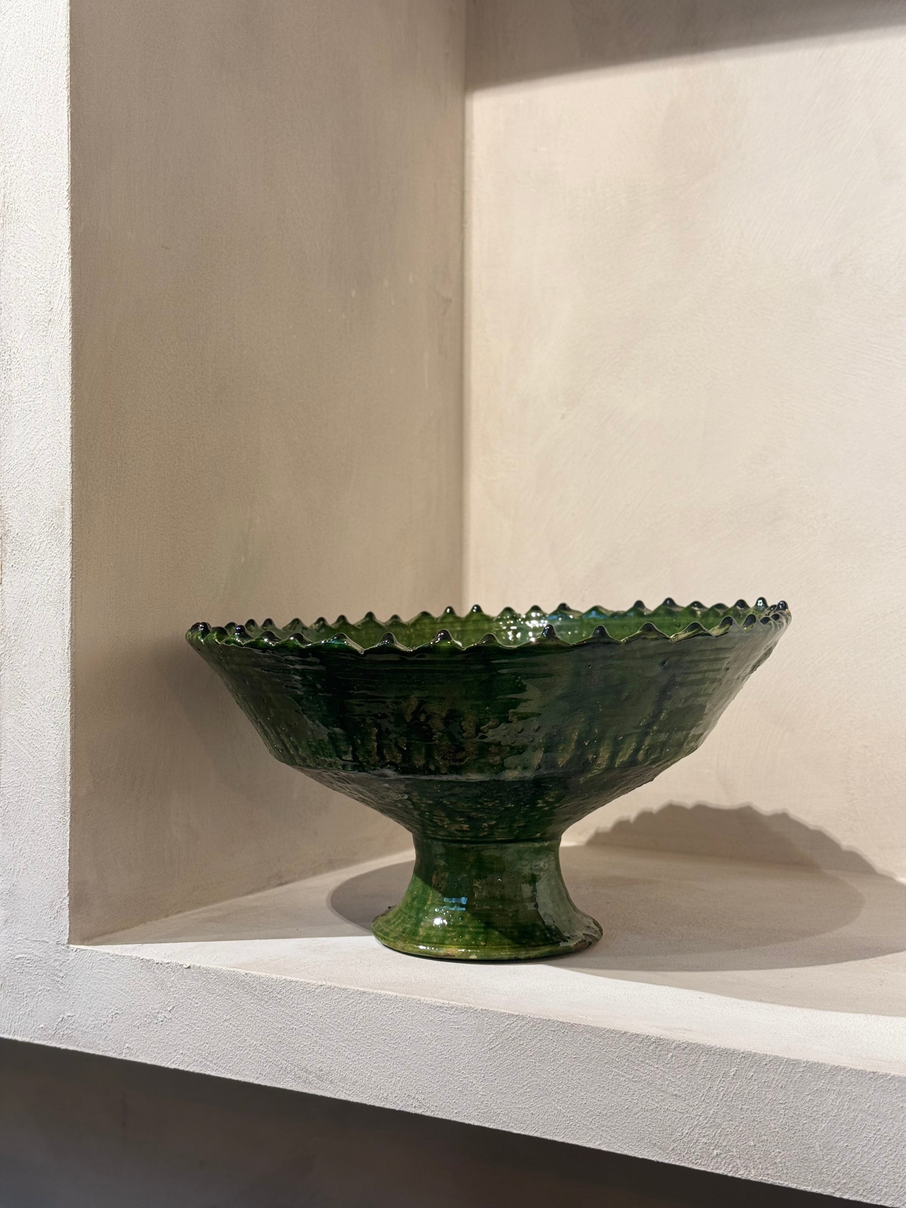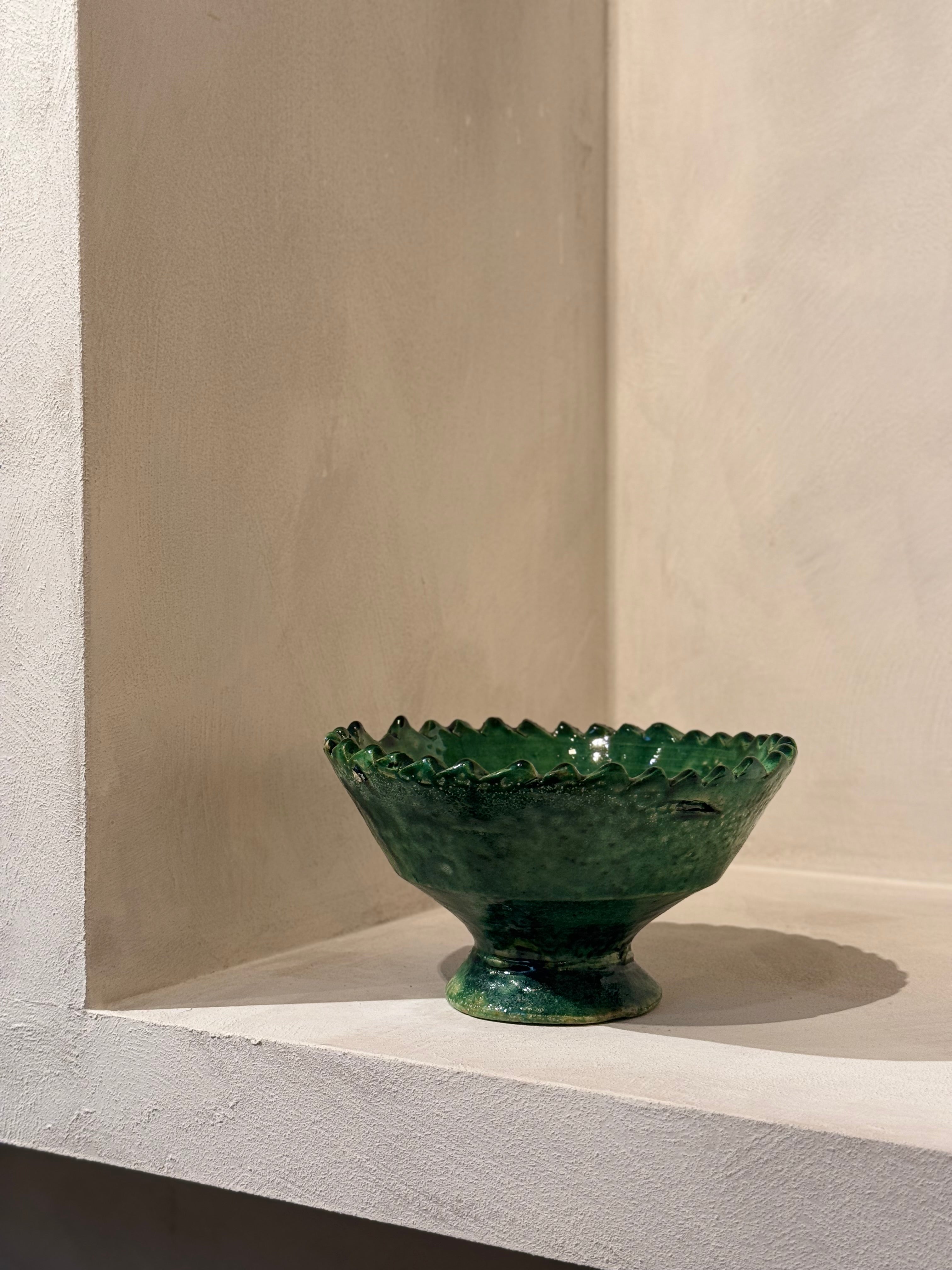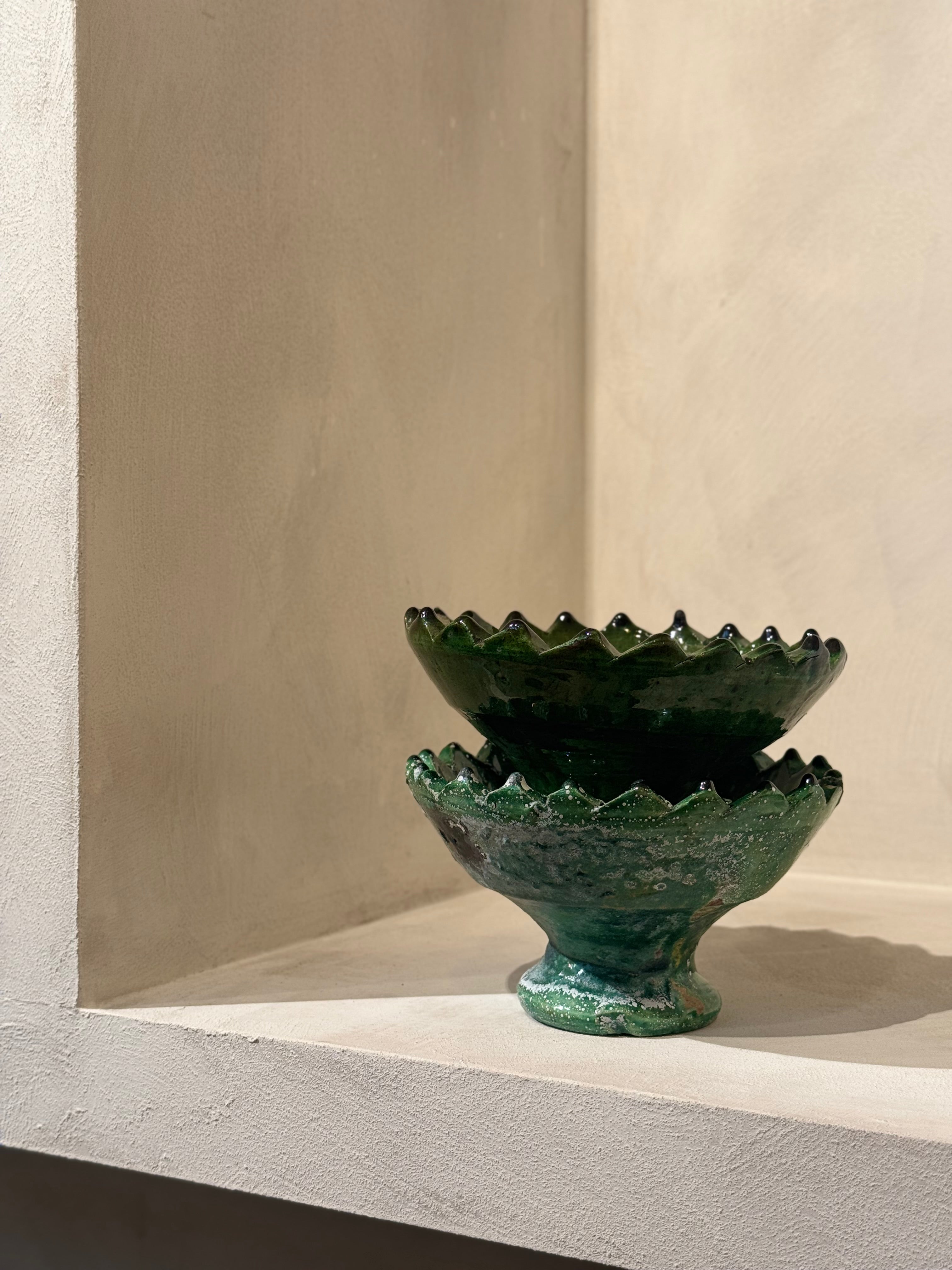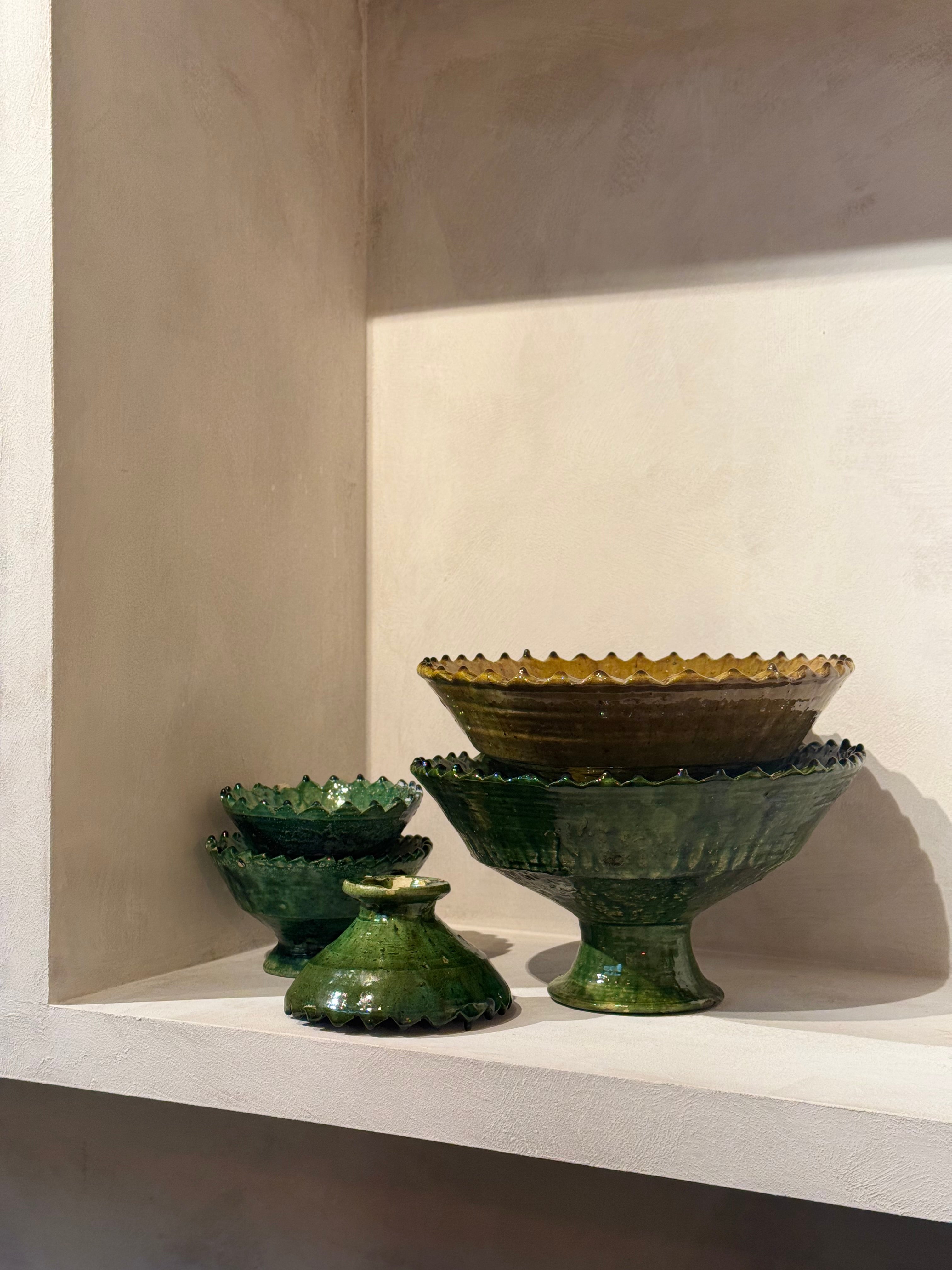 Stuk voor stuk unieke schalen, met de hand gevormd en geglazuurd in het Marokkaanse dorpje Tamegroute. Elk exemplaar heeft zijn eigen karakter, kleur en vorm — geen twee zijn hetzelfde.