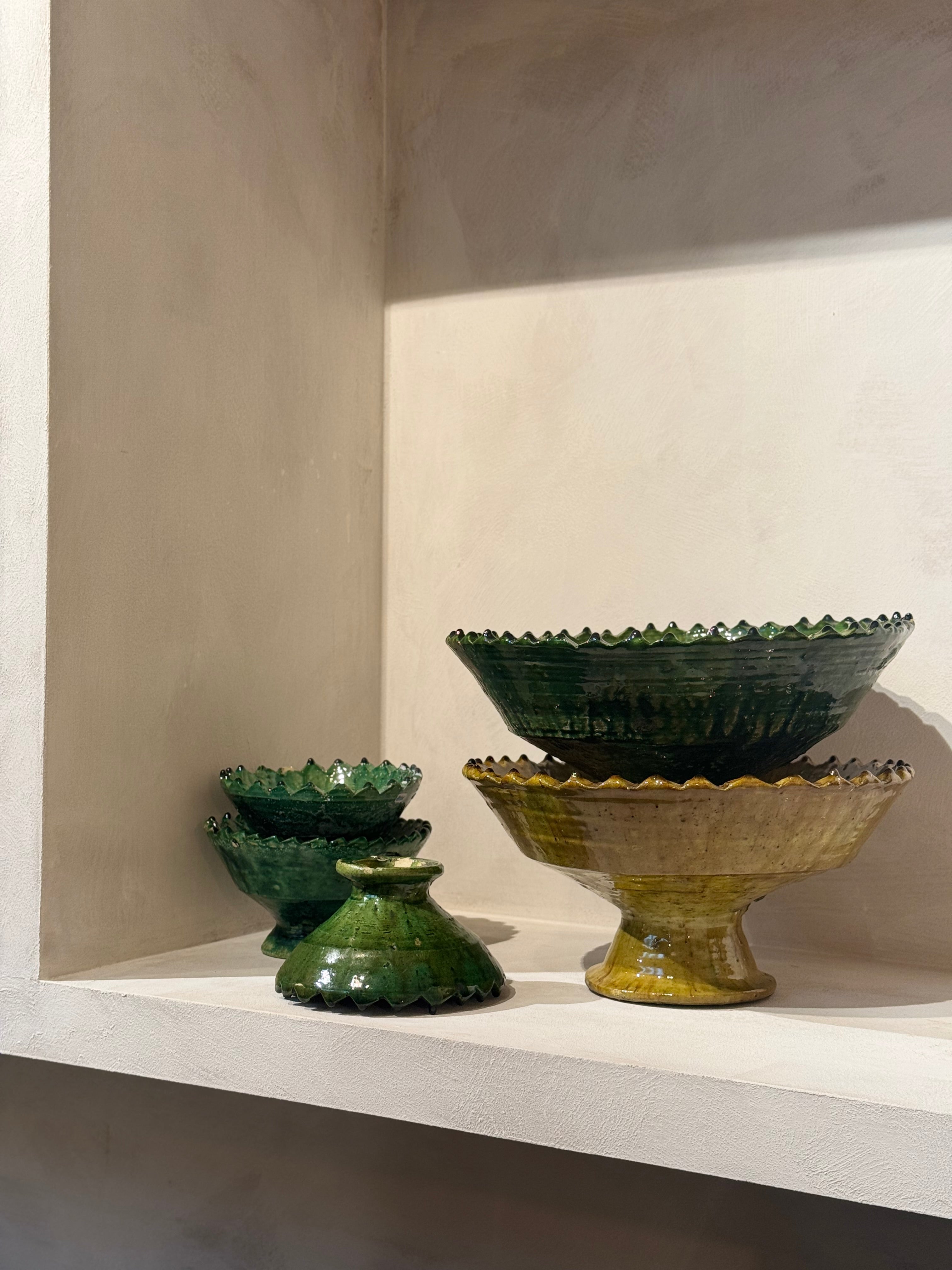 De schalen zijn verkrijgbaar in beide winkels. Let op: elk stuk en elke tint is anders — juist dat maakt Tamegroute zo bijzonder.