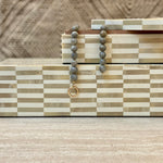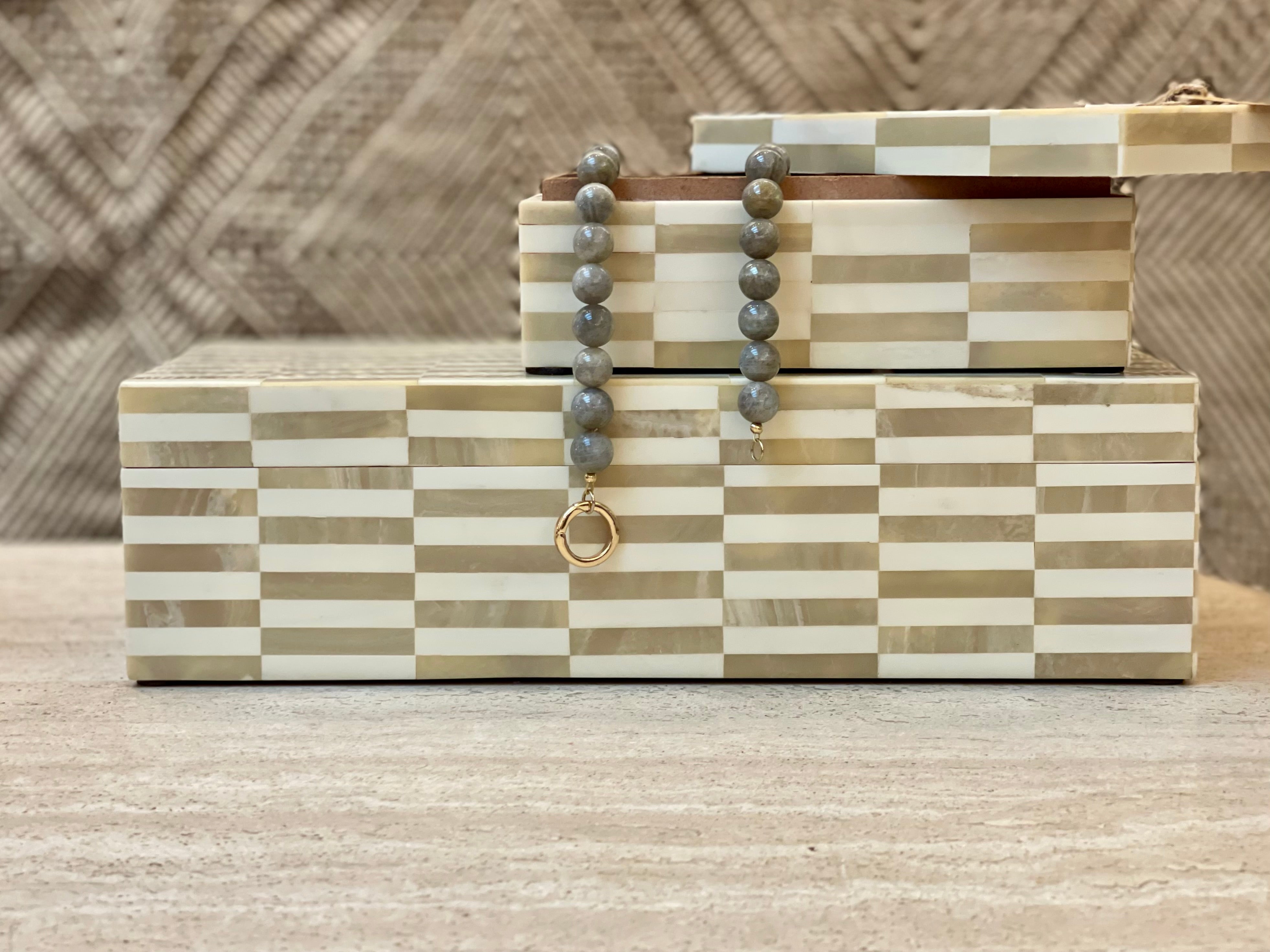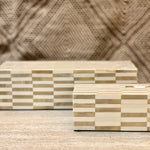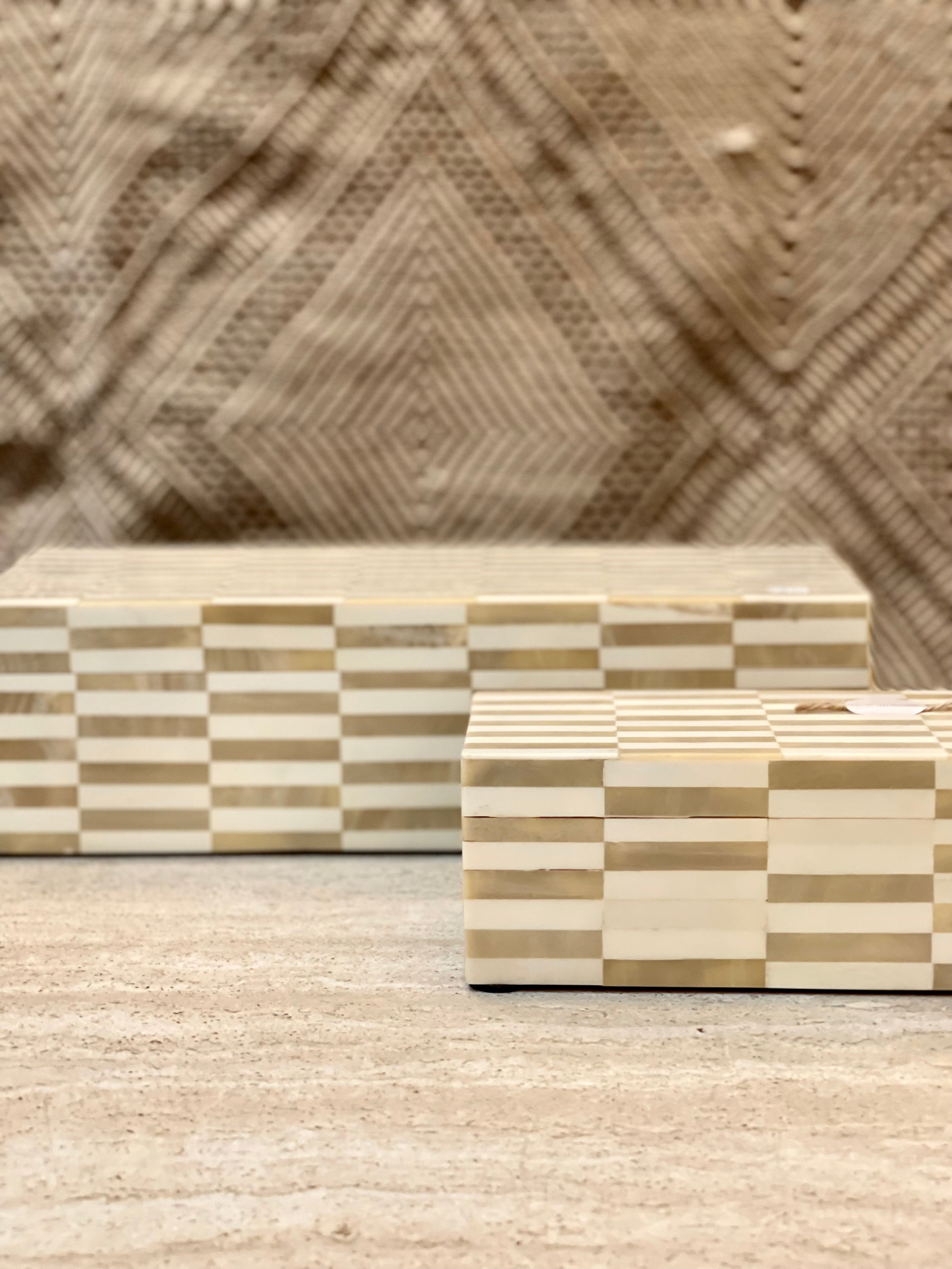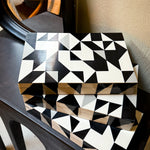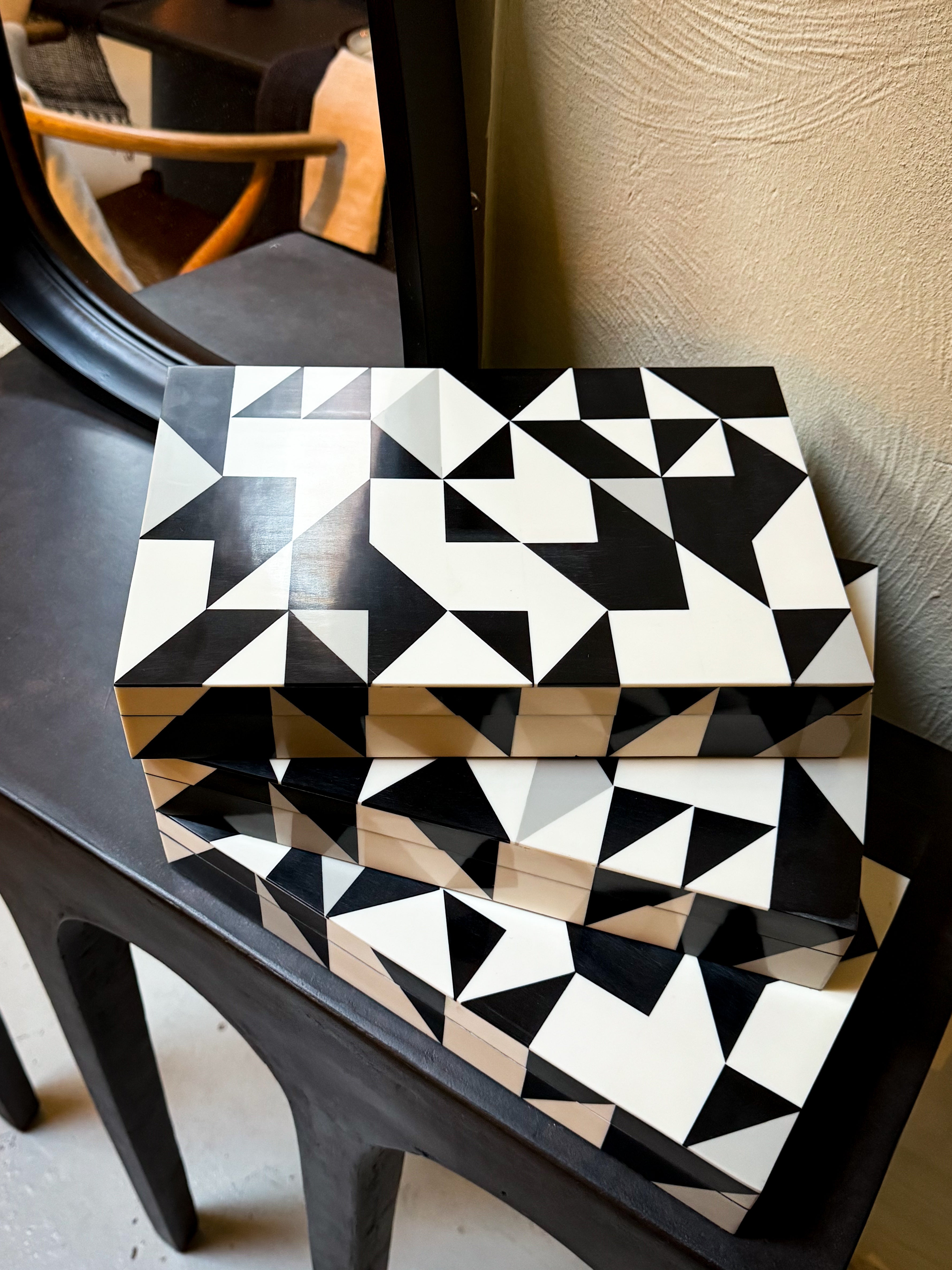 This is the "Graphic Treasure Box" from our Treasure Box collection, made in India. This collection consists of three beautifully decorated chests to store your treasures. The abstract allure of these pieces add a dynamic feel to the room and capture the eye. The chests are embellished with intricate geometric patterns made of animal bone and resin. This design is incapsulated in a glossy coating layer to last a lifetime.