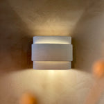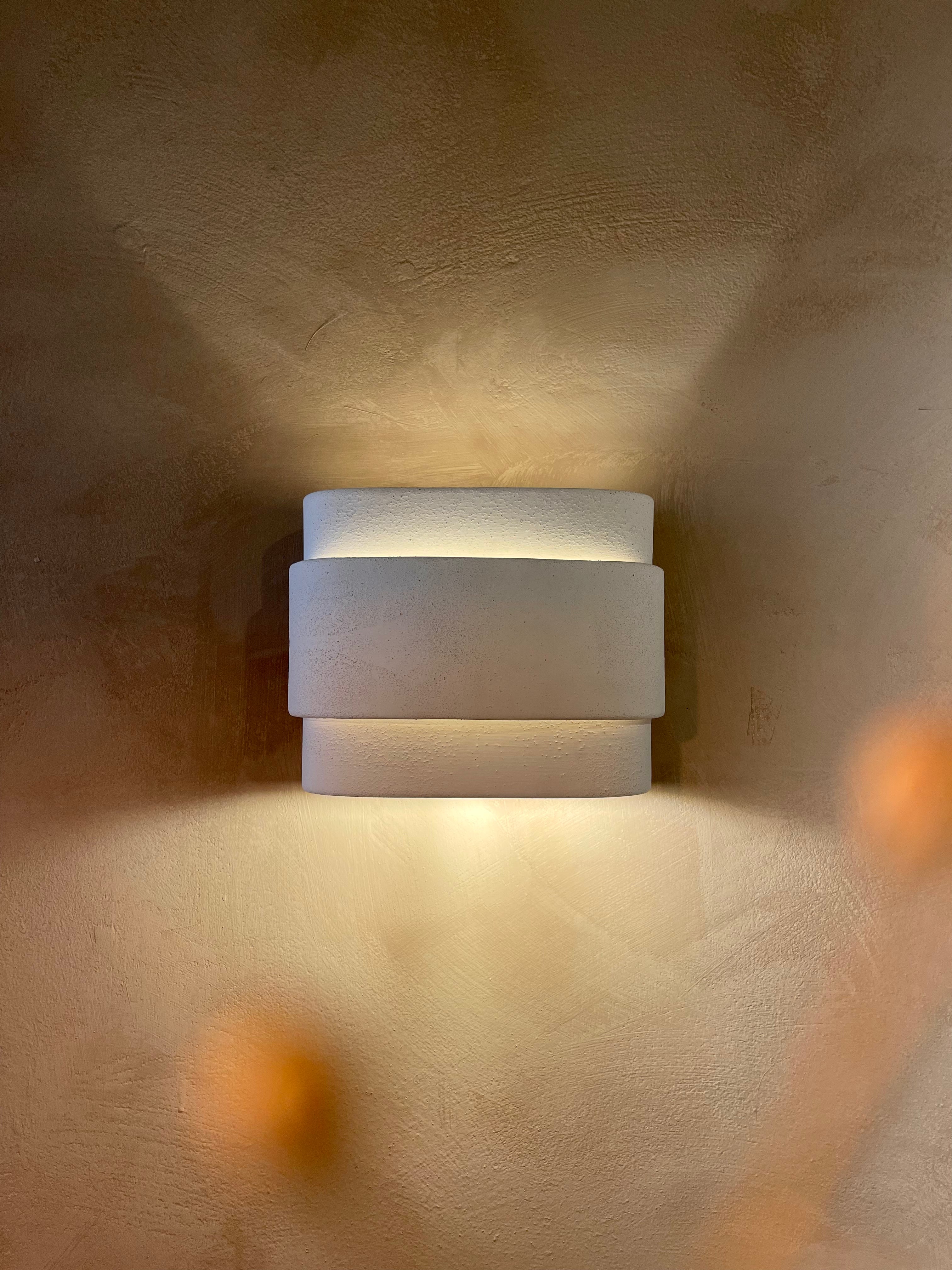Lou is een beige stenen wandlamp die op unieke wijze met de hand is afgewerkt om een ongelijkmatige textuur te creëren, waardoor elk stuk uniek is. Met Lou's ambachtelijke charme en warme gloed verlicht je niet alleen je ruimte, maar voeg je ook een vleugje individualiteit toe aan je interieur.