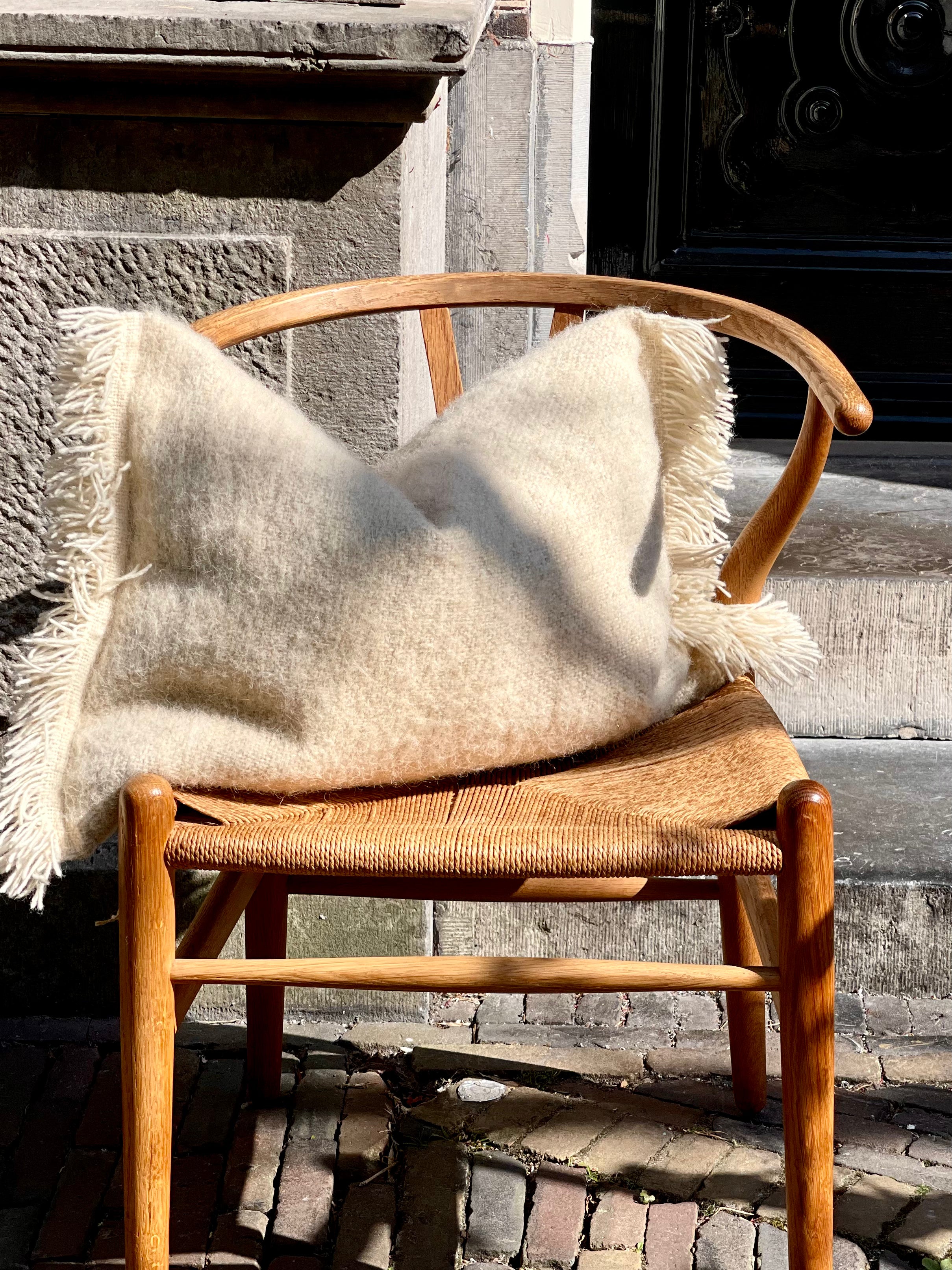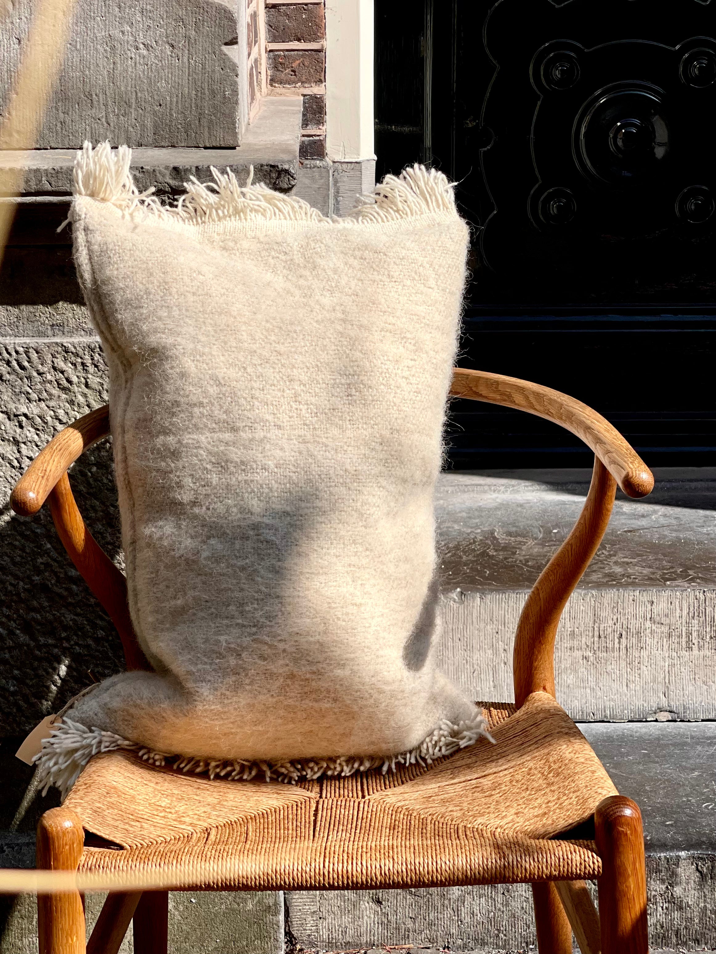 Deze 100% wollen kussenhoes, met rustige patronen en zachte natuurlijke kleuren, straalt een perfecte balans uit tussen stoer en elegant. Afgewerkt met korte franjes aan de uiteinden voor een subtiele, stijlvolle touch. Zorgvuldig geselecteerd door Hanne tijdens haar laatste trip naar Marokko.