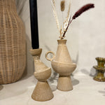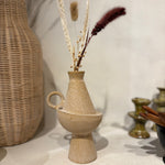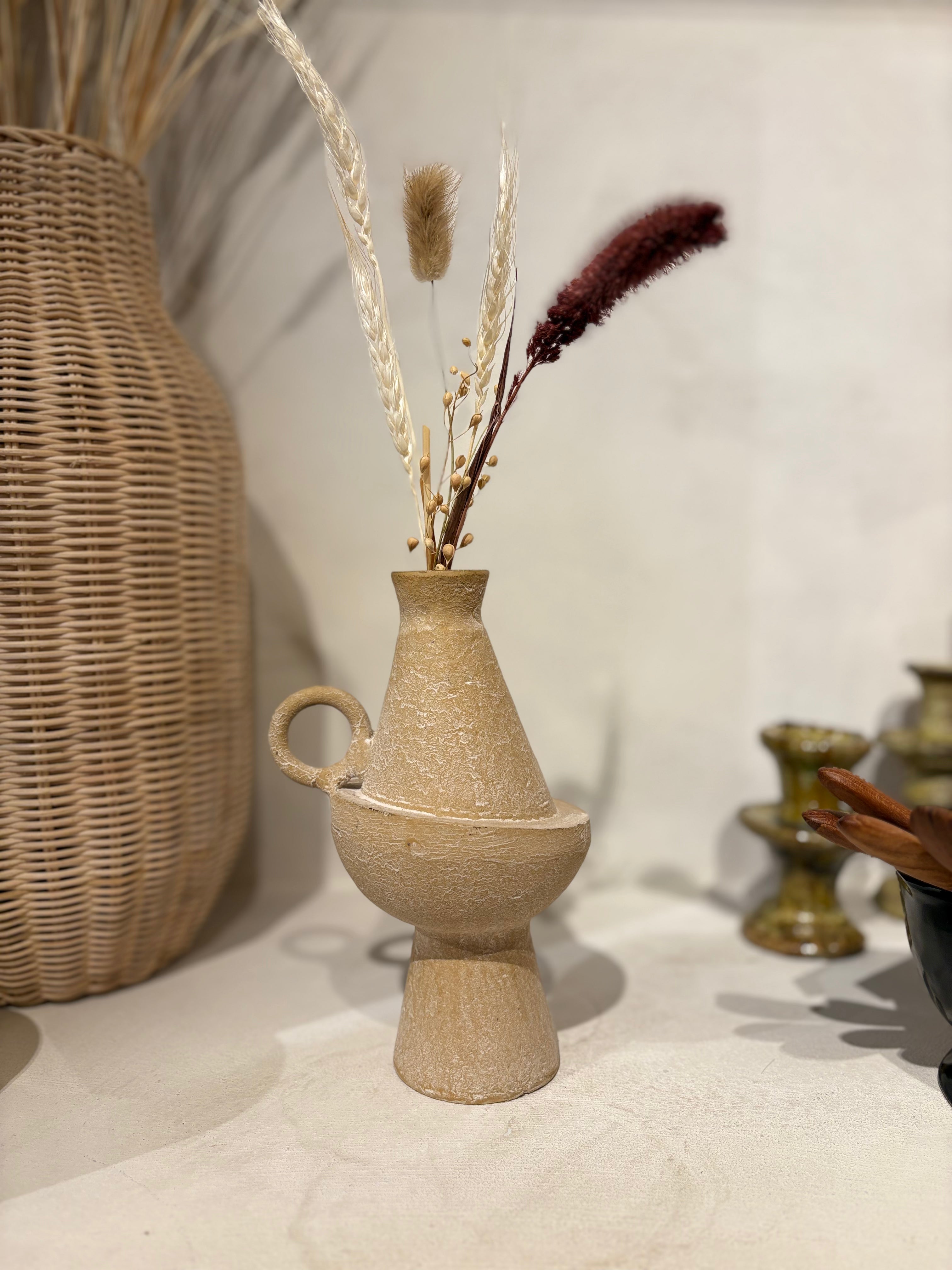 Deze vaas heeft een unieke, speelse vorm met een warme zandkleurige finish die meteen een natuurlijke sfeer in huis brengt. Het handvat en de organische lijnen geven hem een artistiek karakter, terwijl hij prachtig combineert met gedroogde bloemen of takken. Een stijlvol accent voor elk interieur!