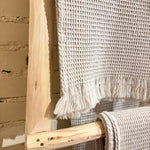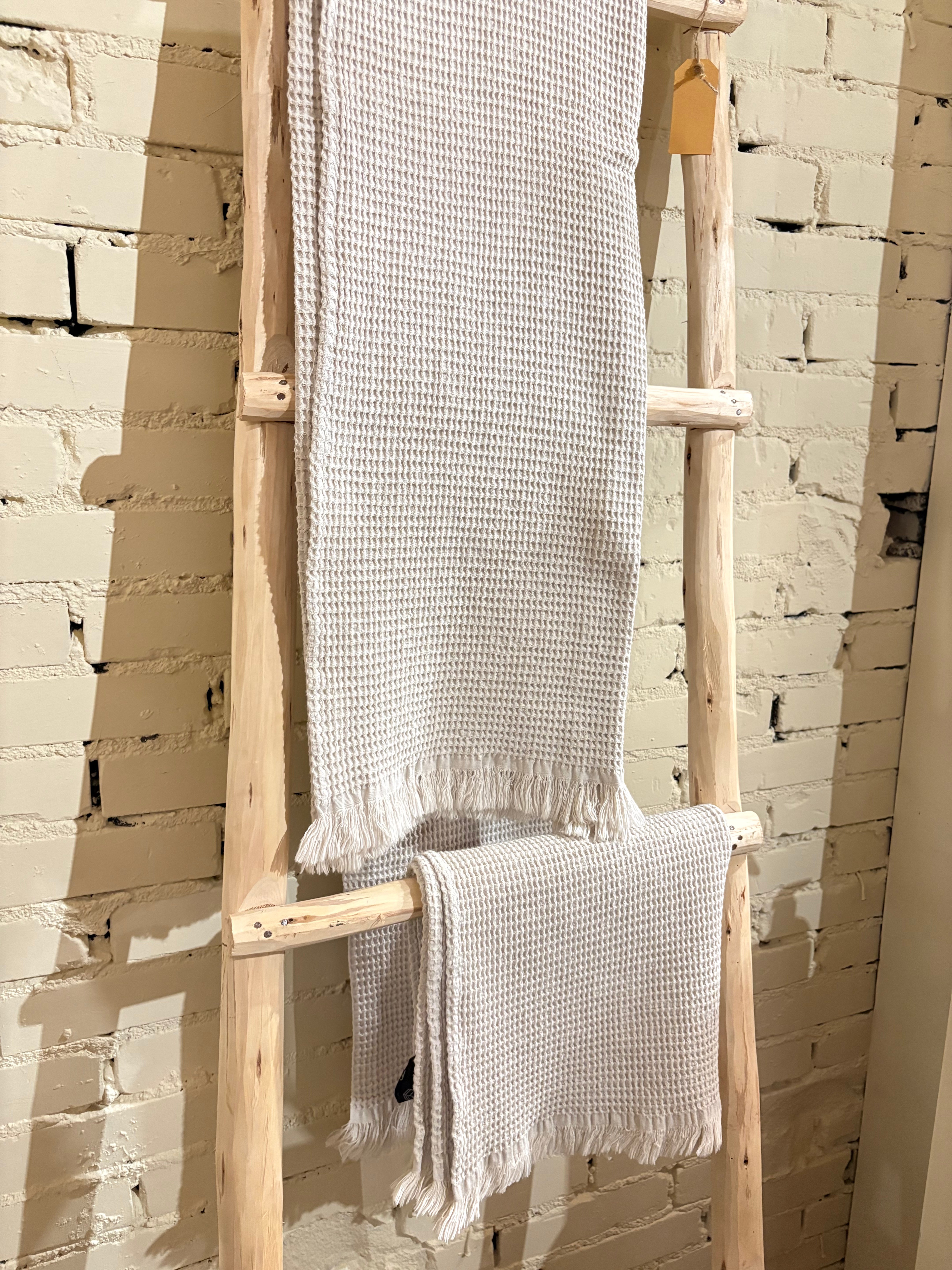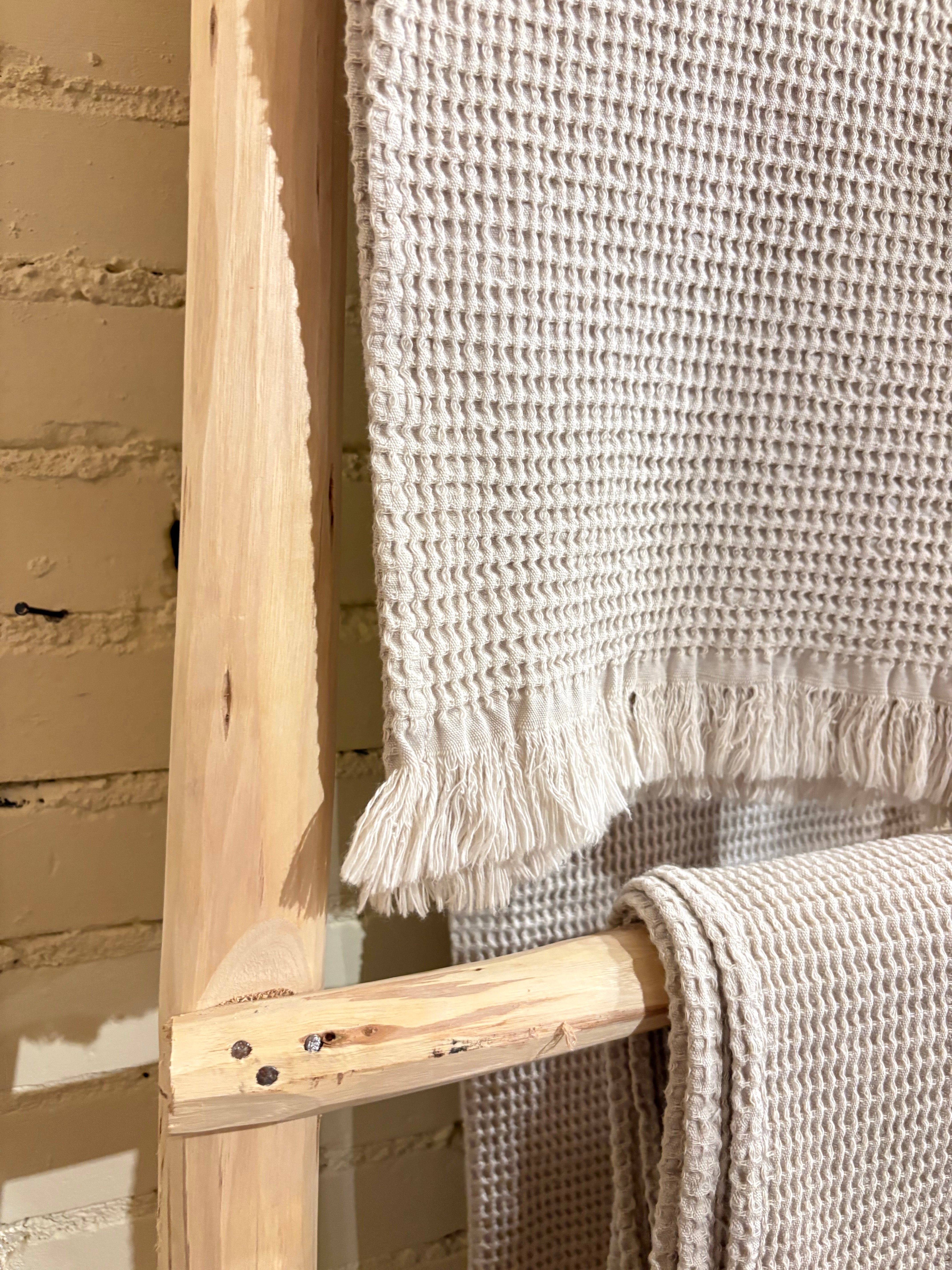 This towel features a pretty waffle pattern with fringe detailing, made from 100% natural cotton. Available in a variety of colors, perfect for mixing and matching with our bath mats and guest towels.