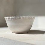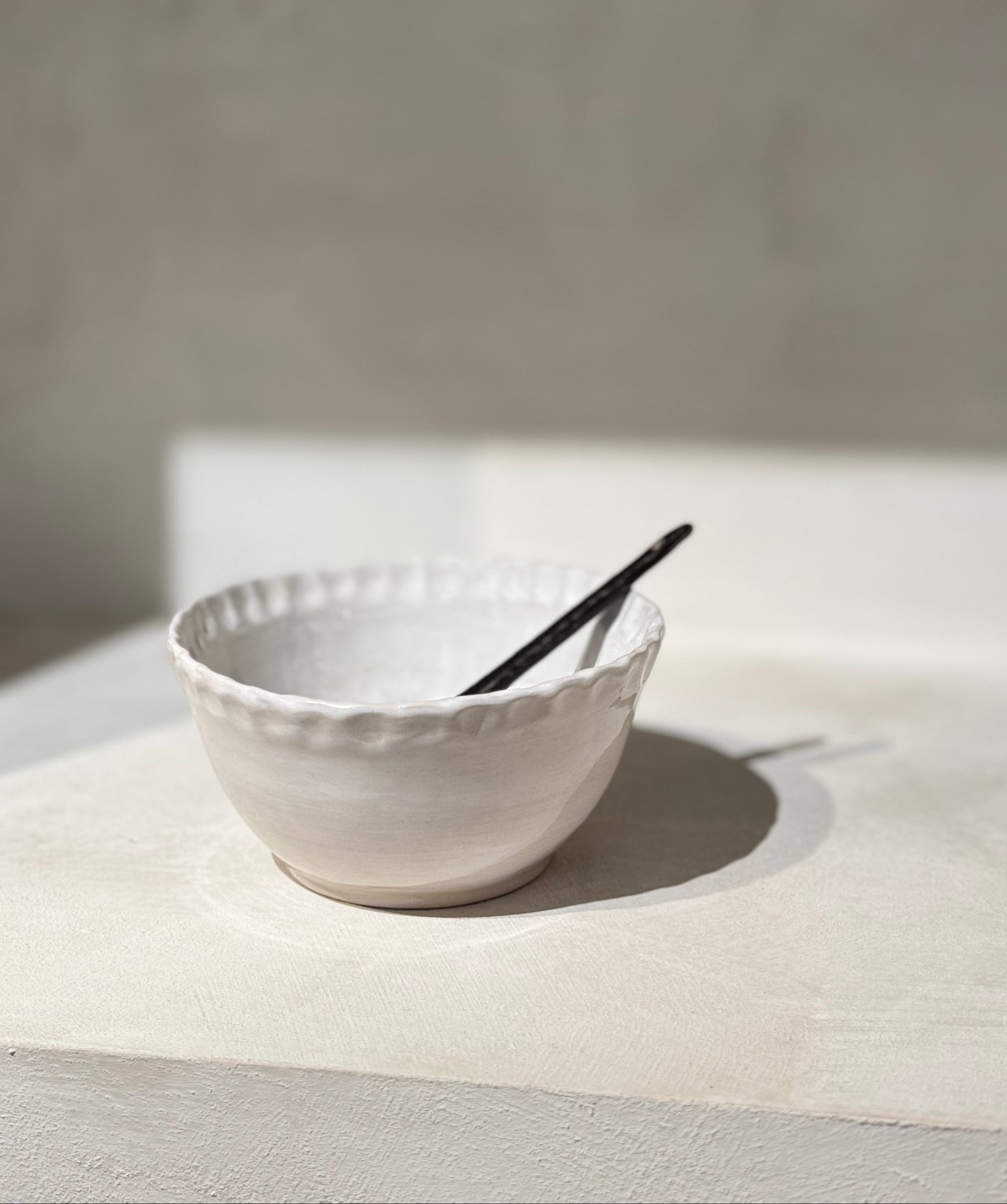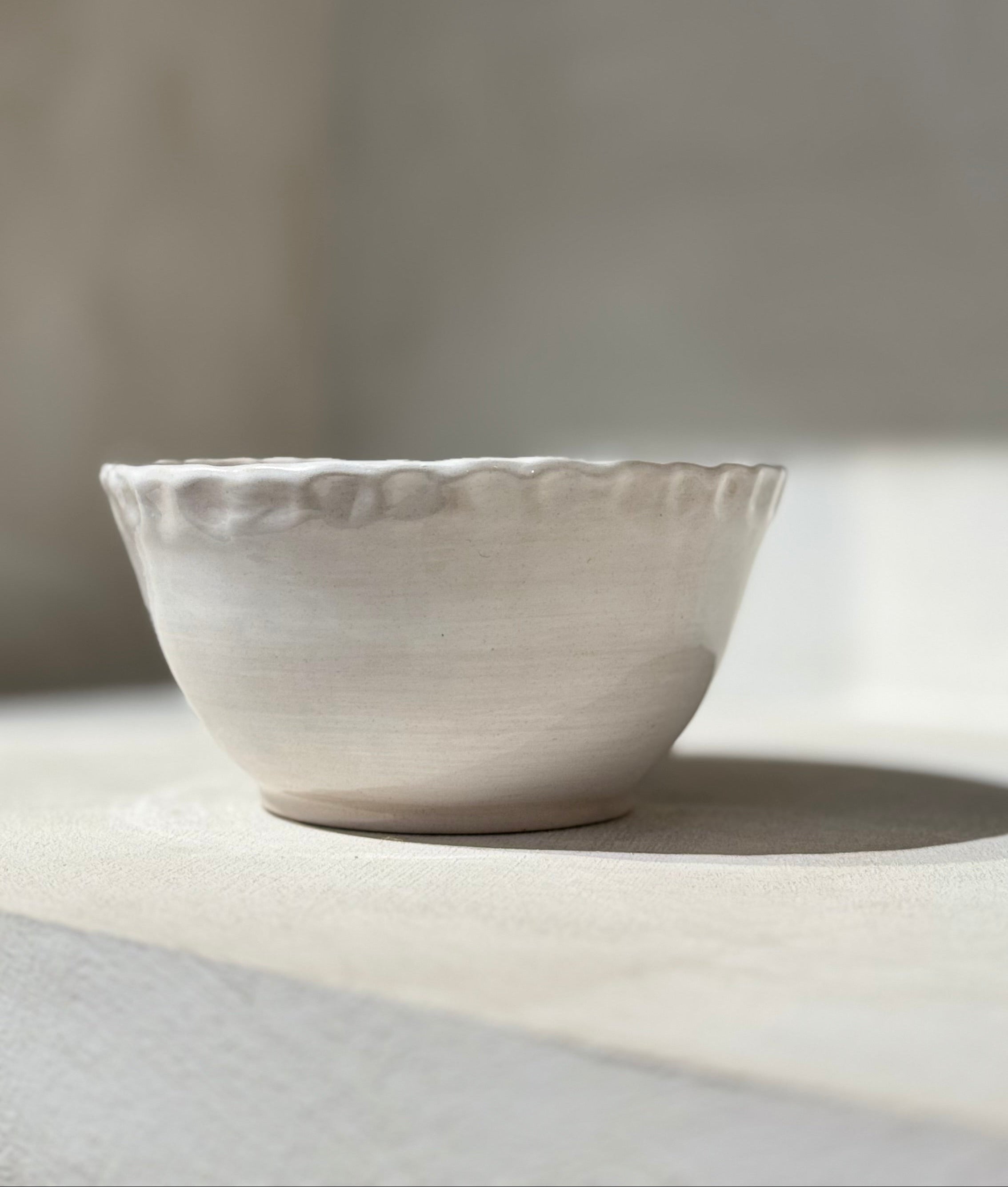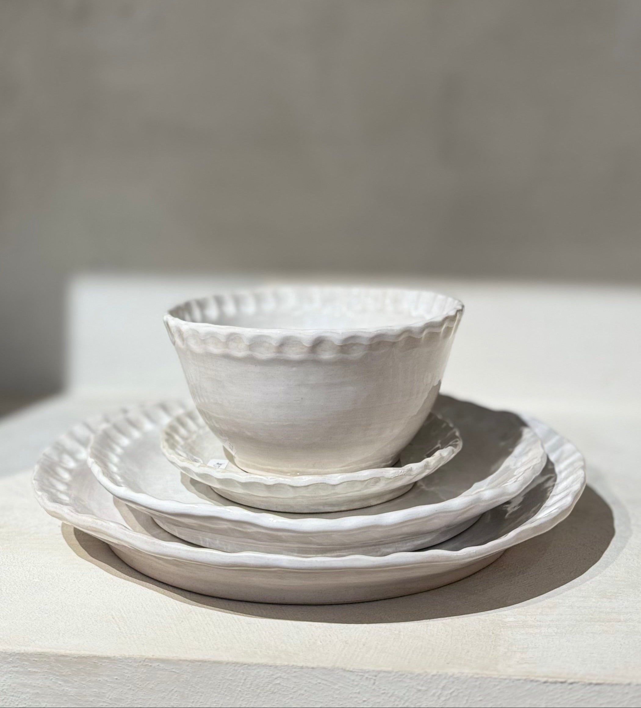 De helderwitte afwerking zorgt voor een frisse, tijdloze uitstraling, terwijl de subtiele deukjes langs de zijkanten elk stuk een uniek en ambachtelijk karakter geven. Deze verfijnde details zorgen voor een mooie balans tussen strak en organisch.
