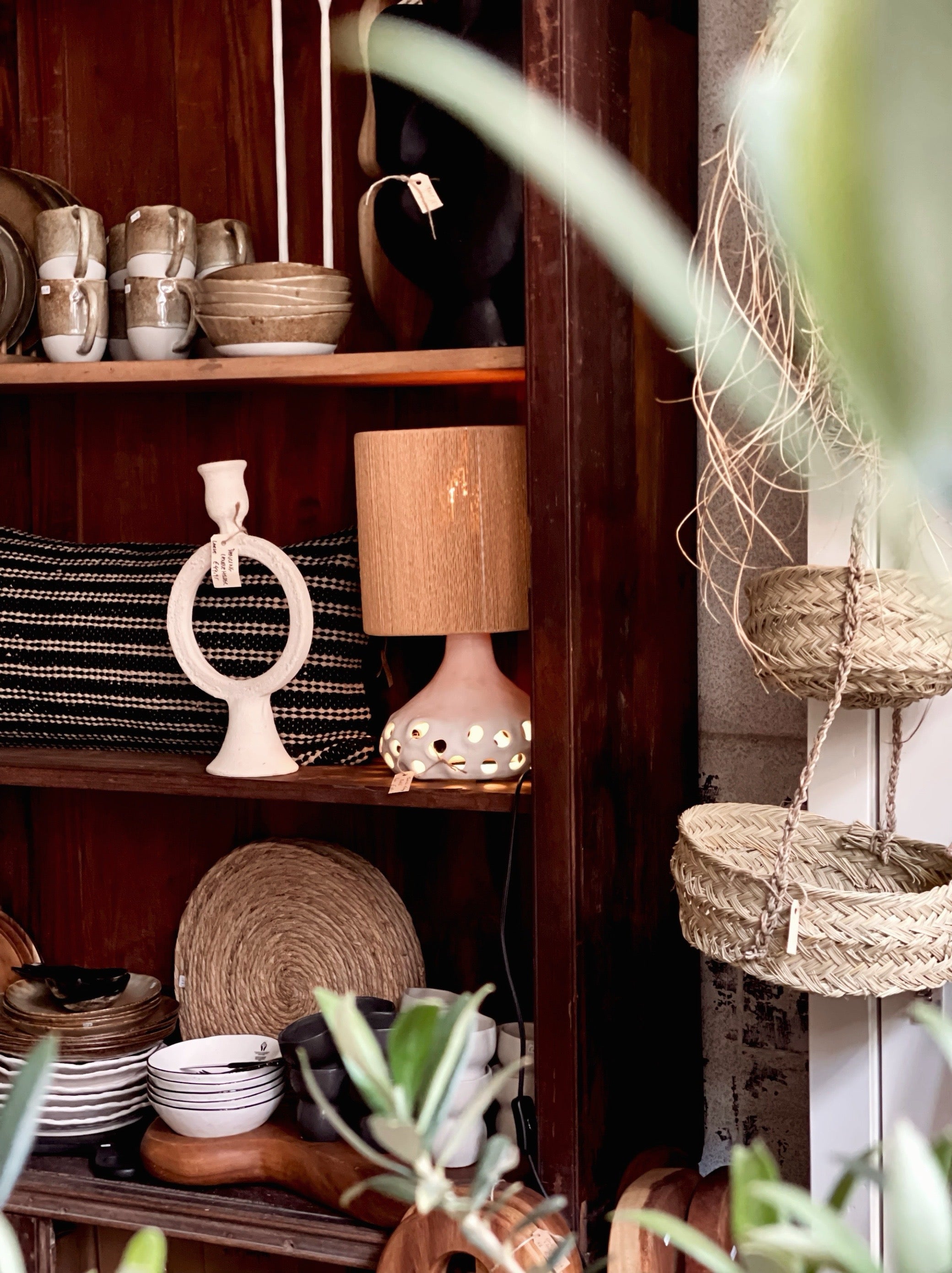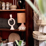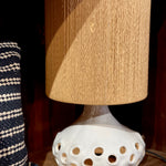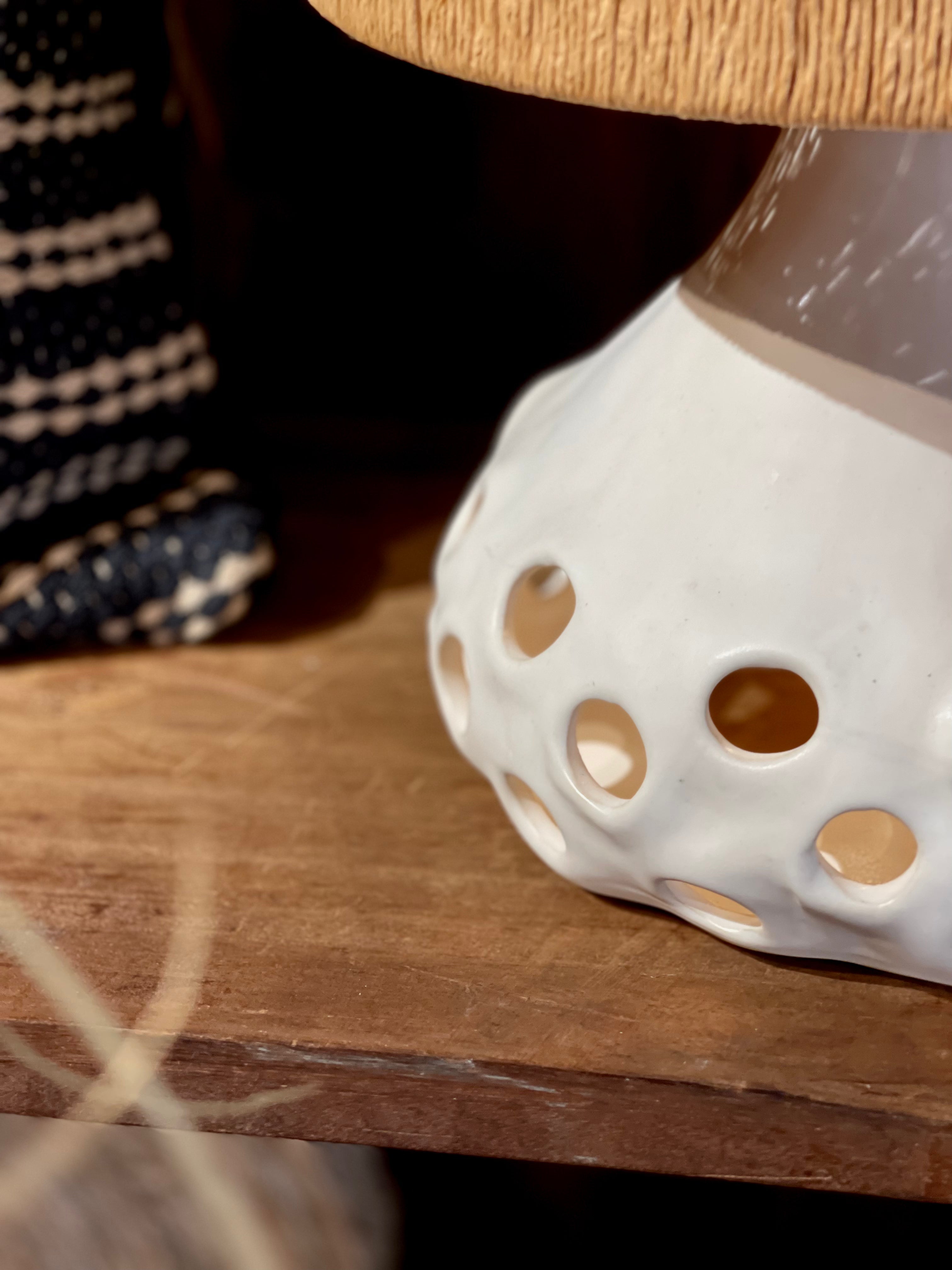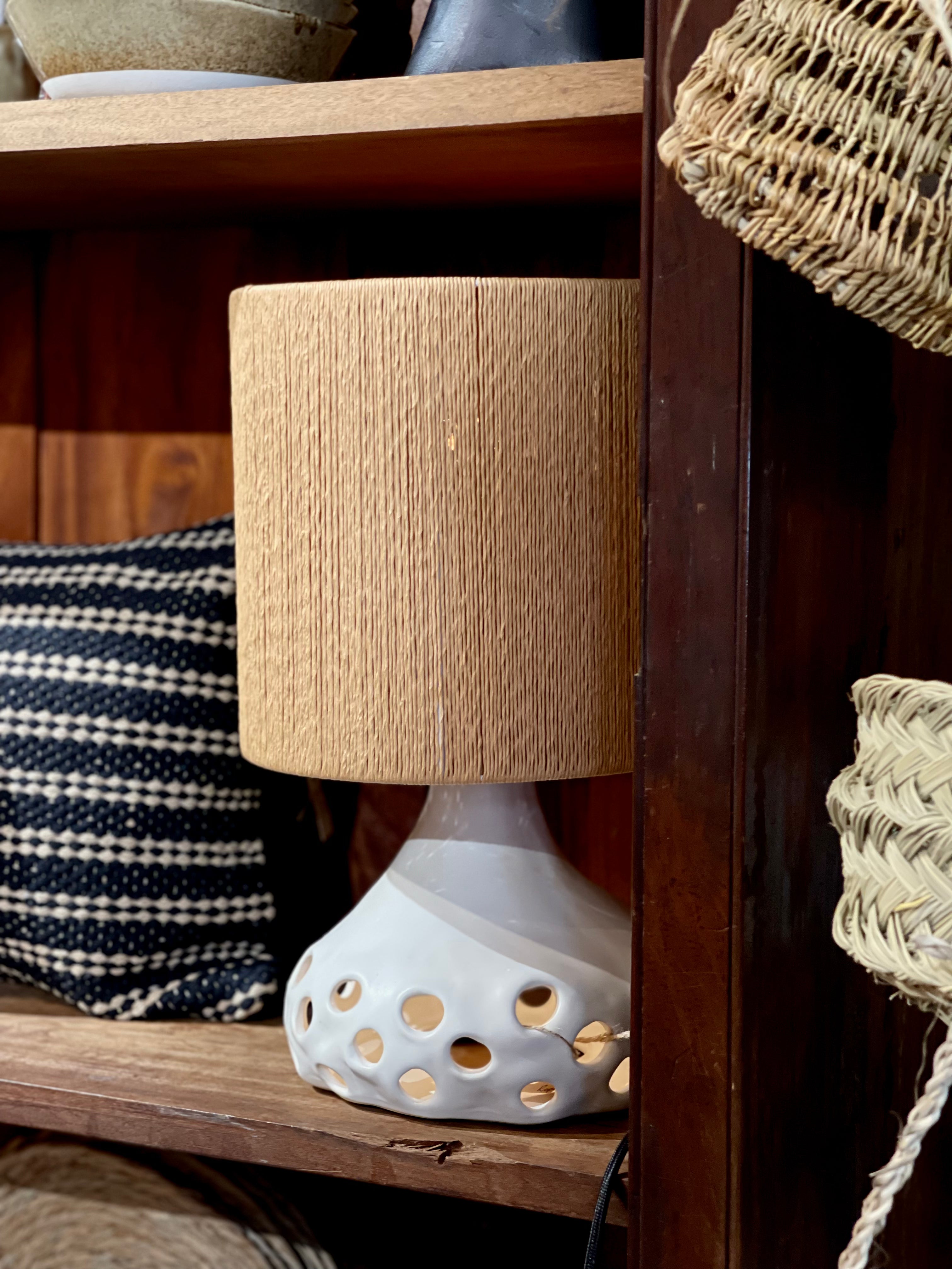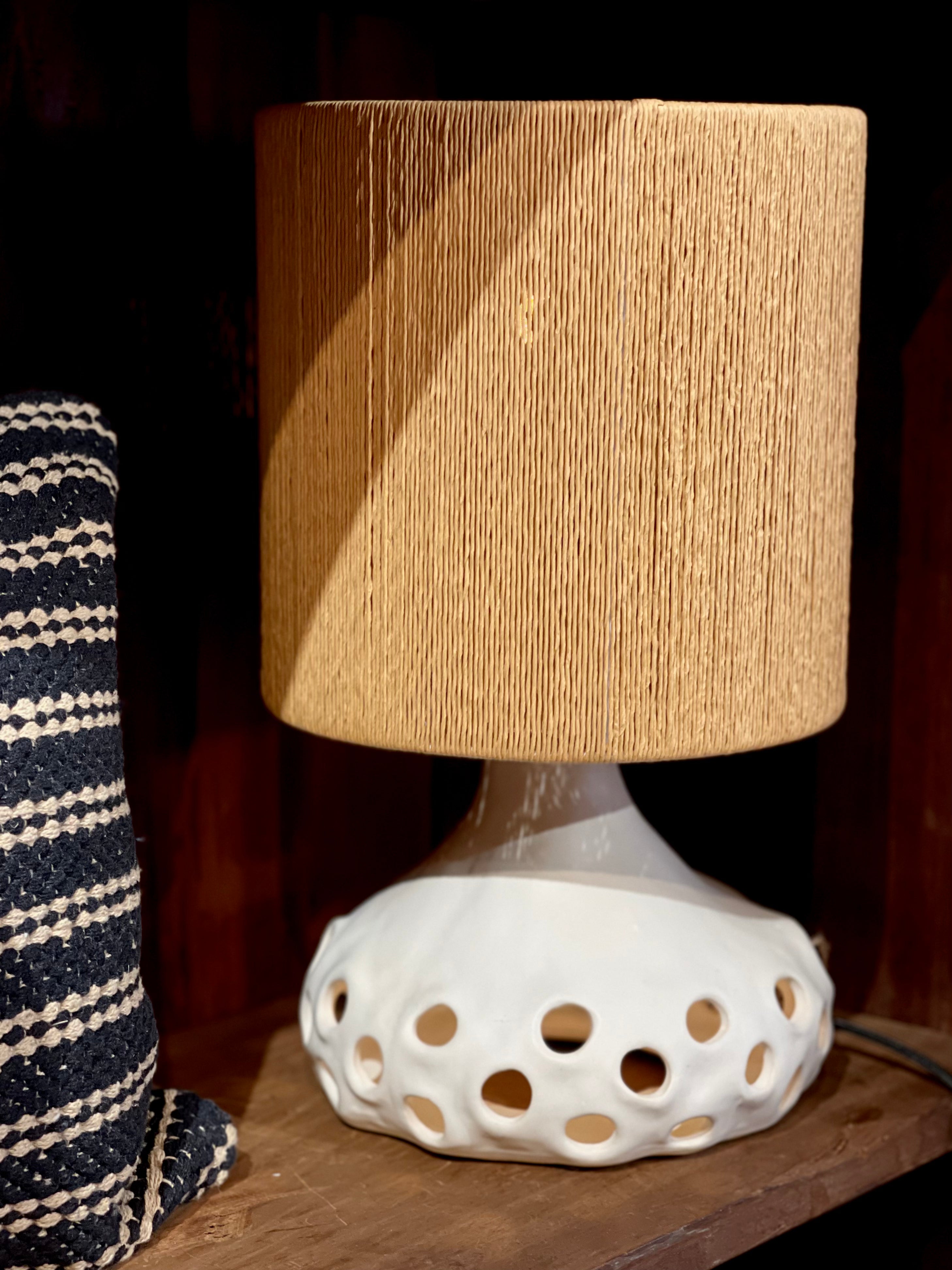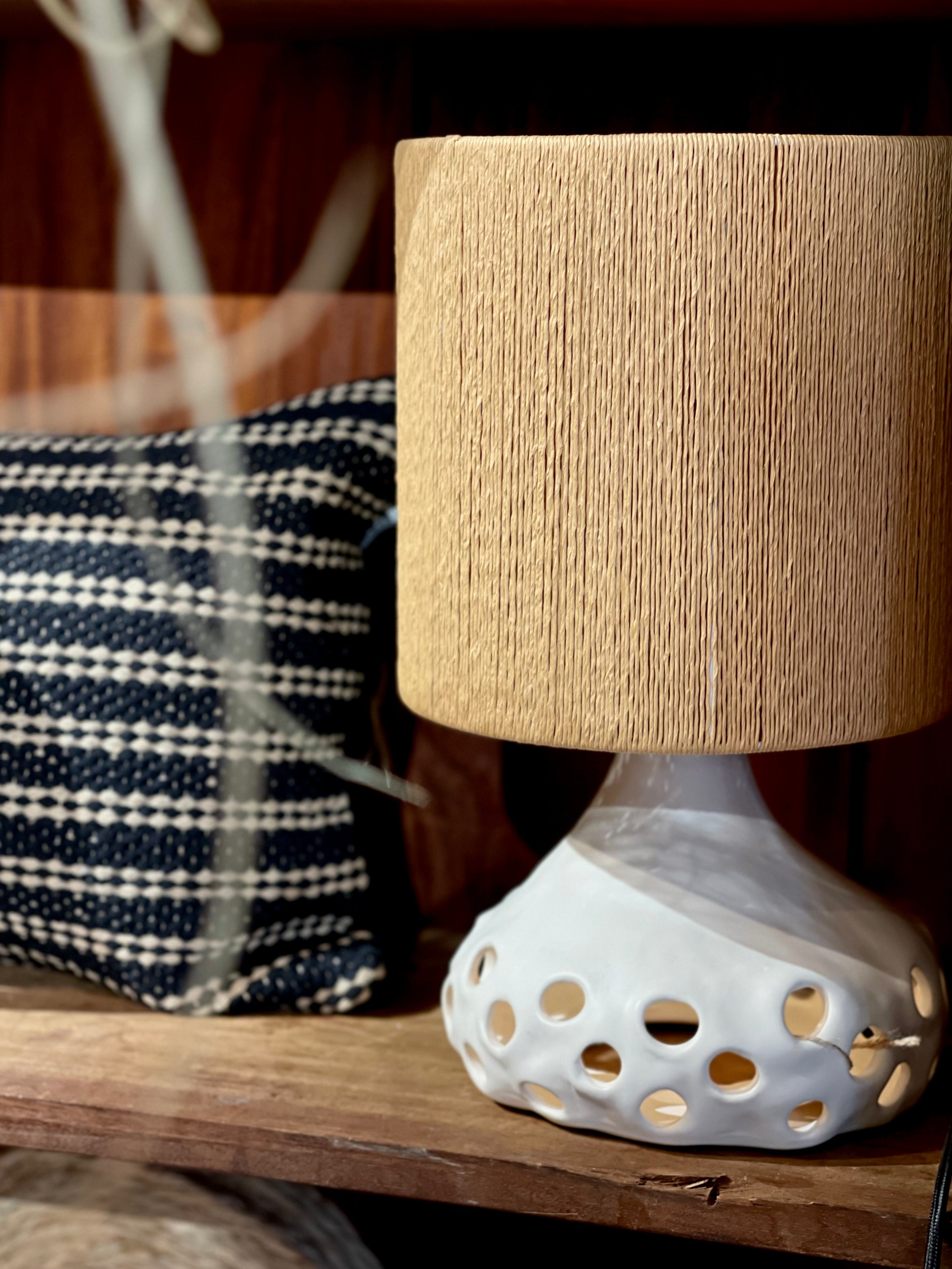 Deze unieke tafellamp valt op door zijn organisch gevormde keramieken voet met speelse ronde uitsparingen. Zowel in de voet als in de met fijn touw omhulde kap bevindt zich een lichtbron, wat zorgt voor een warm en sfeervol lichteffect in elke ruimte.