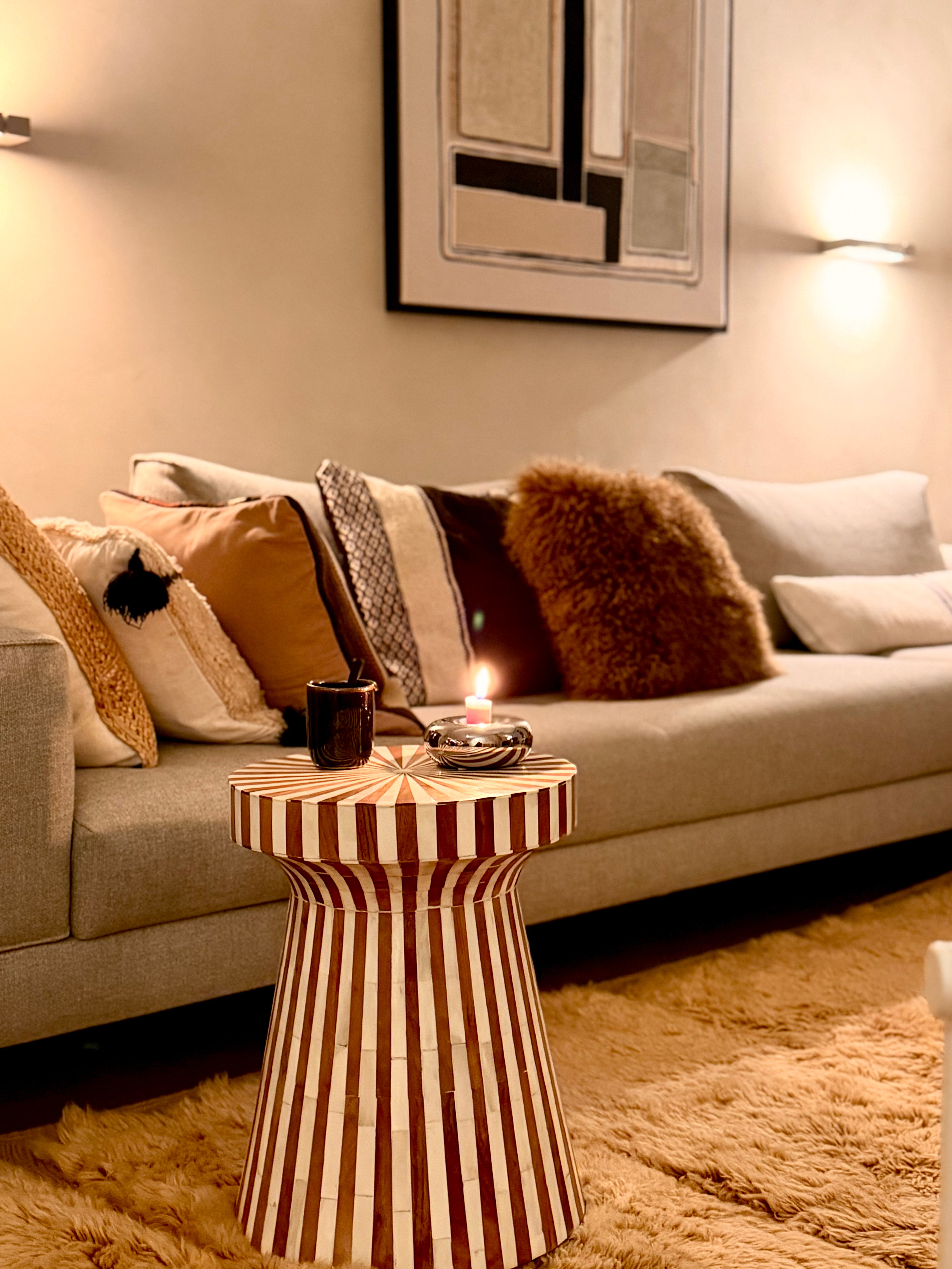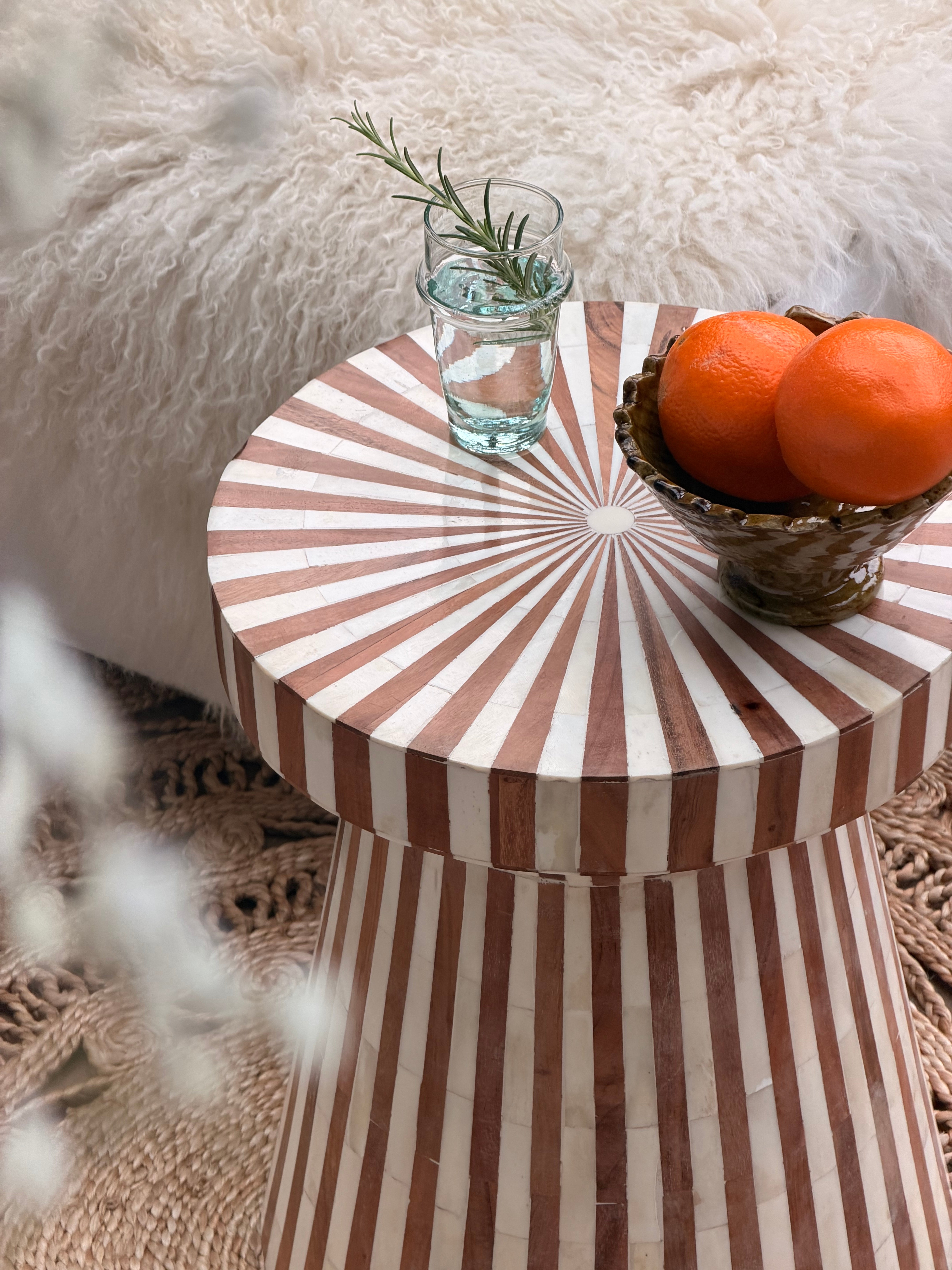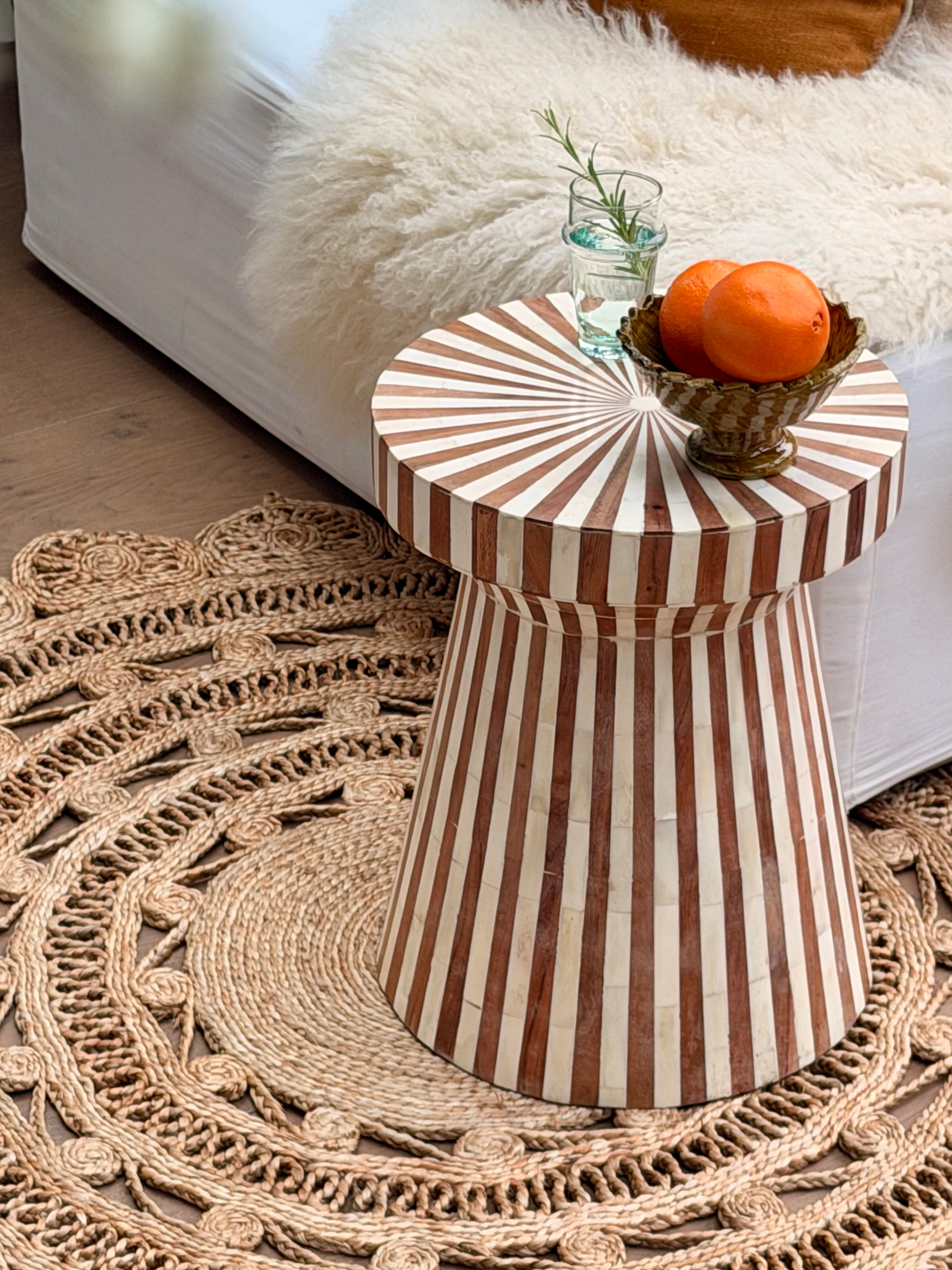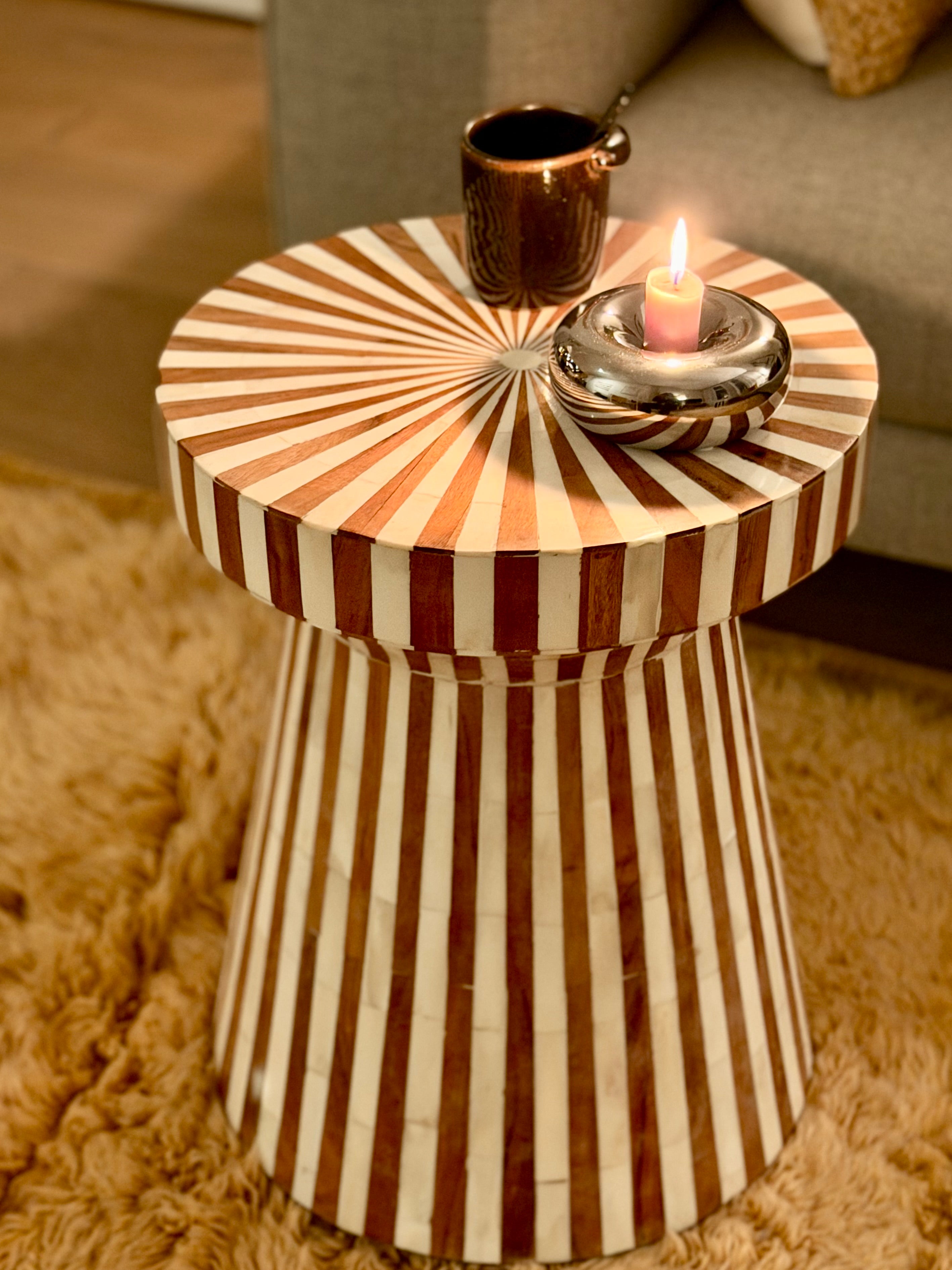 Een uniek, handgemaakt bijzettafeltje met een ingelegd patroon van hout en bone. De grafische tekening zorgt voor een luxe uitstraling en maakt dit meubelstuk tot een echte eyecatcher. Ambachtelijk vervaardigd in India.