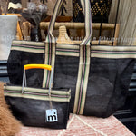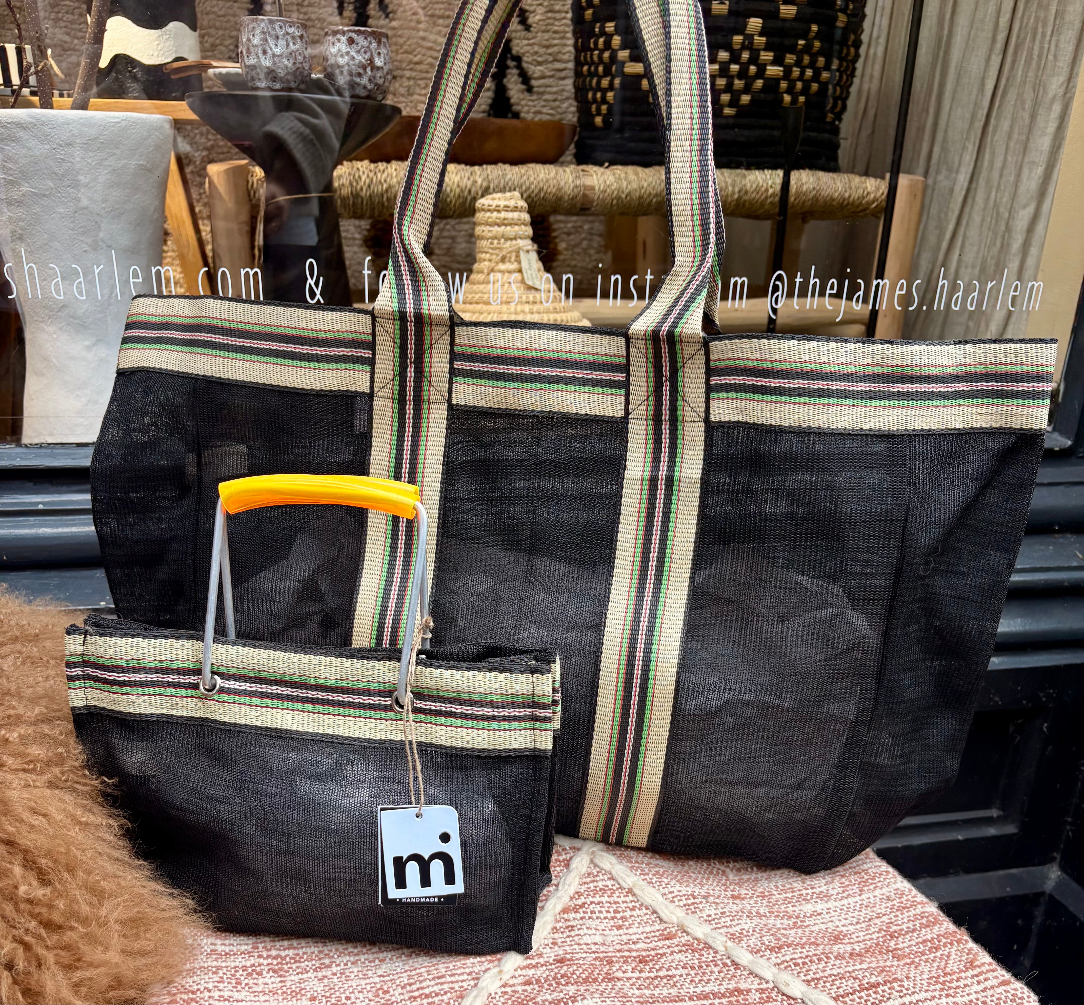 Deze prachtige handgemaakte shoppers combineren functionaliteit met een uniek design. Gemaakt van stevig geweven materiaal in zwart met subtiele strepen in neutrale tinten, zijn ze ideaal voor dagelijks gebruik. De grote shopper biedt volop ruimte voor boodschappen, strandspullen of een dagje uit, terwijl de kleinere variant met een handige handgreep perfect is voor kleinere essentials.