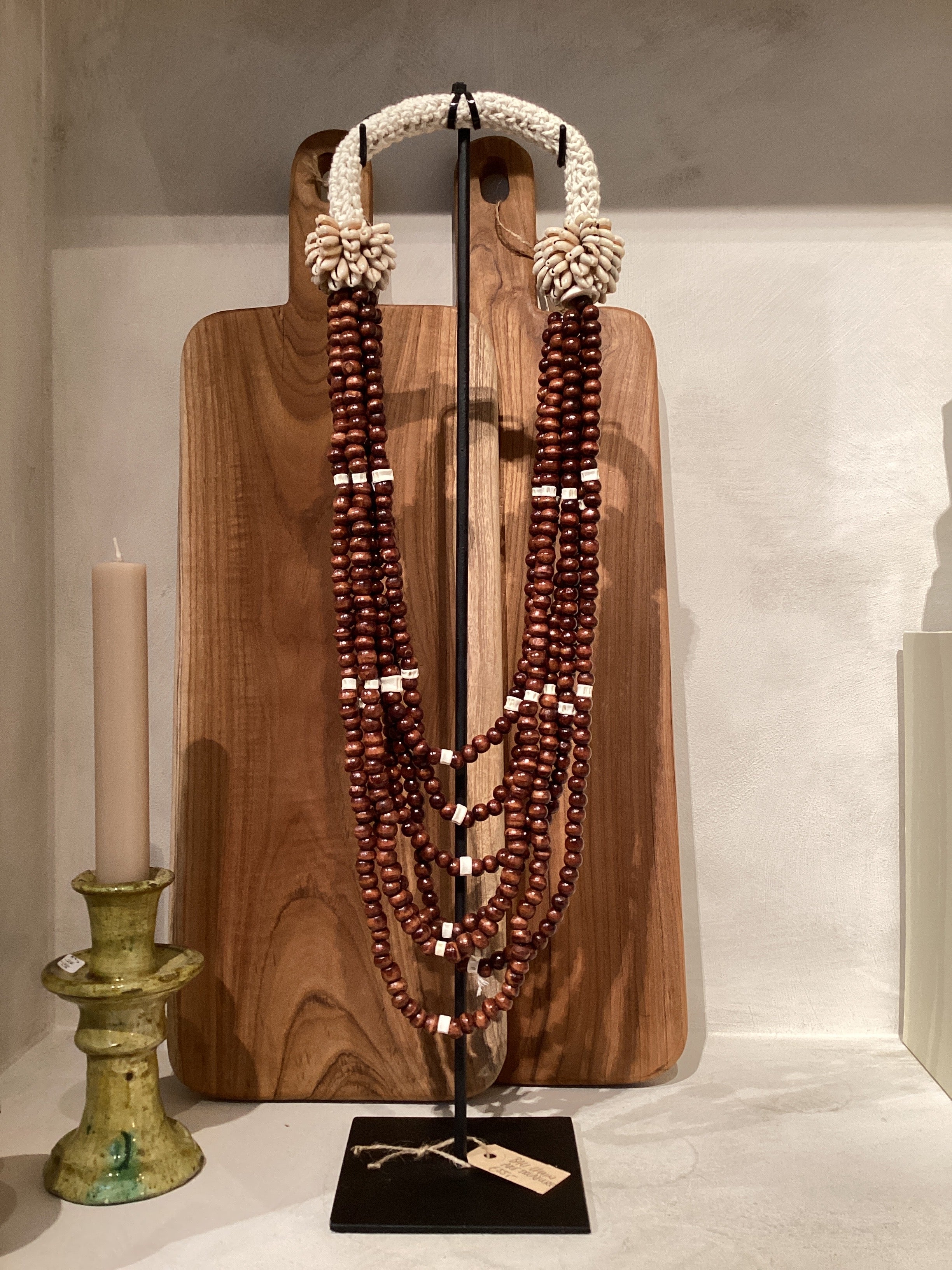Deze Balinese ketting is een handgemaakt sieraad met meerdere strengen bruine kralen, afgewisseld met witte accenten. De ketting is afgewerkt met een gevlochten sluiting in een natuurlijke tint, wat een authentieke en ambachtelijke uitstraling geeft. Door de volle lengte en de rijke lagen is het een opvallend statementstuk dat zowel als decoratie of als mode-accessoire gedragen kan worden.