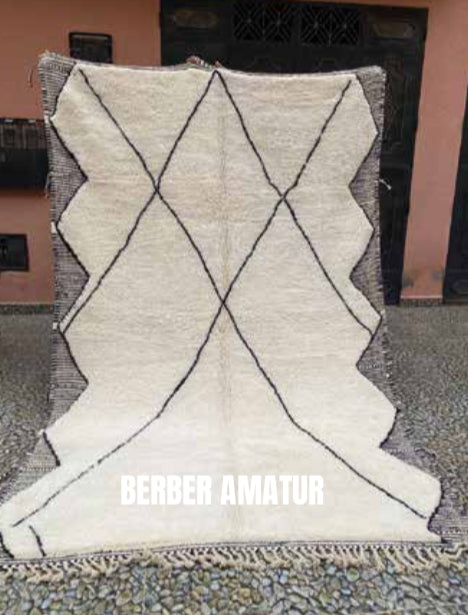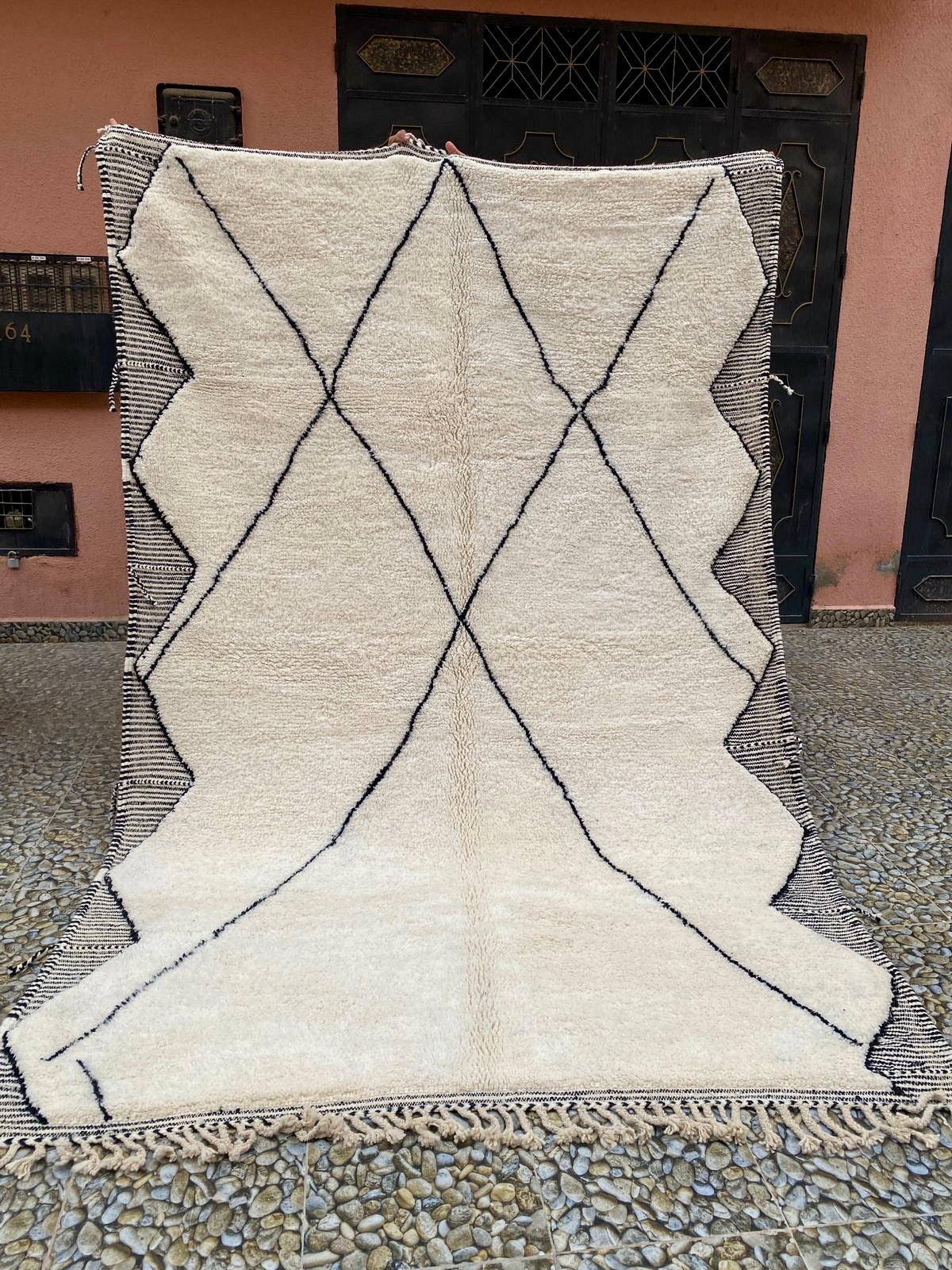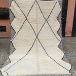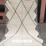 Breng warmte en karakter in je interieur met dit prachtige, handgemaakte kleed uit Marokko. Gemaakt van 100% wol in warm wit met grafisch zwarte accenten.