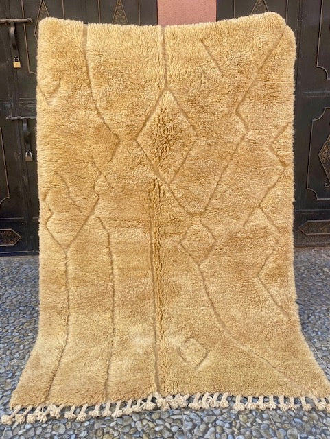 Breng warmte en karakter in je interieur met dit prachtige, handgemaakte kleed uit Marokko. Gemaakt van 100% wol in zachte aardetinten, met een elegante zandkleurige franje-afwerking.