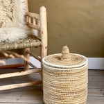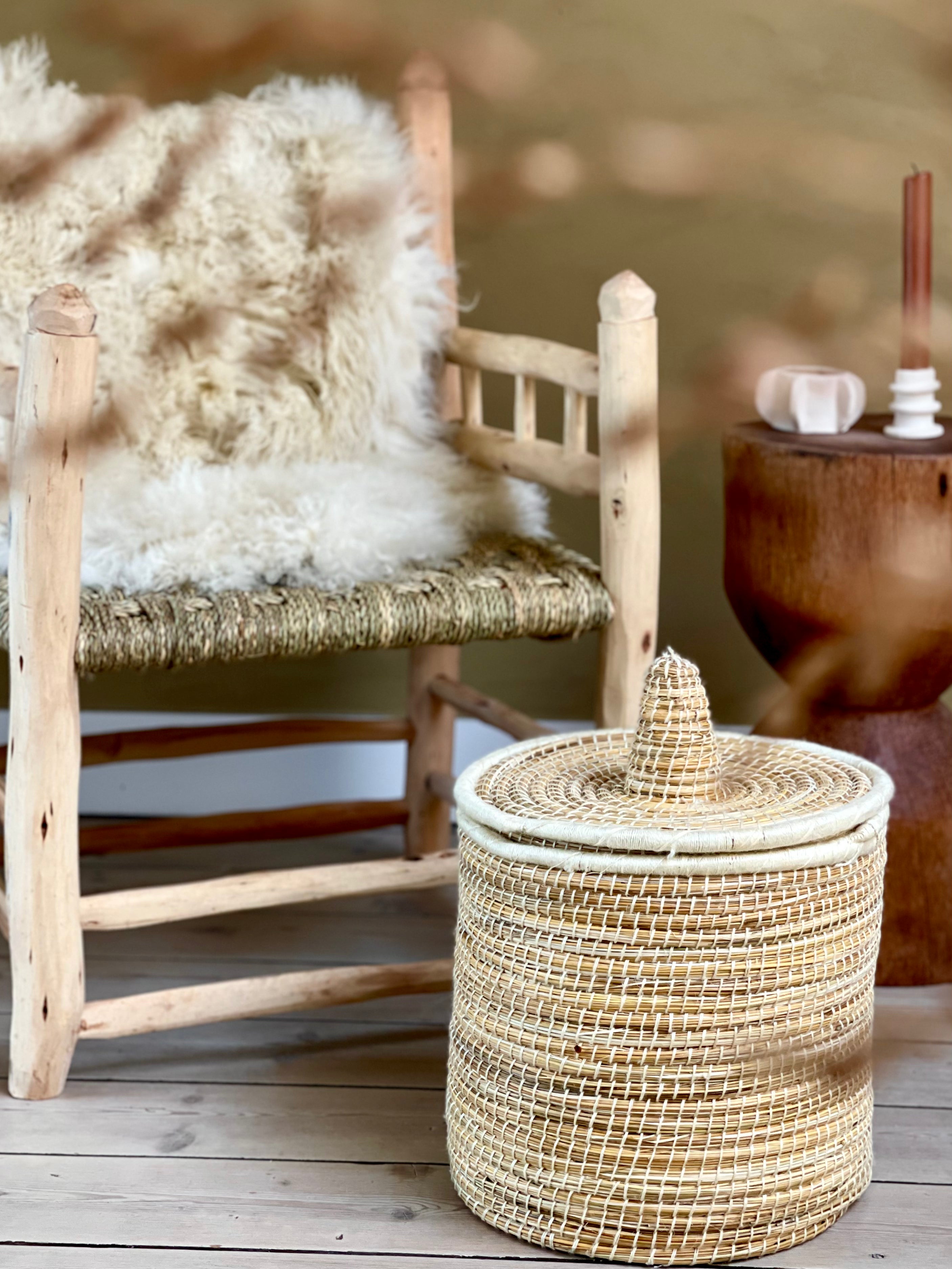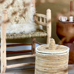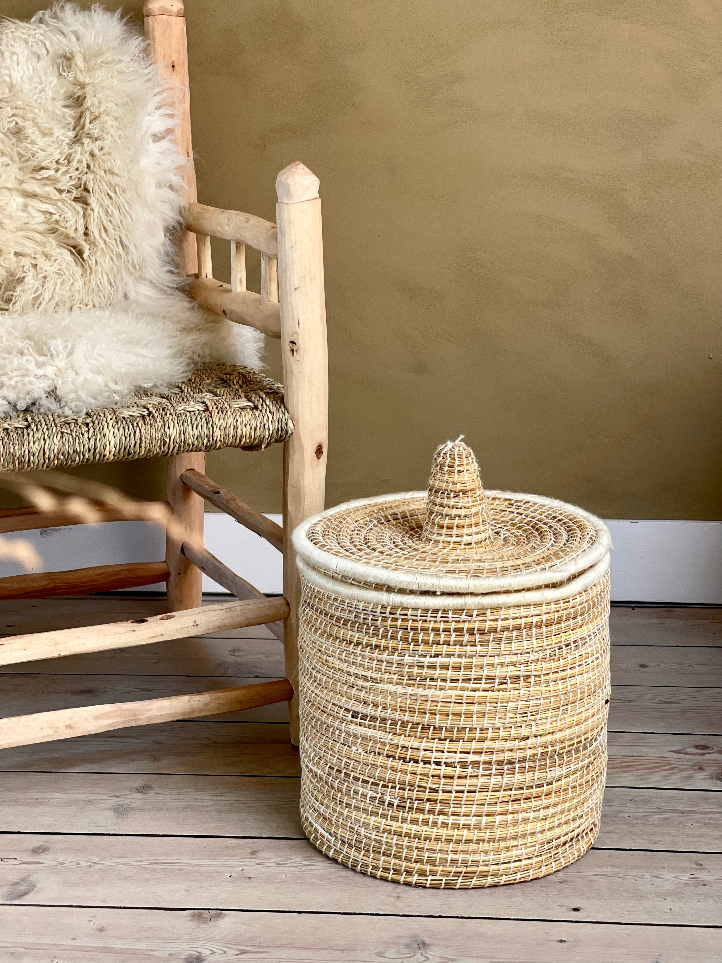 Deze authentieke Marokkaanse mand is met de hand gevlochten van natuurlijk zeegras en afgewerkt met kleurrijke wol. De mand is voorzien van een deksel, wat het een ideale en stijlvolle opberger maakt voor in huis.