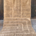 Dit bijzondere, handgemaakte kleed is medium polig en geweven in een bijzonder geometrisch patrion. Het kleed is uitgevoerd in zachte taupe tinten en afgewerkt met zandkleurige franjes.