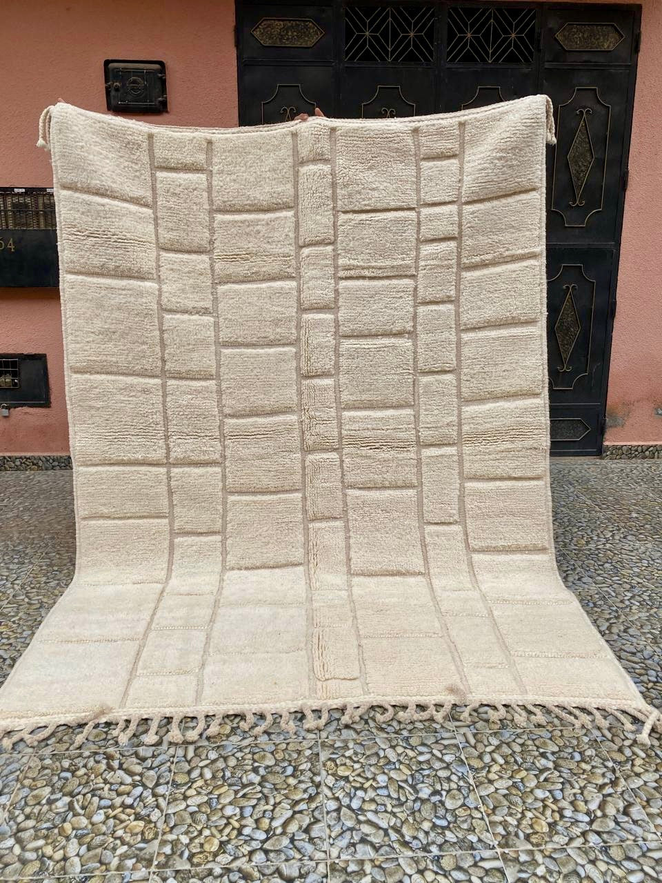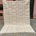 Breng warmte en karakter in je interieur met dit prachtige, handgemaakte kleed uit Marokko. Gemaakt van 100% wol in warm wit , met een uitzonderlijk bijzonder en sereen geometrisch patroon.