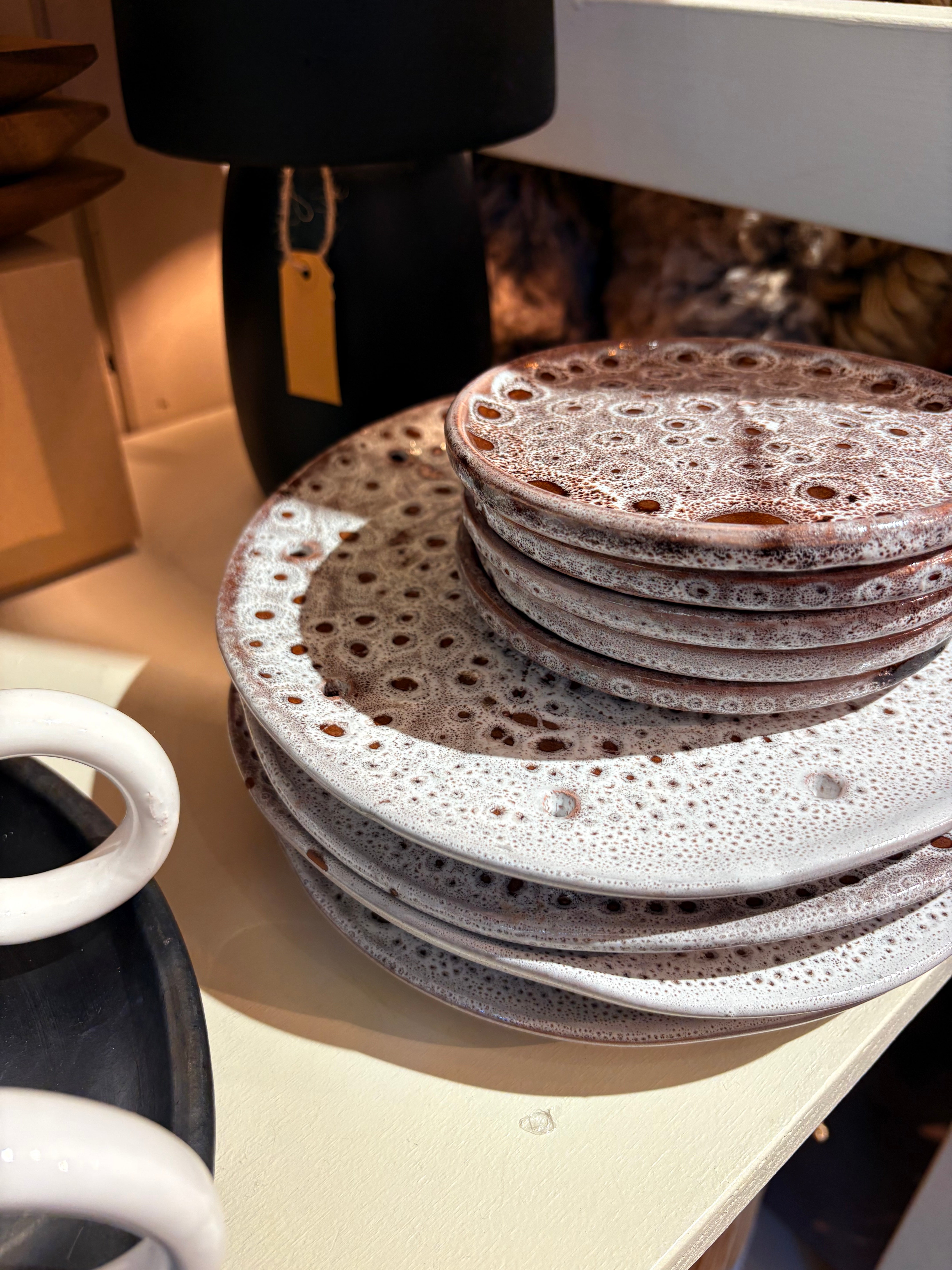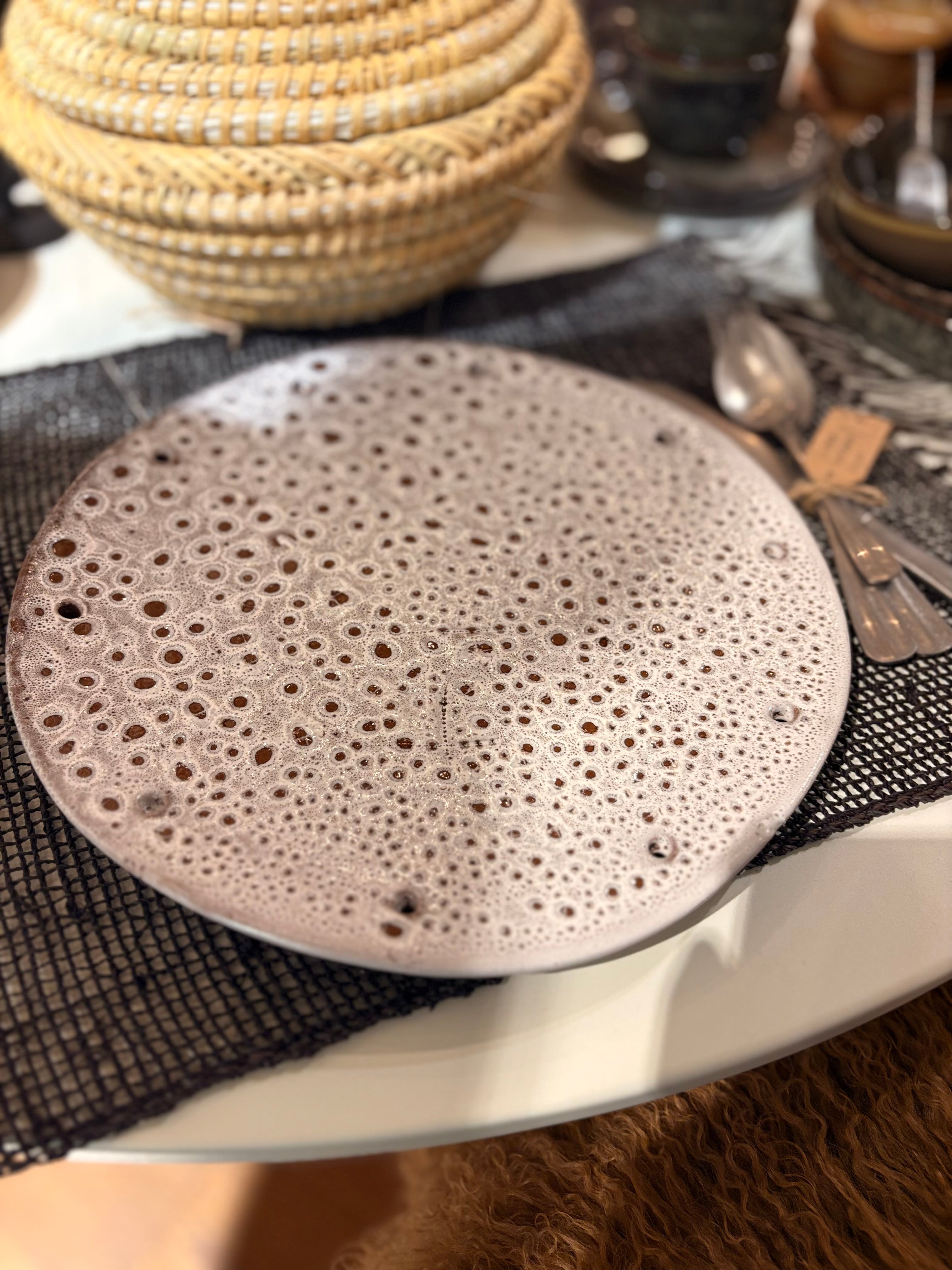 Dit handgemaakte keramieken bord heeft een unieke, speelse uitstraling dankzij het bijzondere gaatjespatroon dat lijkt op een natuurlijke textuur. Elk stuk is met zorg vervaardigd, waardoor geen enkel bord hetzelfde is. Perfect om jouw tafel een artistieke en ambachtelijke touch te geven!
