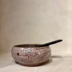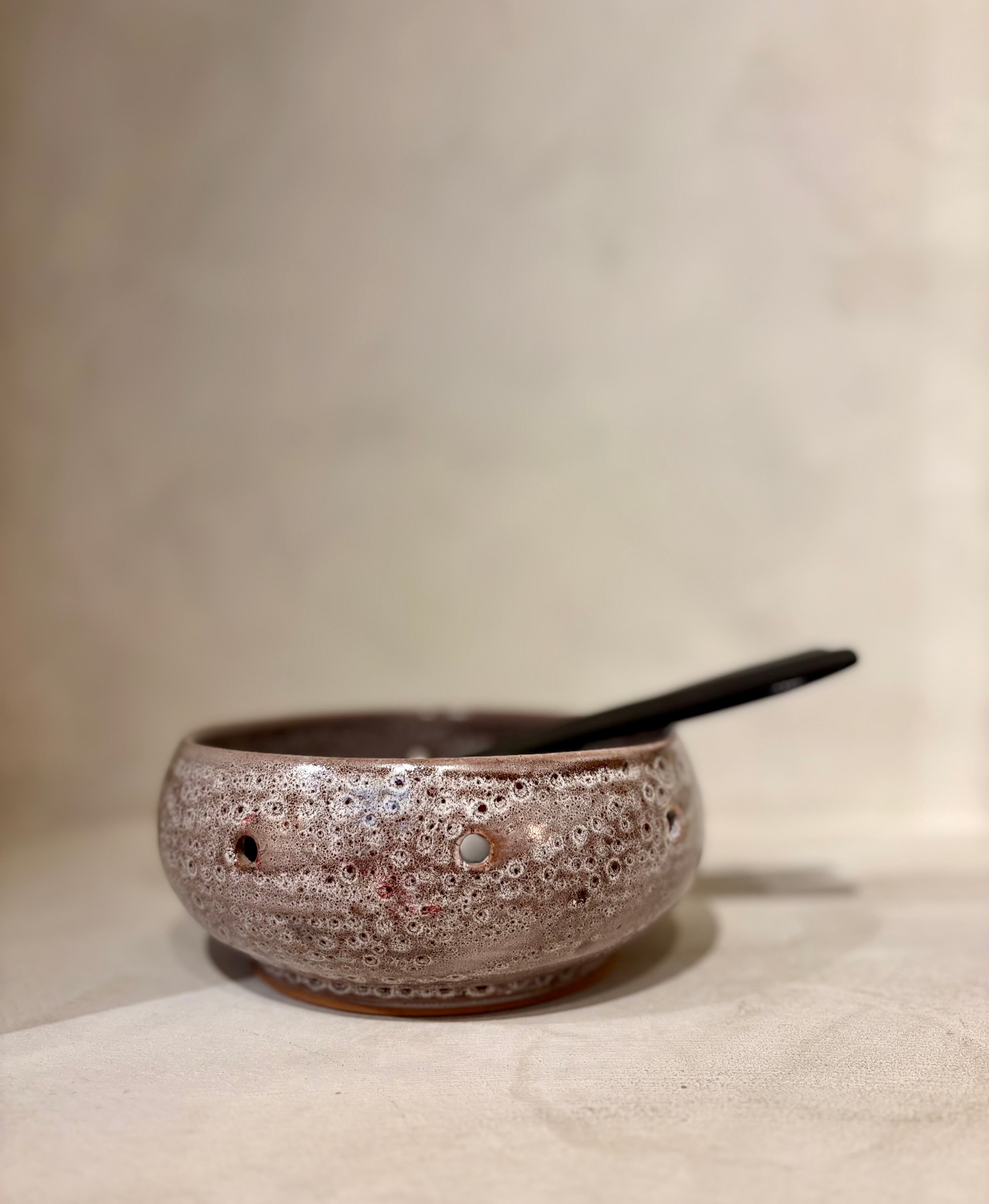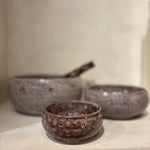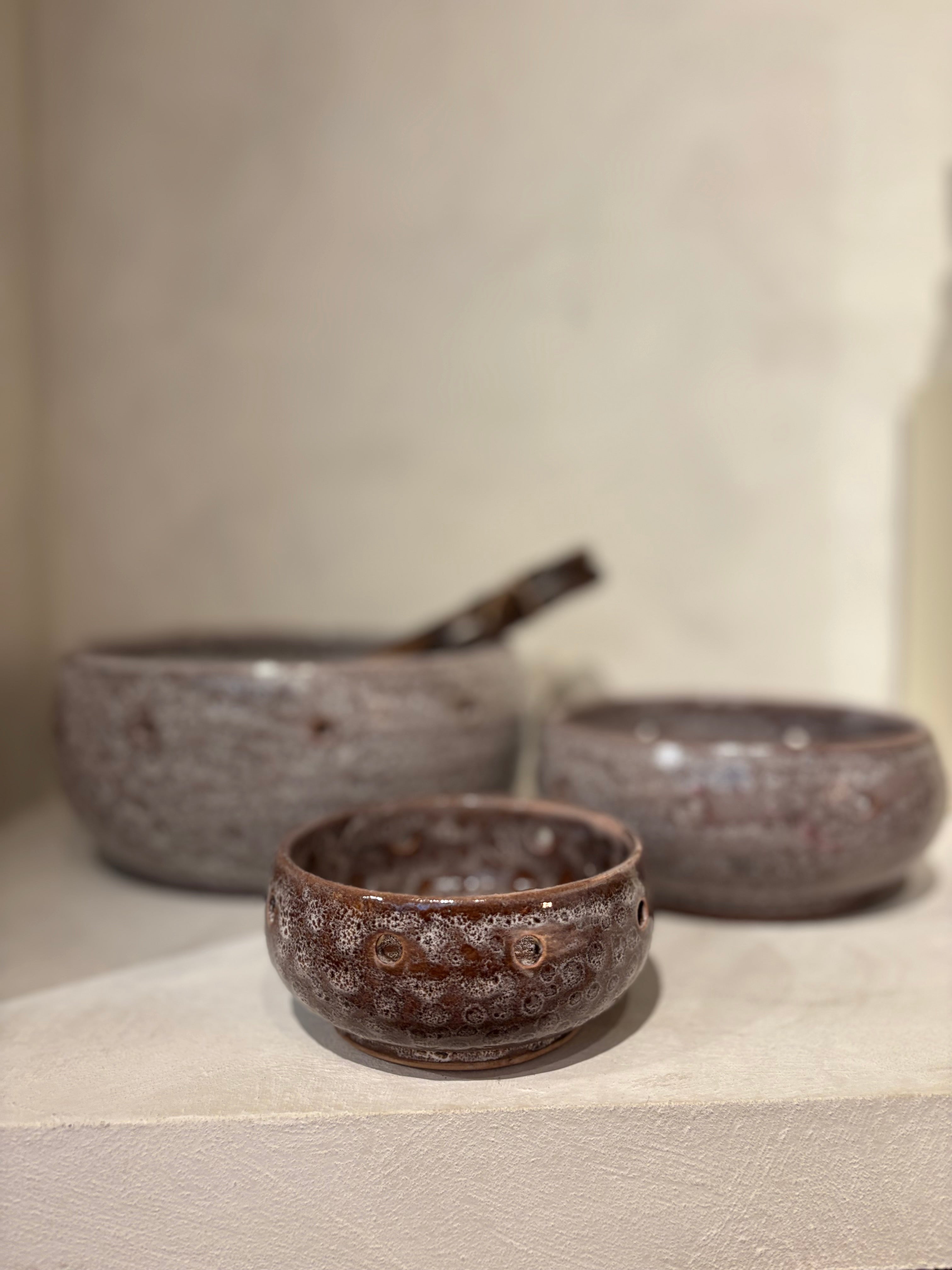 De kleinere saladebowl is gemaakt van geglazuurd keramiek en heeft een warme, ambachtelijke uitstraling. Het bijzondere patroon van bruine en witte tinten met speelse bubbels maakt elk stuk uniek – perfect om kleinere gerechten of een frisse salade stijlvol te serveren.