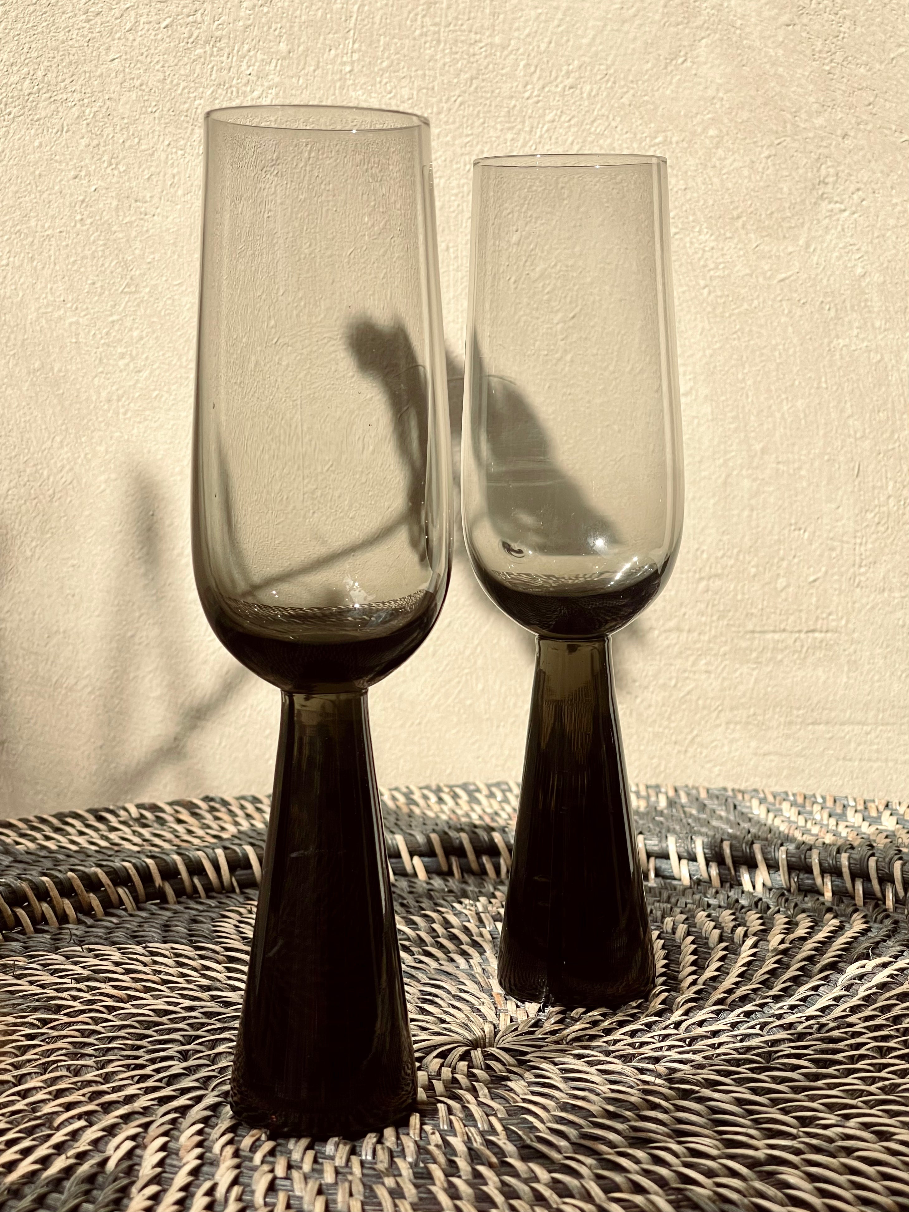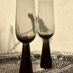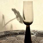 Our elegant champagne glass featuring a graceful conical base. These glasses are mouth-blown and come with a stylish smokey tint. They pair beautifully with our other smoke glassware, adding that perfect finishing touch to your table setting.