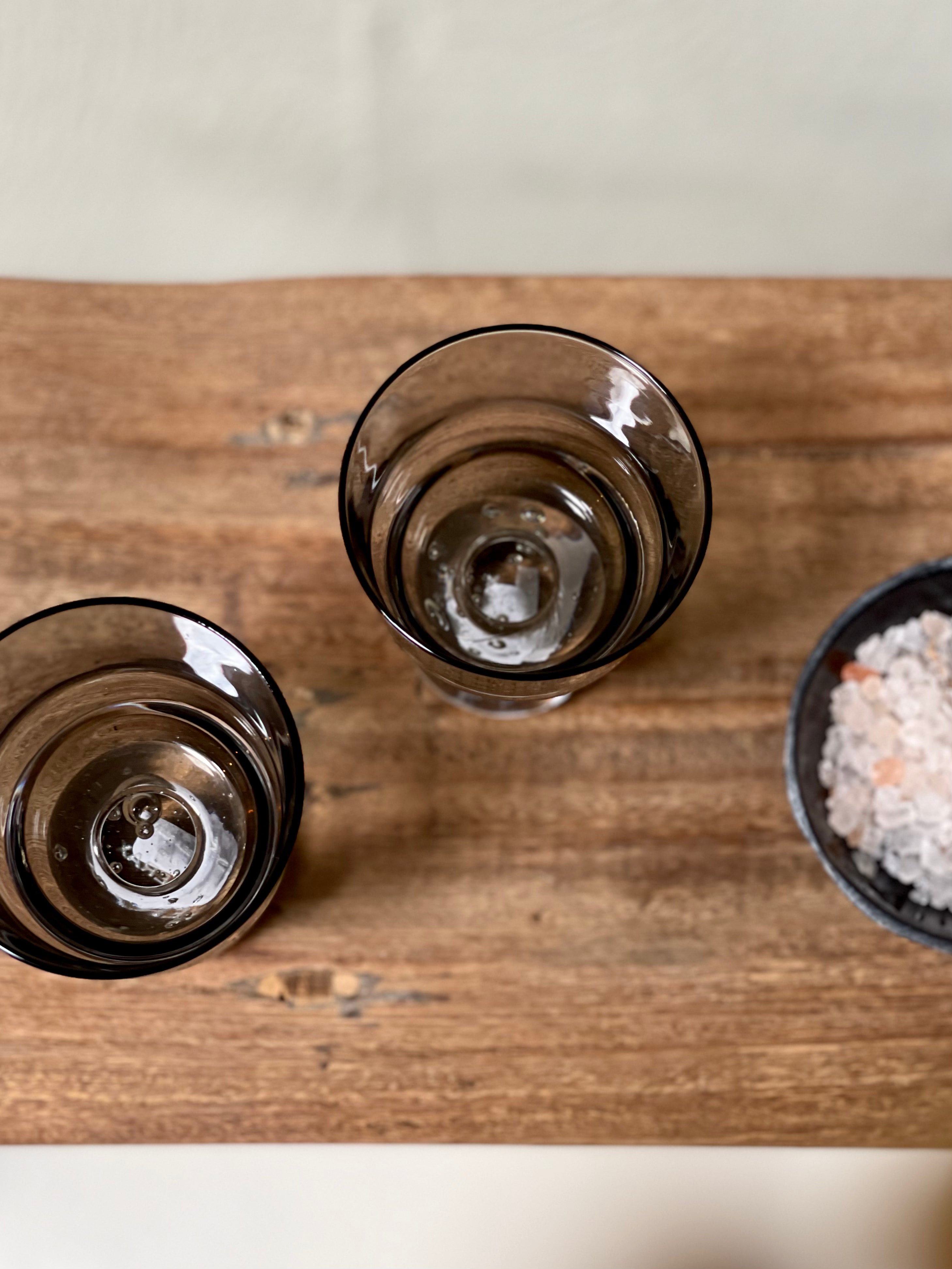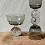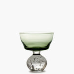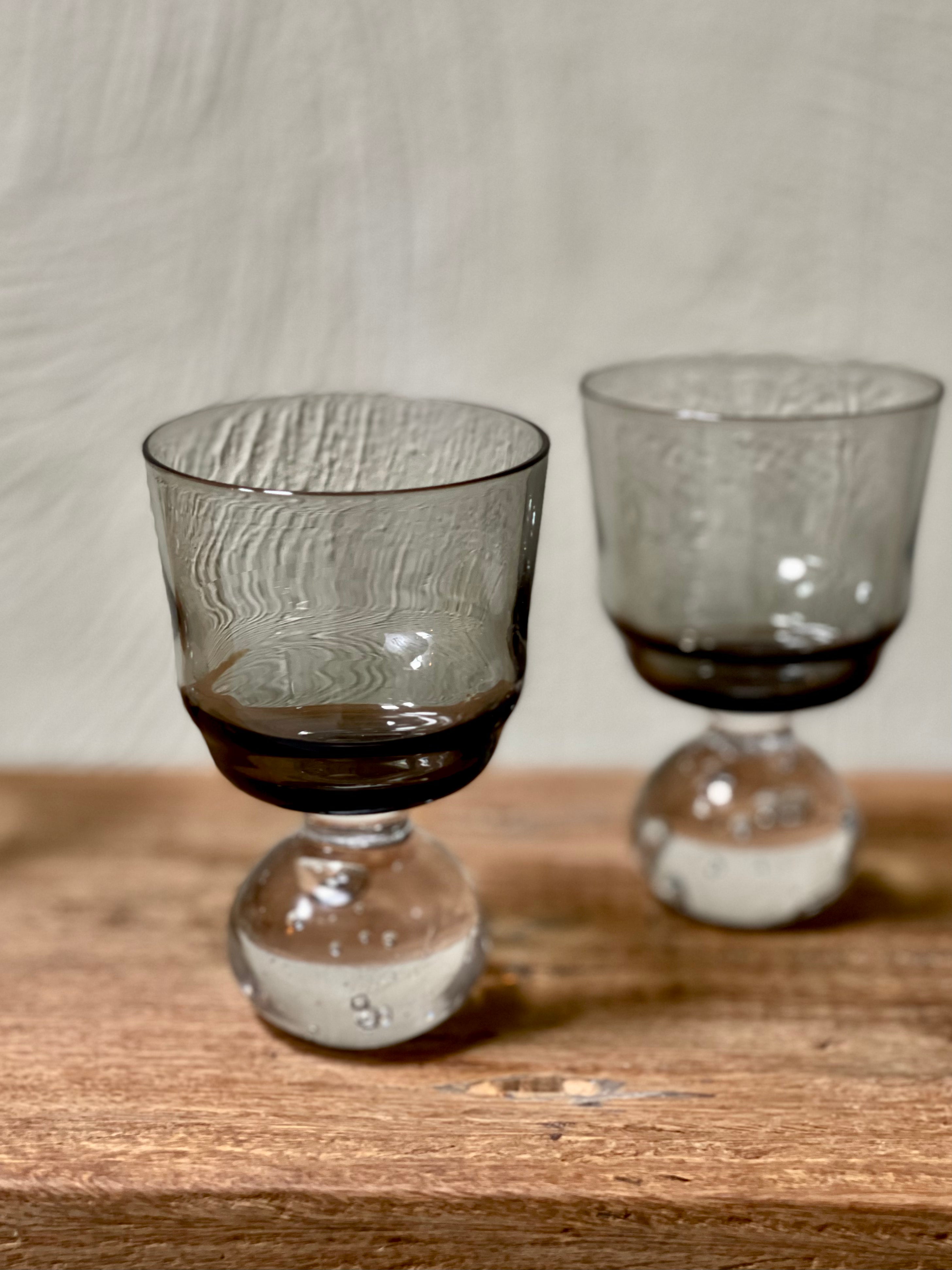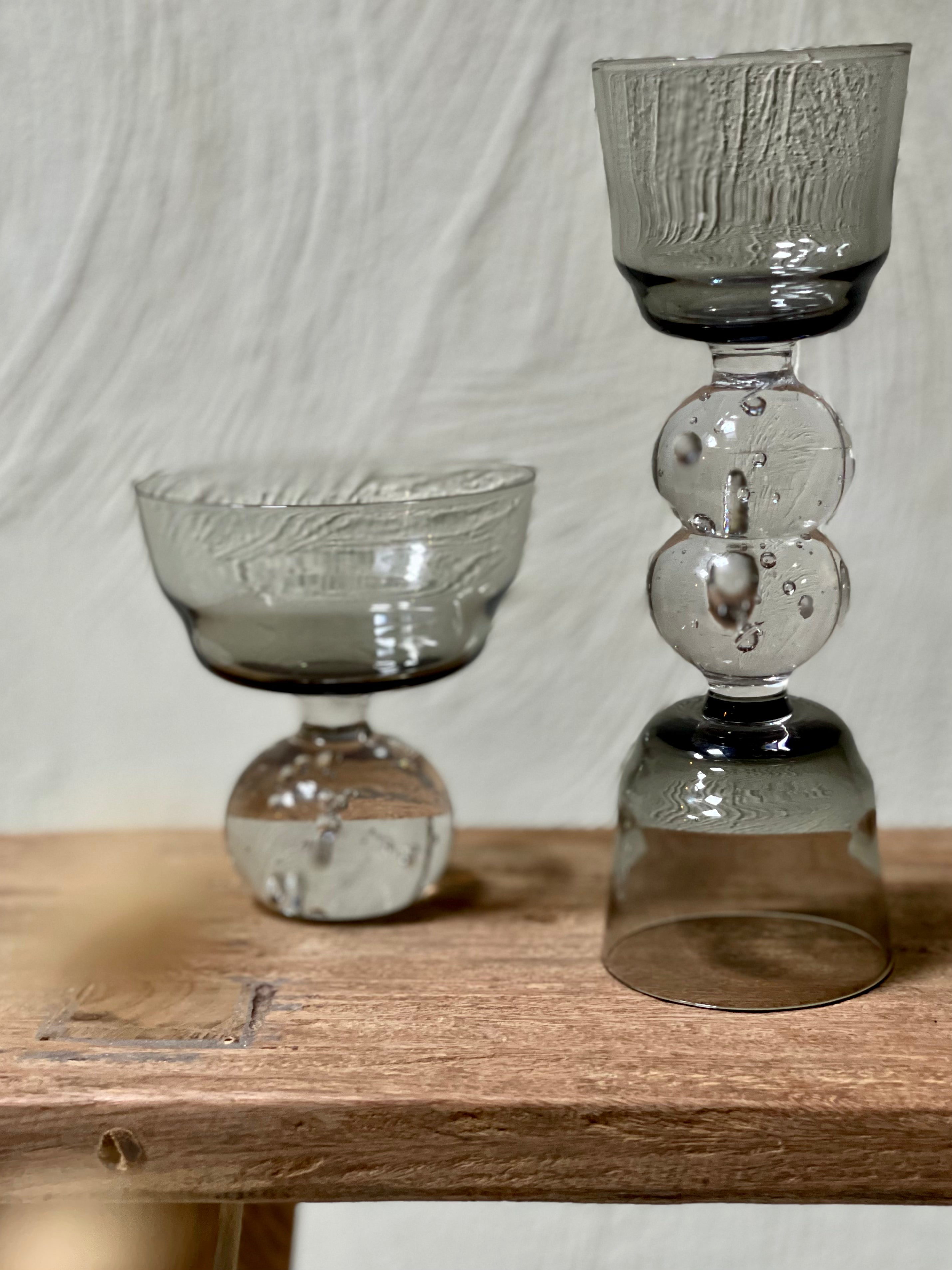 The Eternal Snow glass, resting gracefully on a spherical base. The base showcases playful air bubbles within the sphere. Its glass body has a charming smokey hue, making it a unique and elegant addition to your glassware collection.