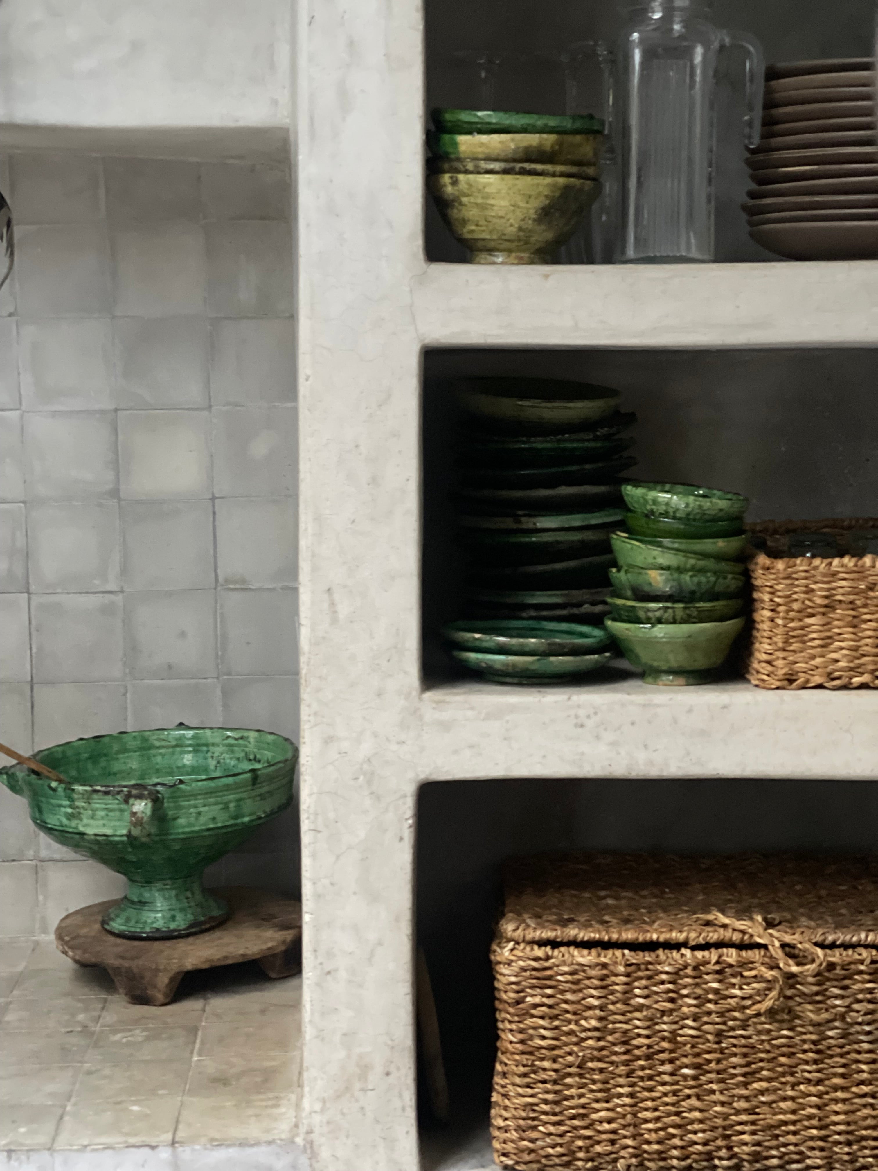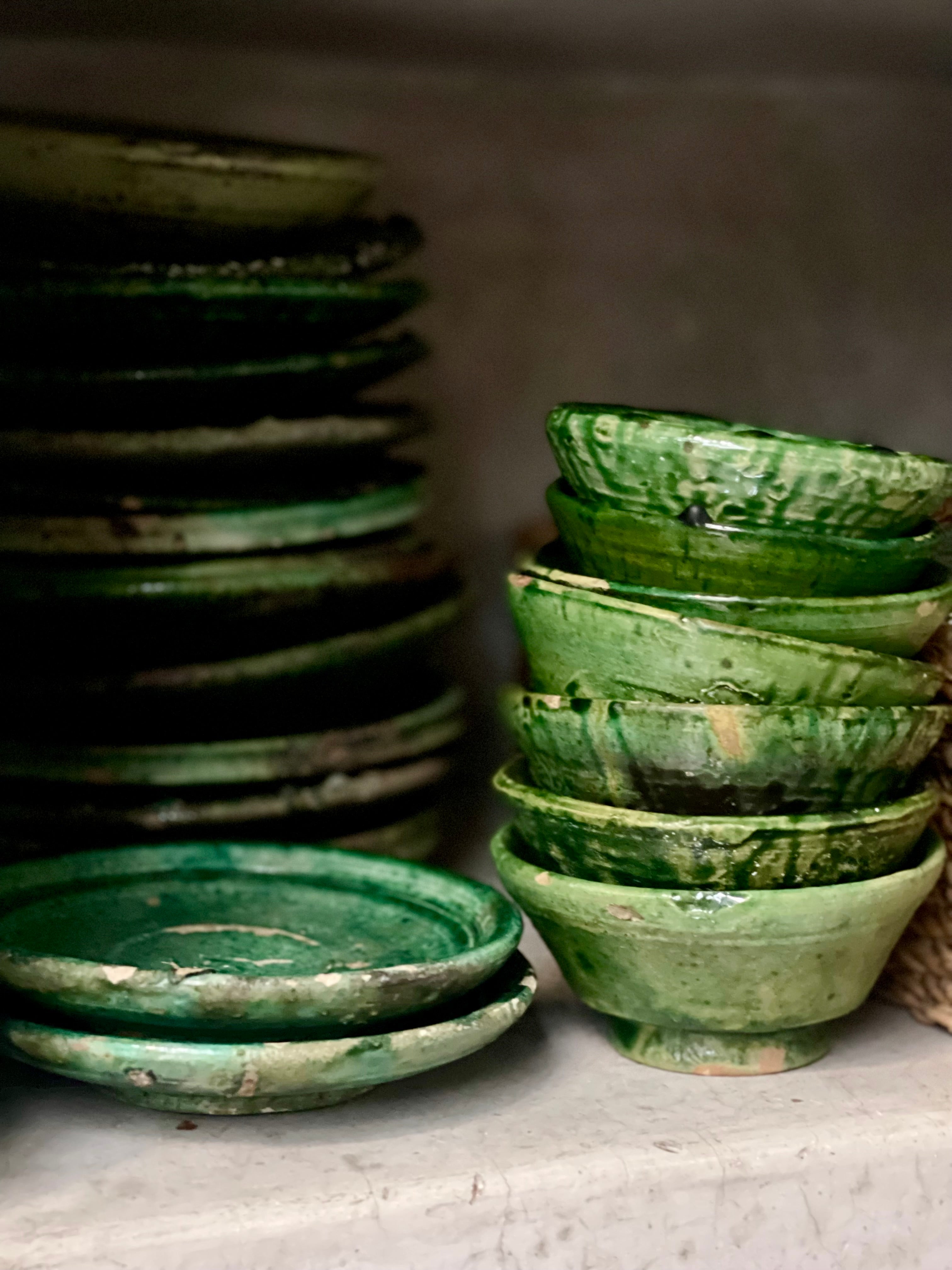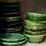 Handcrafted in the enchanting village of Tamegroute, each piece is lovingly shaped by hand, showcasing the region's distinctive moss green and oker hue. Fired using ancient techniques, these pieces emanate warmth and character.