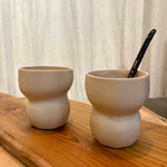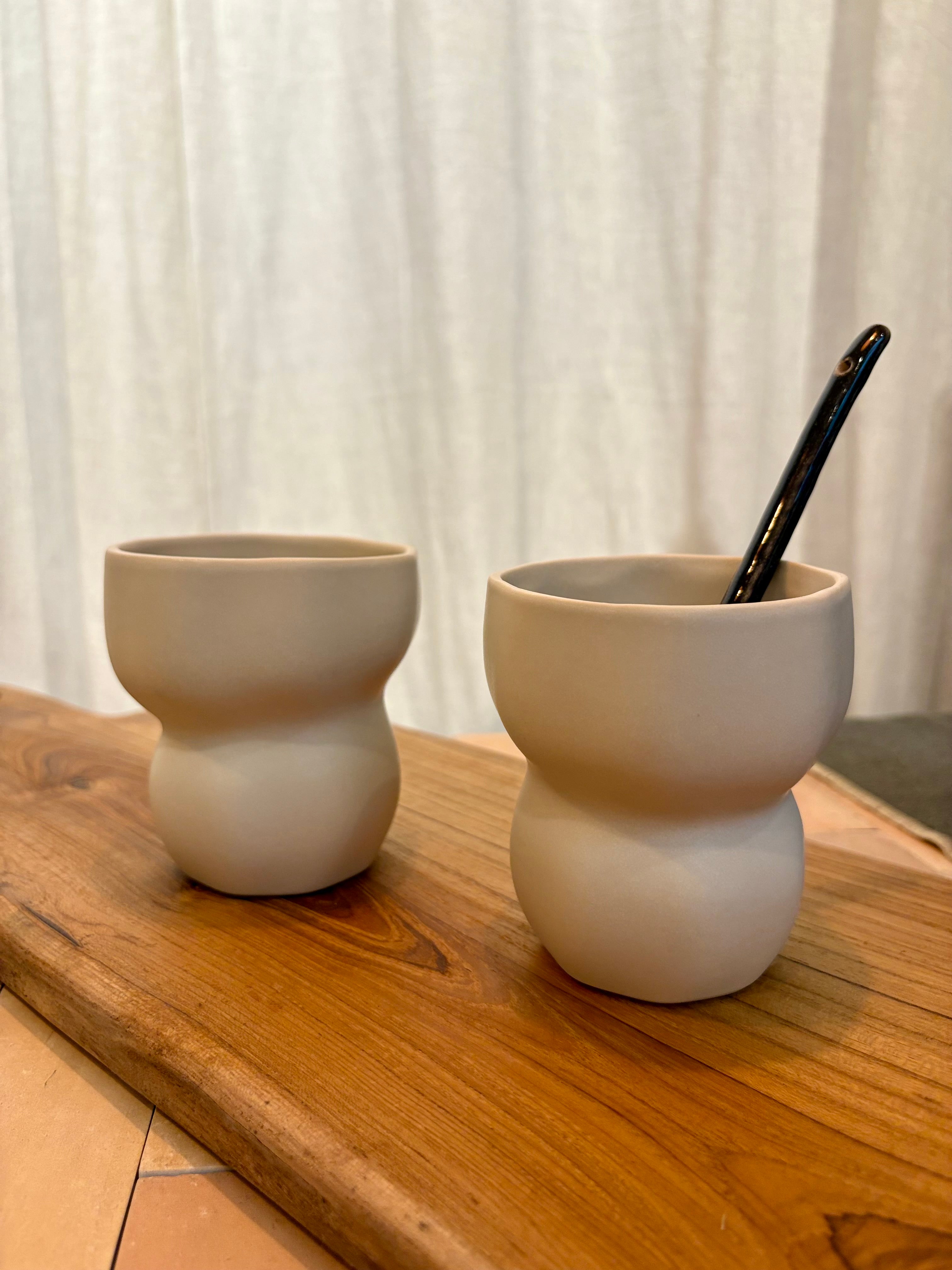 Deze kopjes hebben een speelse, organische vorm die ze een moderne en tegelijk warme uitstraling geeft. Het matte keramiek voelt natuurlijk aan en ligt prettig in de hand, terwijl de subtiele rondingen een uniek en eigenzinnig karakter toevoegen. Perfect voor een rustig koffiemoment of een gezellige thee in stijl.