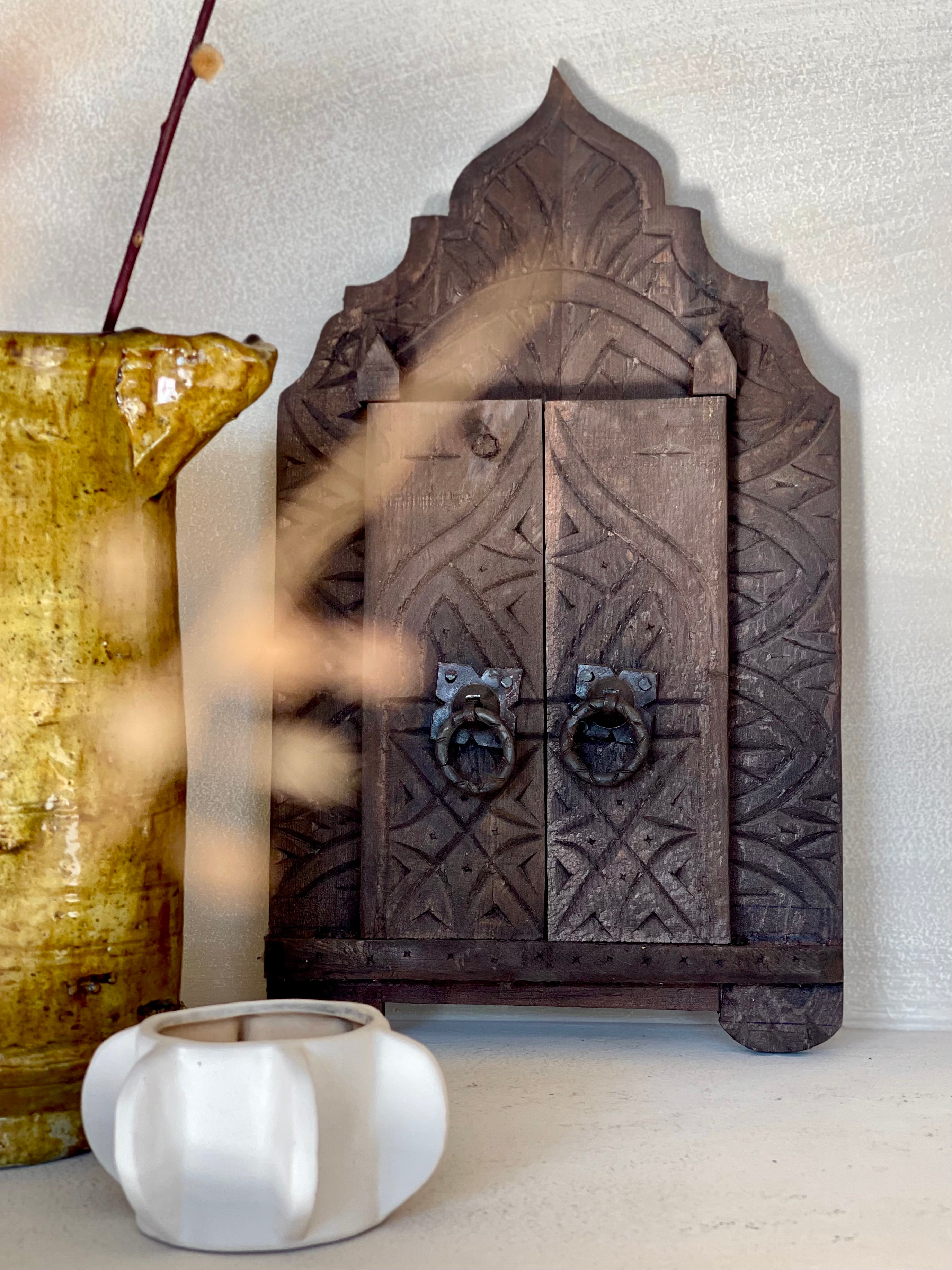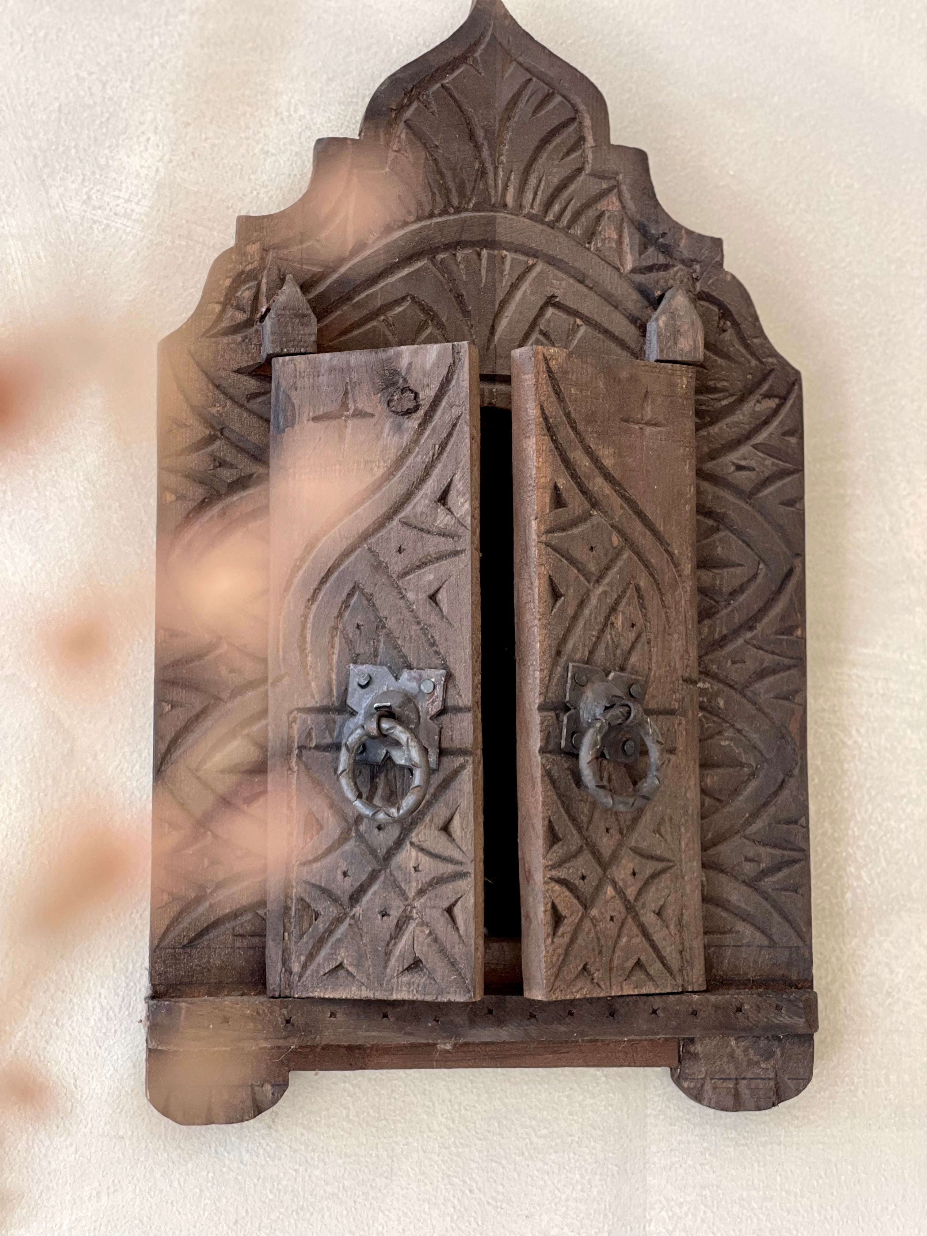 Ontdek de betovering van de Magical Mirror Aziz, een ambachtelijke Marokkaanse spiegel die traditionele elegantie combineert met mystiek en warmte. Achter de prachtige houten deurtjes van donker hout schuilt een verfijnde spiegel – een geheim dat wacht om onthuld te worden.