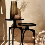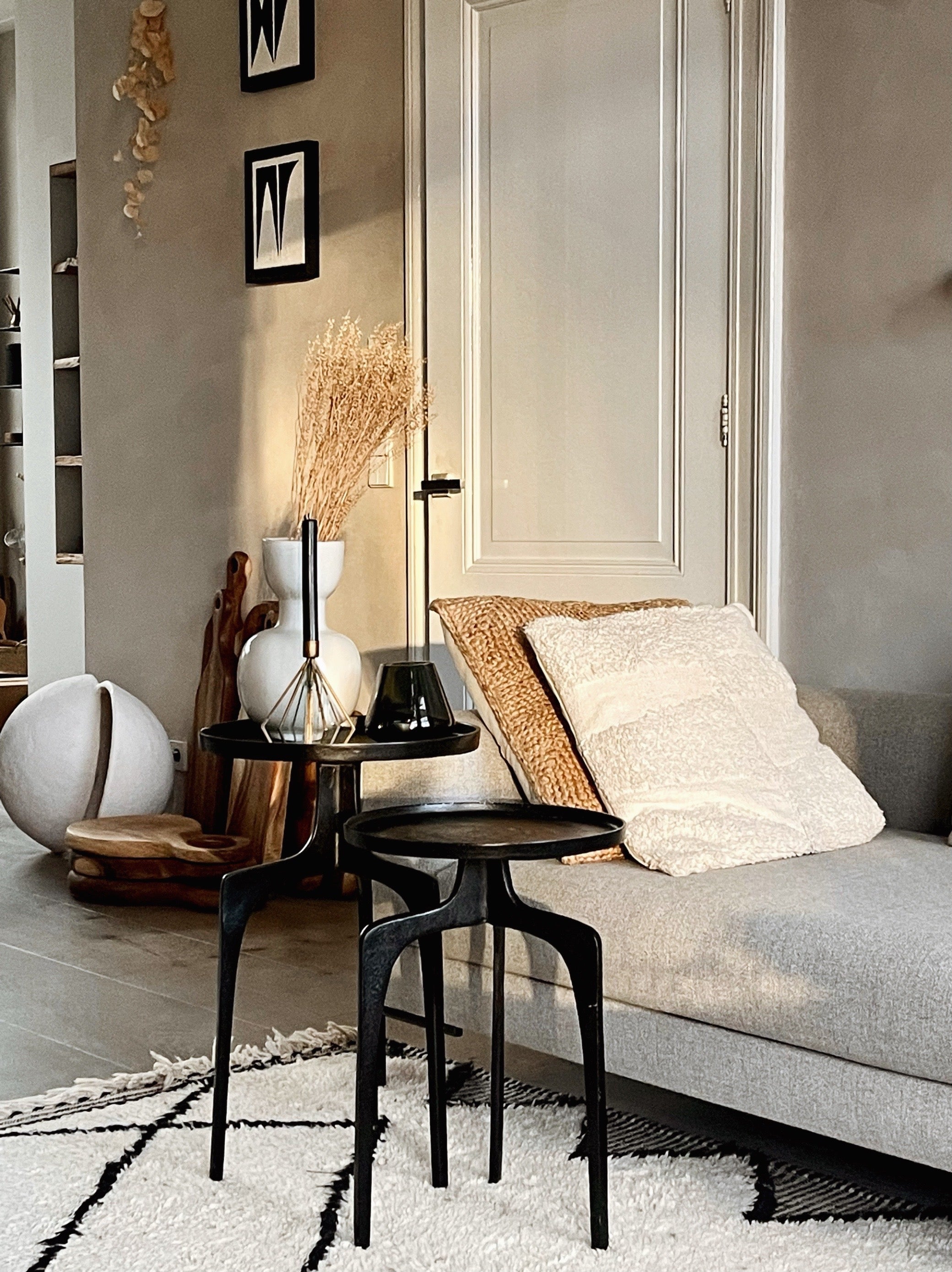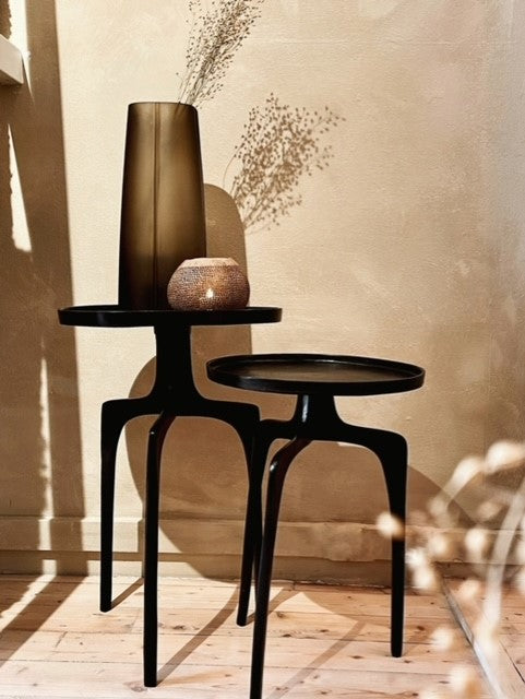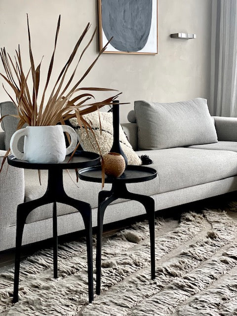 Introducing "Lean" – a set of side tables made from sleek black metal. These tables feature uniquely shaped legs inspired by a boomerang, adding a distinctive touch to your decor. Functional and ideal for placement next to a sofa or by the bed. "Lean" is sure to be an eye-catcher in any room, combining both style and functionality in a captivating way.