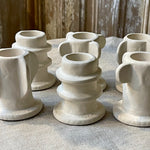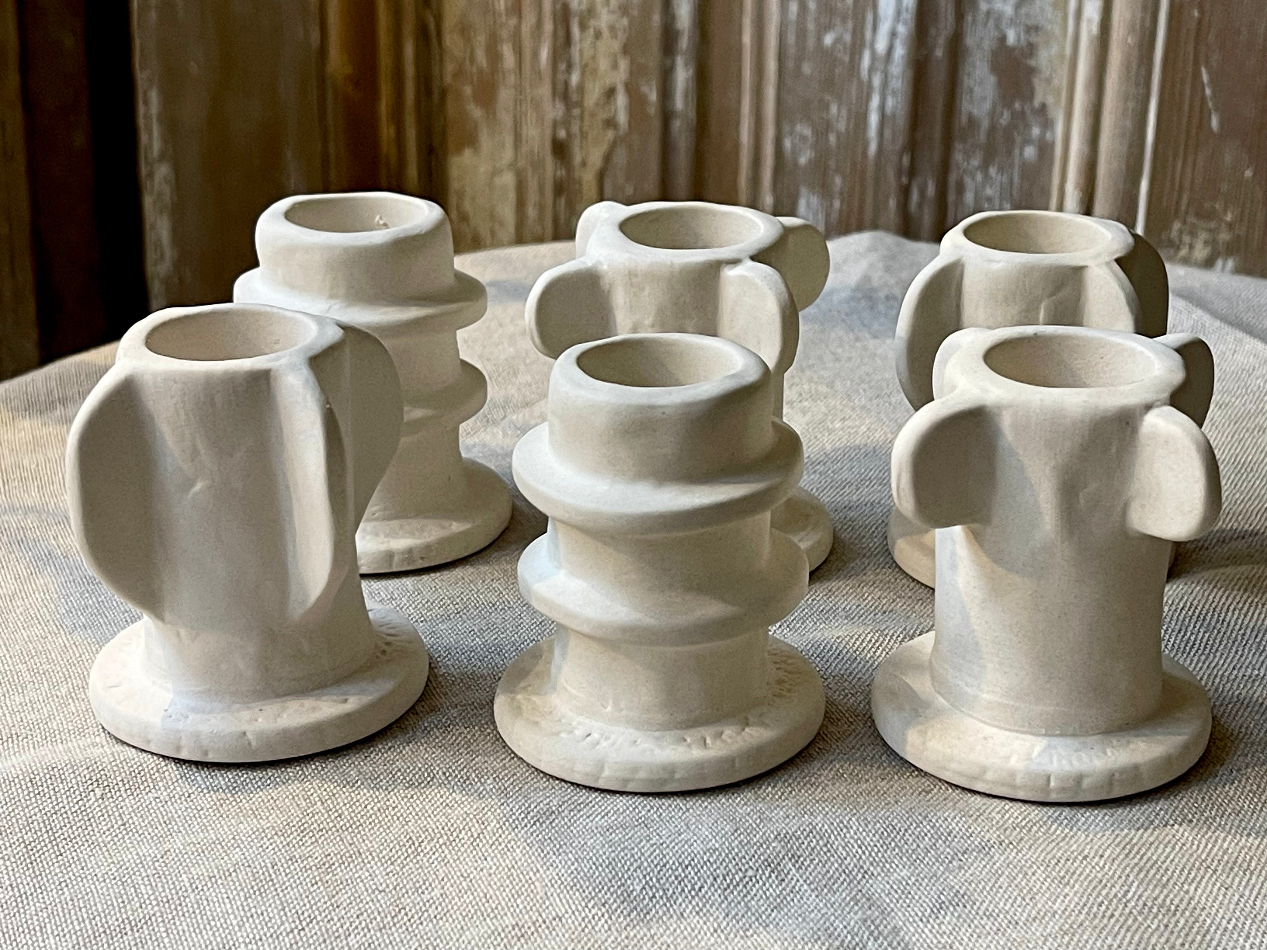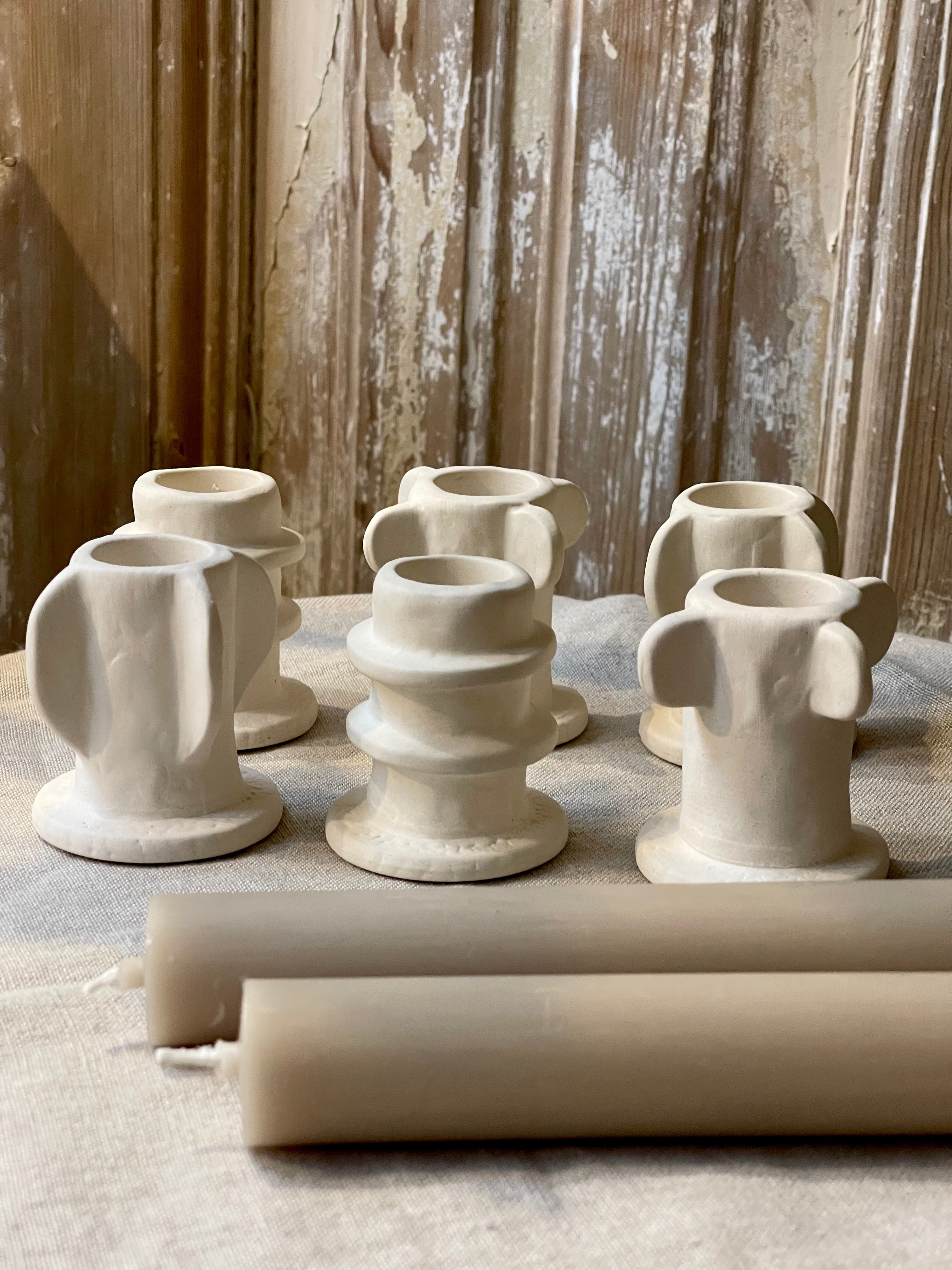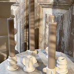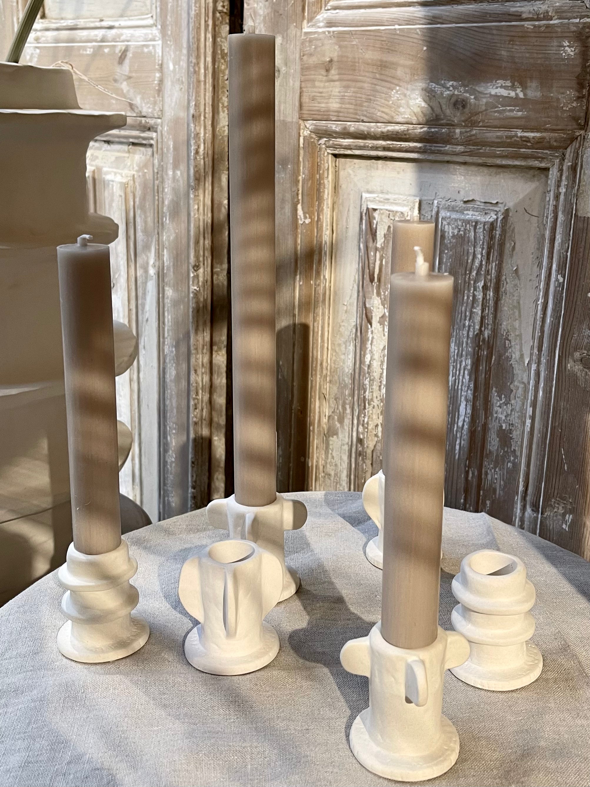 Een stijlvolle set van drie prachtig vormgegeven kaarsenhouders in een verfijnde ivoorkleur. Gemaakt van keramiek, waardoor ze zich moeiteloos laten combineren met diverse materialen en interieurstijlen. Perfect om een dinertafel sfeervol aan te kleden of om elke ruimte een artistiek en elegant accent te geven.