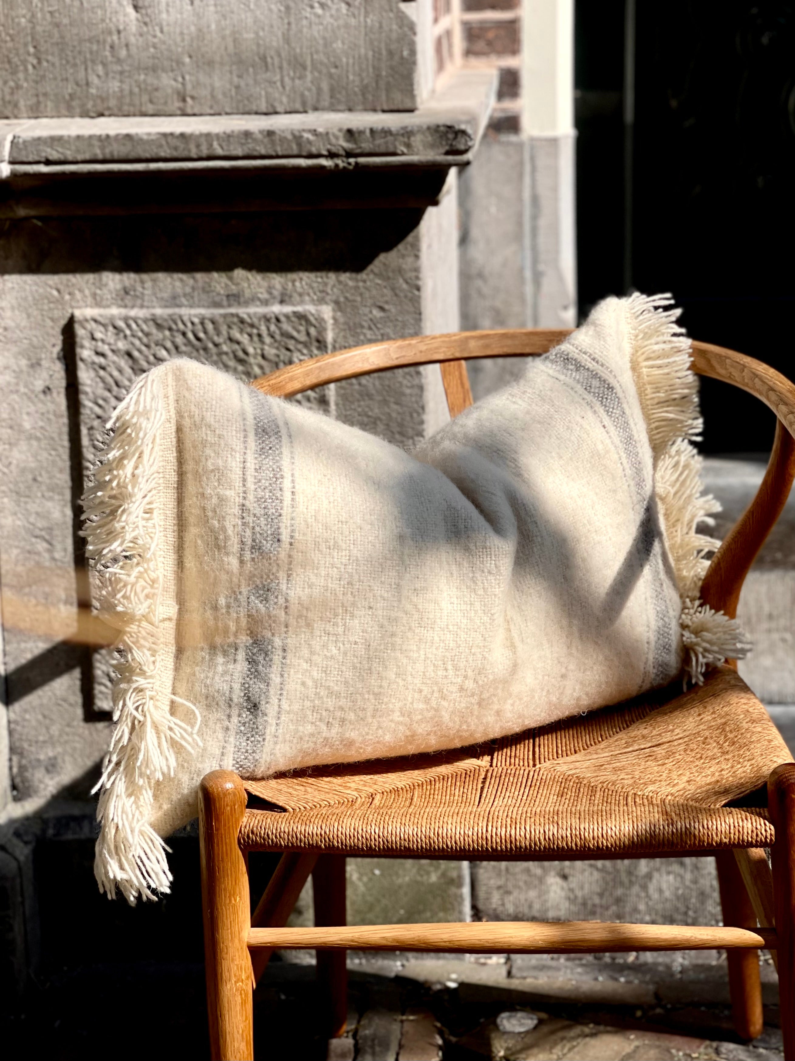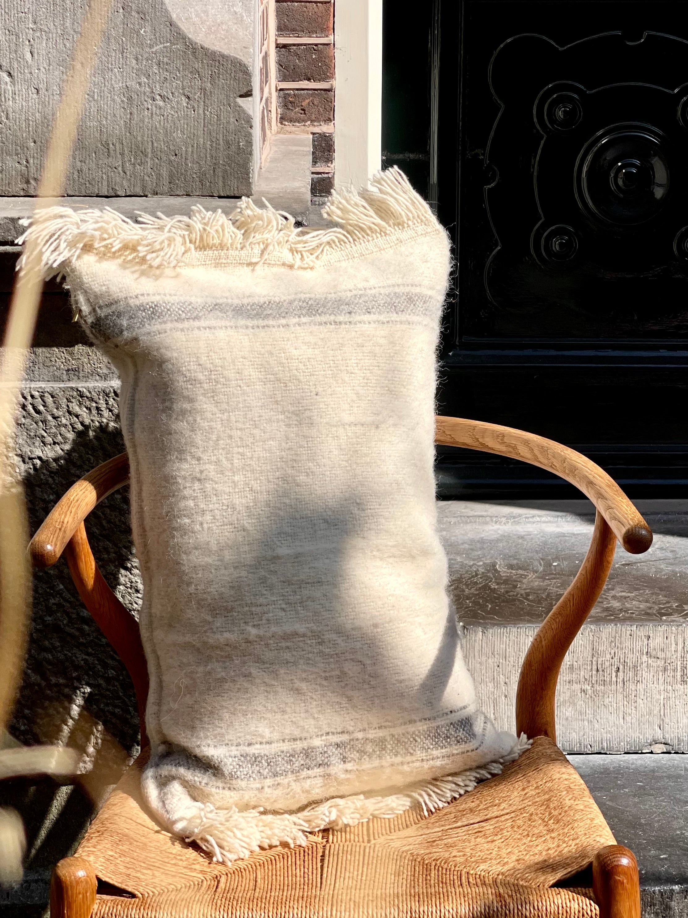 Deze 100% wollen kussenhoes, met rustige patronen en zachte natuurlijke kleuren, straalt een perfecte balans uit tussen stoer en elegant. Afgewerkt met korte franjes aan de uiteinden voor een subtiele, stijlvolle touch. Zorgvuldig geselecteerd door Hanne tijdens haar laatste trip naar Marokko.