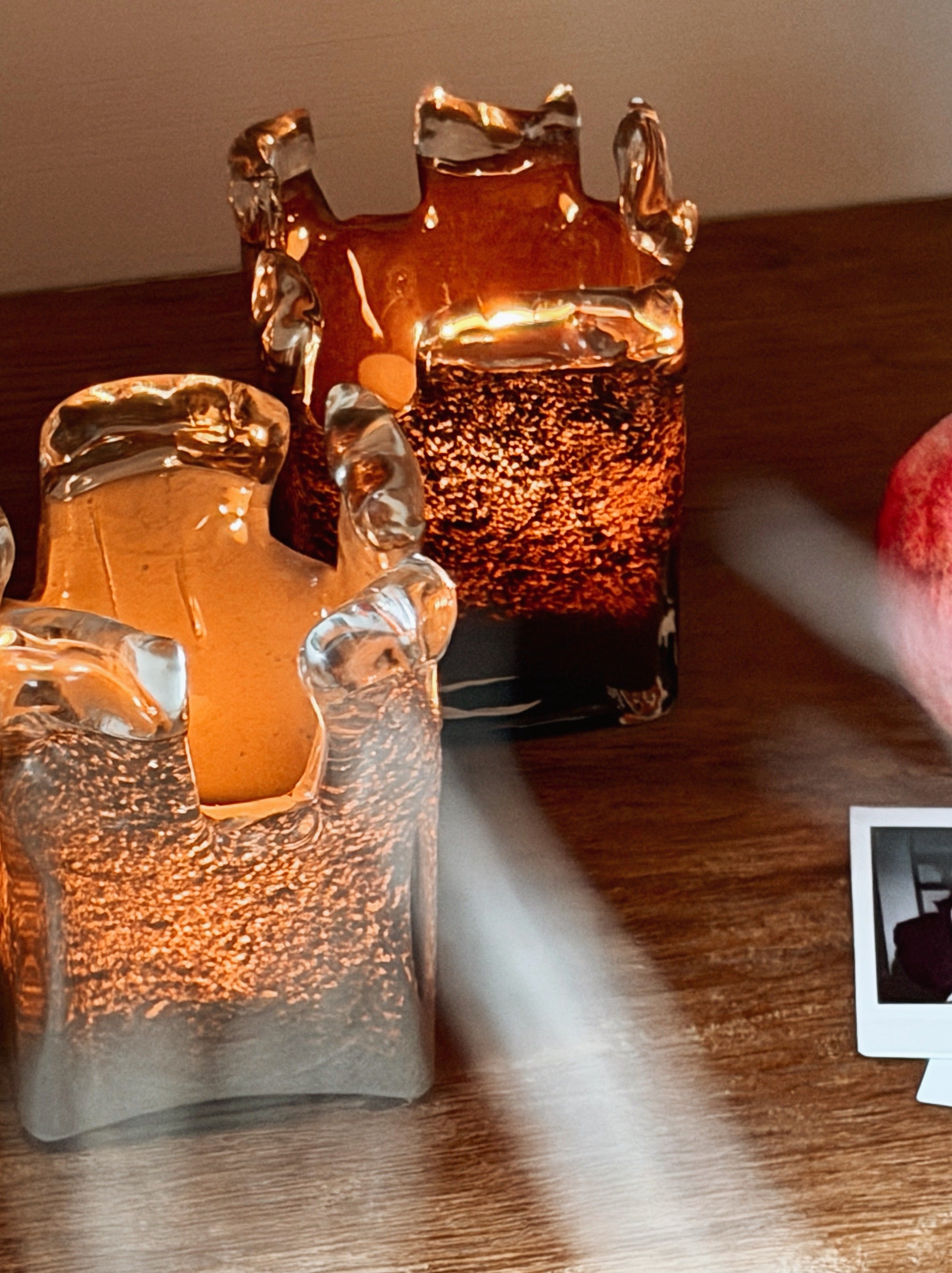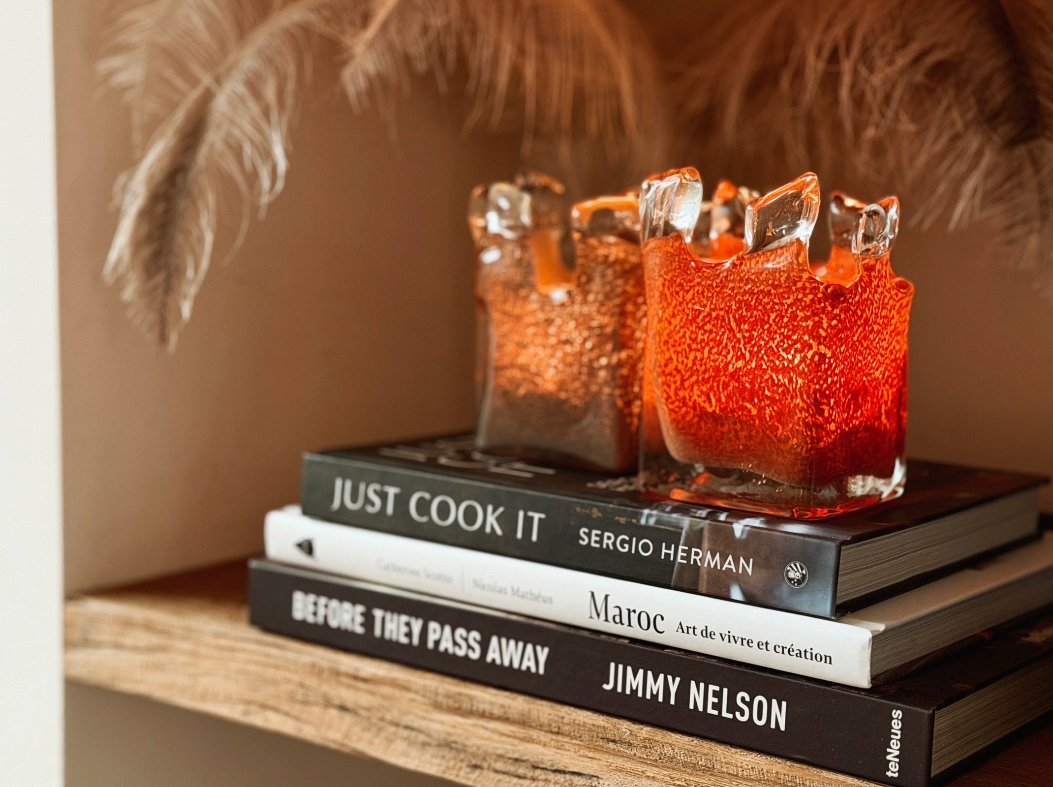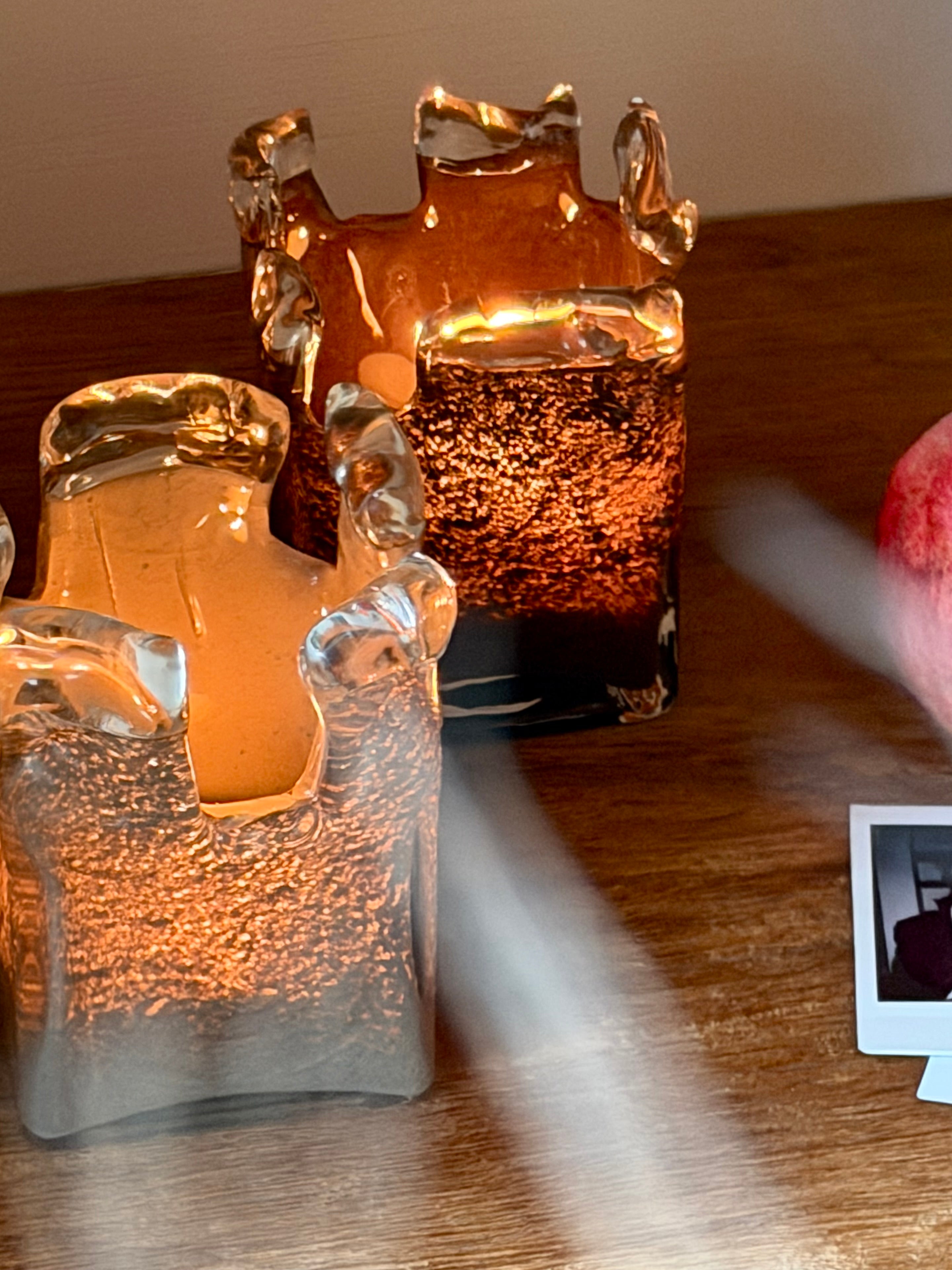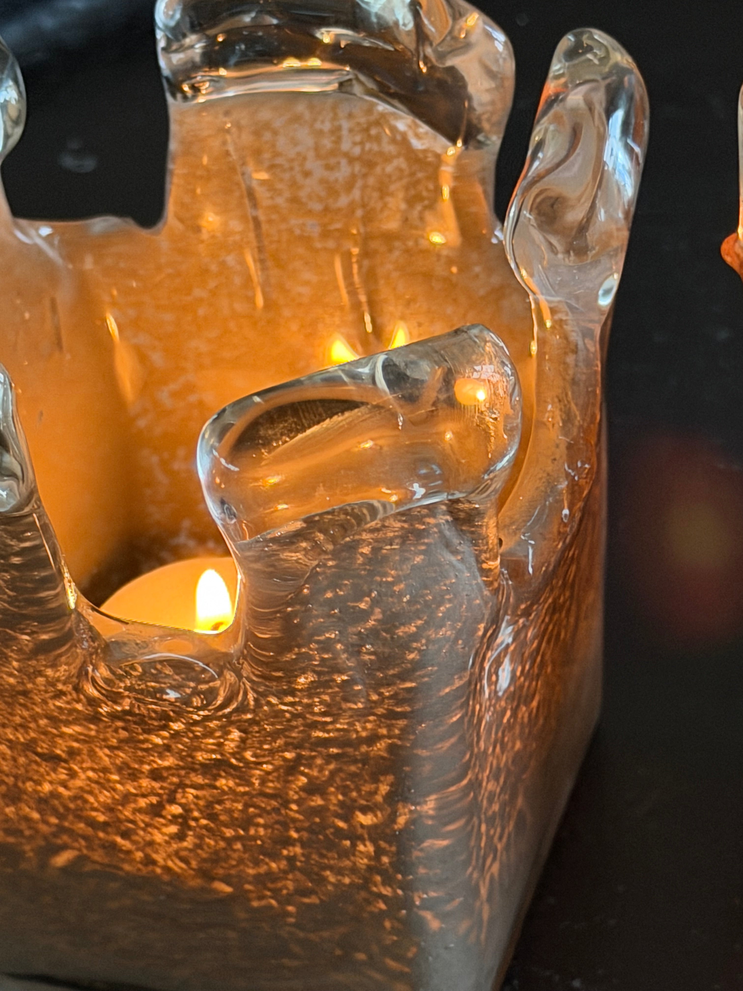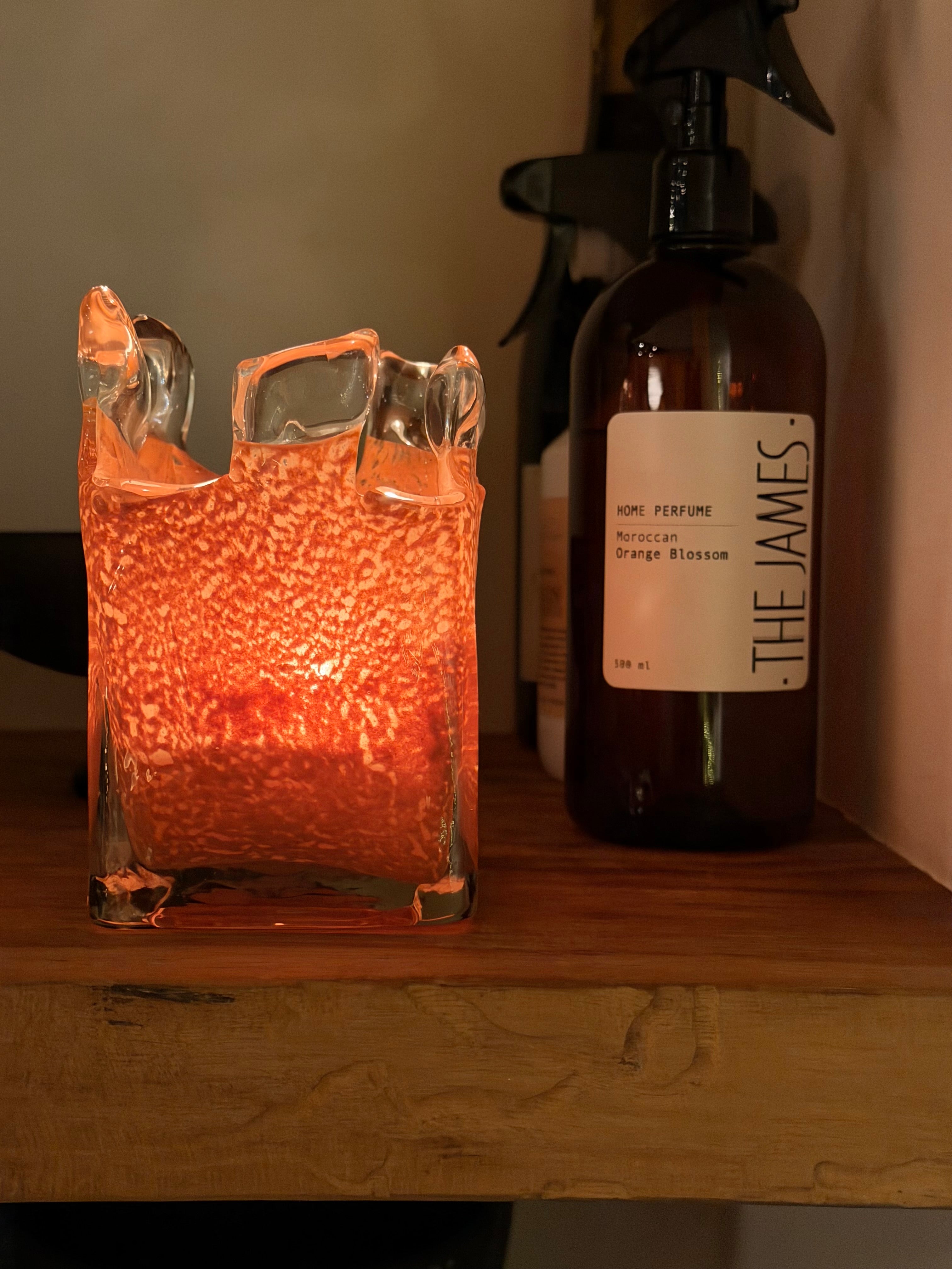 Manar is verkrijgbaar in de warme tinten oranje, taupe en bruin. Het bovenste deel van het windlicht is gemaakt van ongekleurd glas en heeft een grillige, organische vorm. Wanneer de kaars brandt, zorgt dit voor een bijzonder en speels lichteffect dat de ruimte op een zachte manier verlicht.
