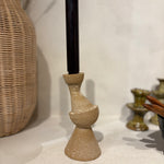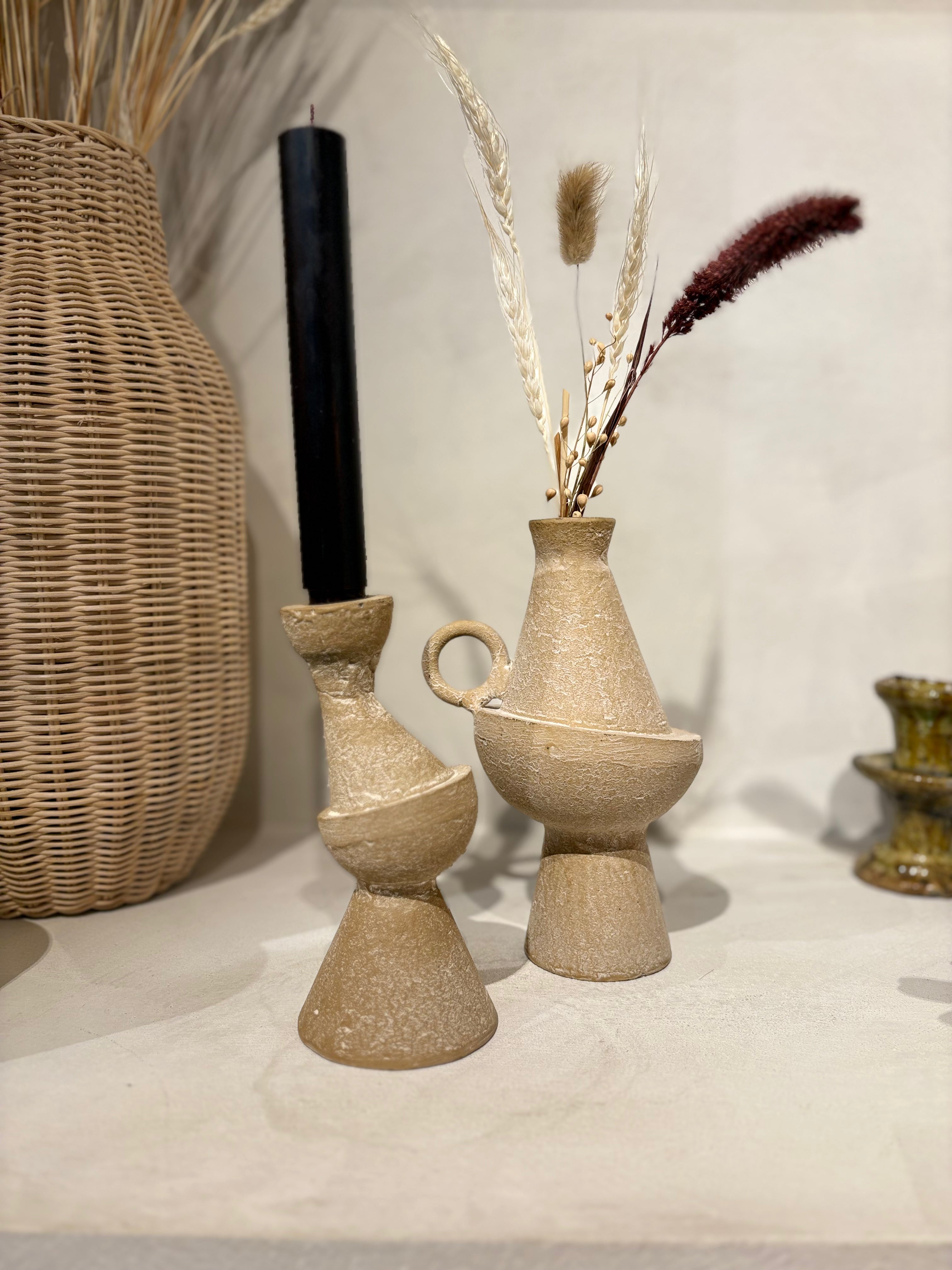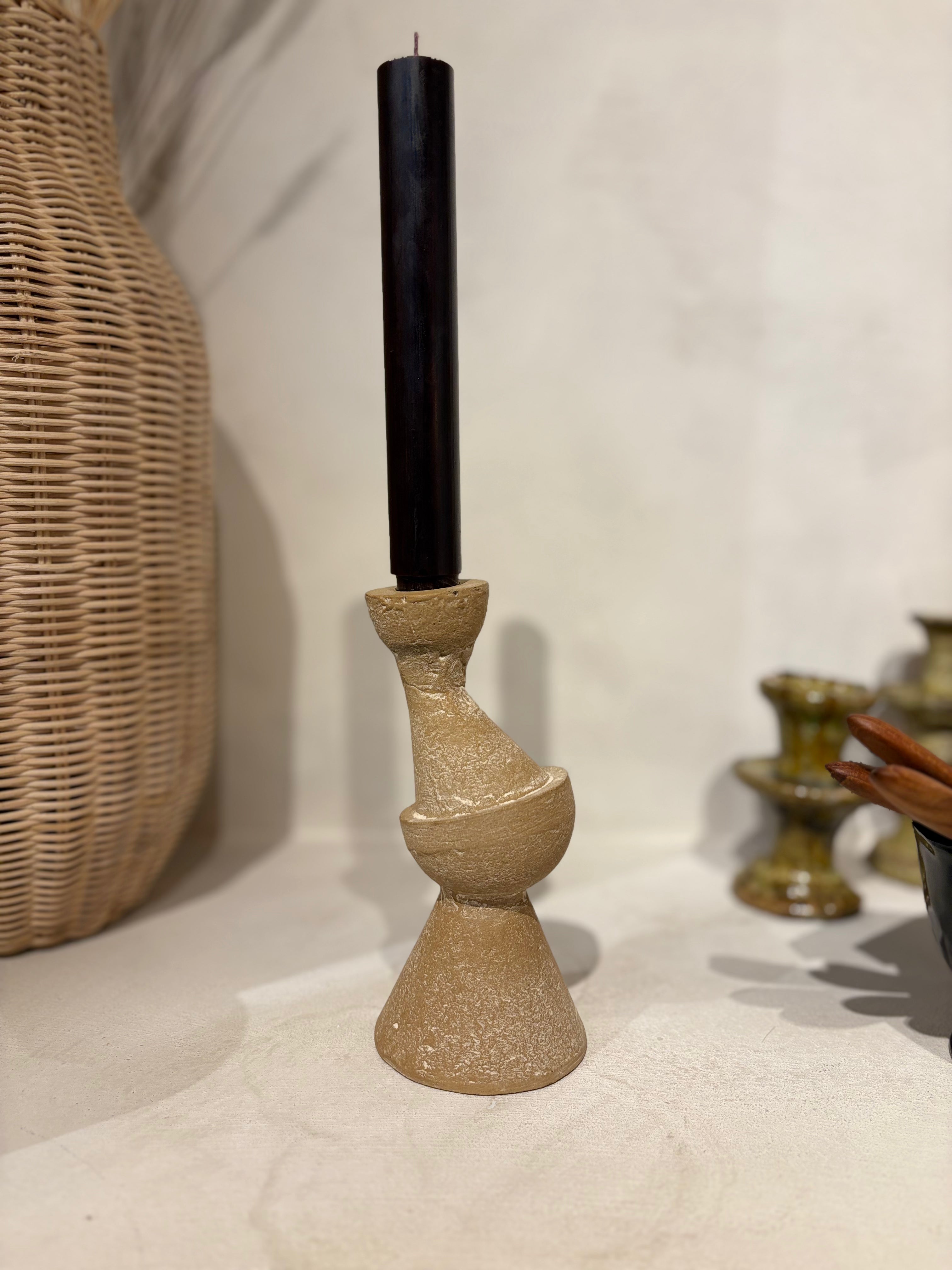 Deze kandelaar heeft een speels en modern design met zijn organische, asymmetrische vormen en aardse textuur. Het robuuste materiaal in warme zandtinten geeft een natuurlijke uitstraling, terwijl de strakke zwarte kaars zorgt voor een stijlvol contrast. Perfect als eyecatcher op tafel of dressoir!