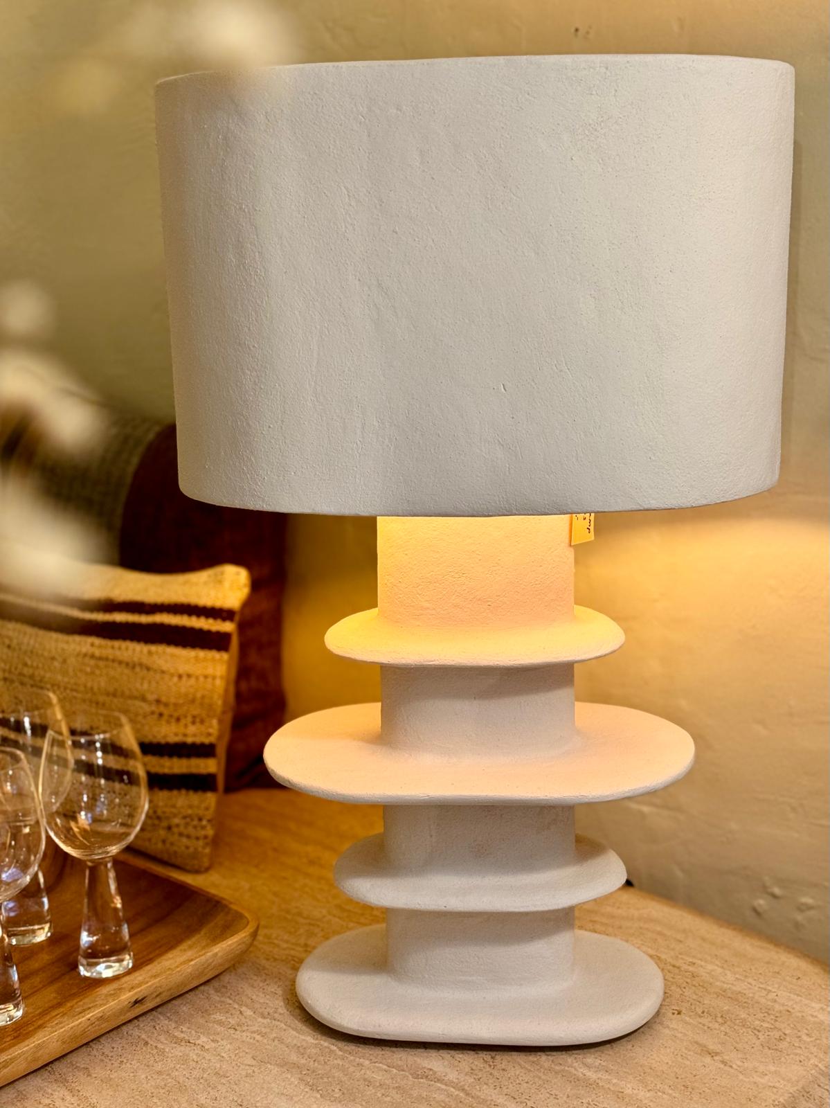 Met deze van papier mache gemaakte tafel lamp maak je elke ruimte sfeervol. Door het opvallend design maak je een echt statement. De voet is met de hand geboetseerd en dus ook een uniek stuk. Deze XL tafel lamp heeft een ovale vorm waardoor hij perfect tegen een achterwand kan worden gezet.