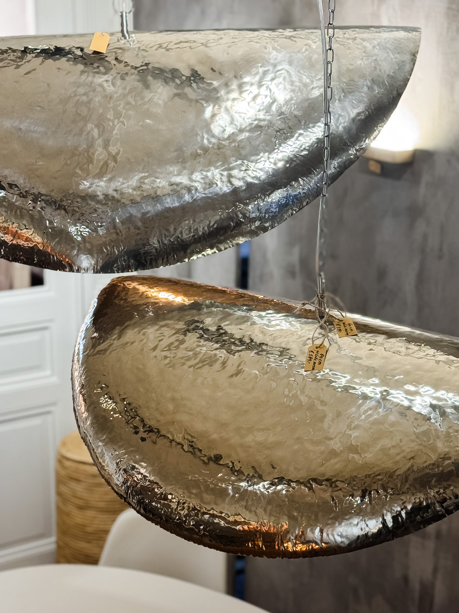 Introducing "Noor" – our brass lamp that instantly adds a statement and style to your home. Crafted from hand-hammered brass, these beauties come in four sizes: 60, 80, and 100 cm. Each lamp comes with a beautiful chain for easy hanging and features an E27 lamp fitting. Whether you choose to showcase them individually or create an even more captivating effect by arranging multiple lamps at varying heights, "Noor" is the perfect addition to elevate your decor. Because these lamps are made of white brass, a more expensive material, their price is higher compared to the gold brass lamps.