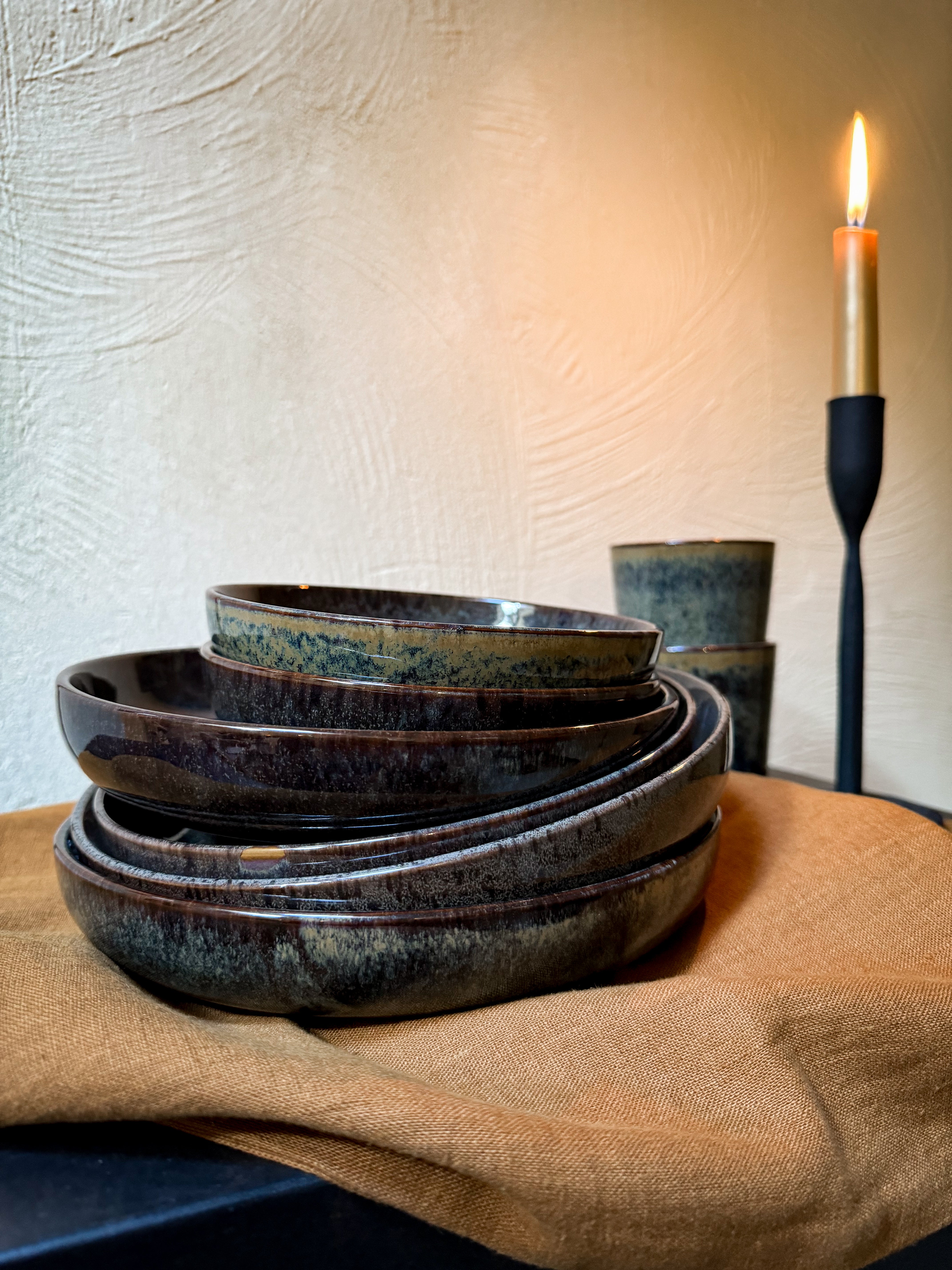 Introducing the "Oku Deep Plate" – a part of our Oku collection featuring a multi-colored design inspired by the coastline. This high quality tableware comes in two different sizes to create a warm and inviting ambiance at your table setting. This design is hand-finished, which may result in irregularities that contribute to the individual uniqueness of each piece.
