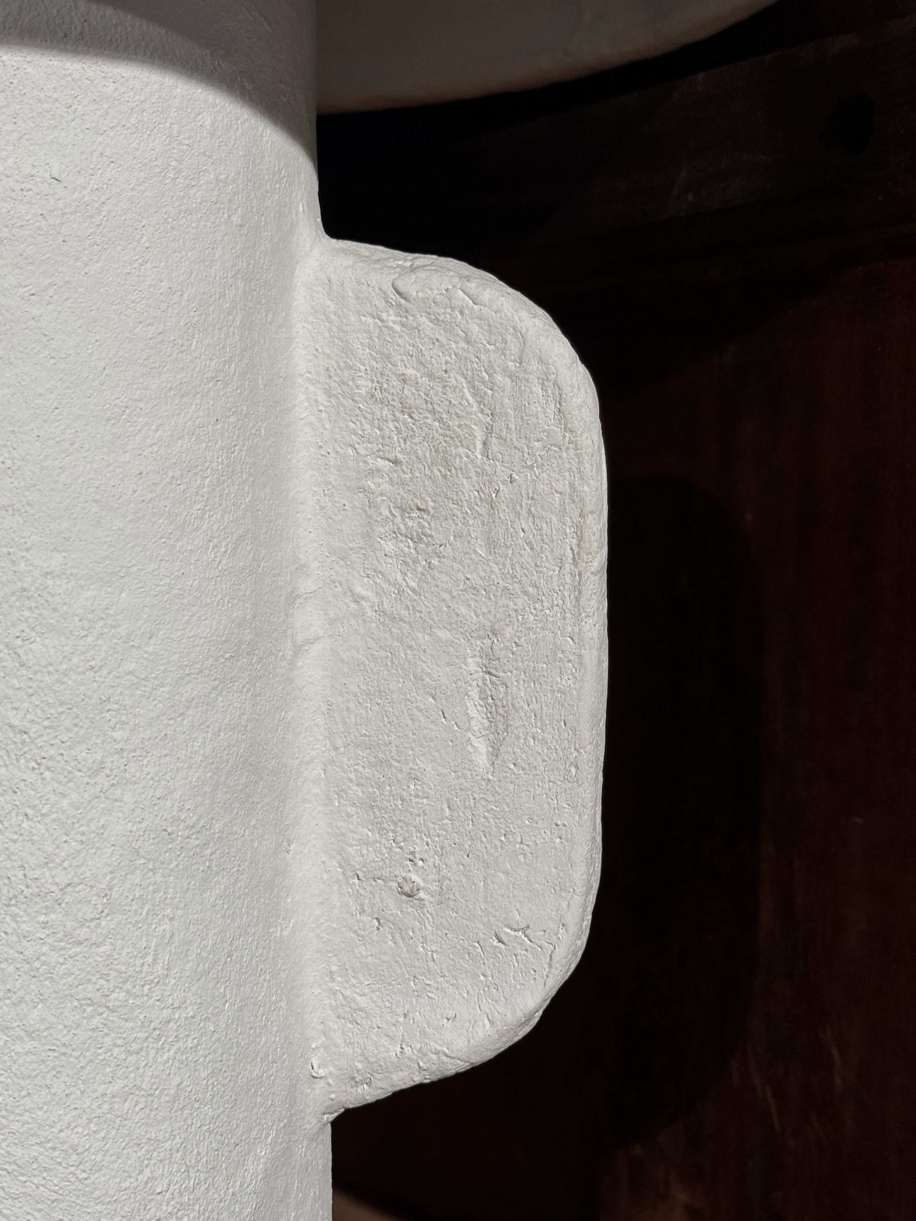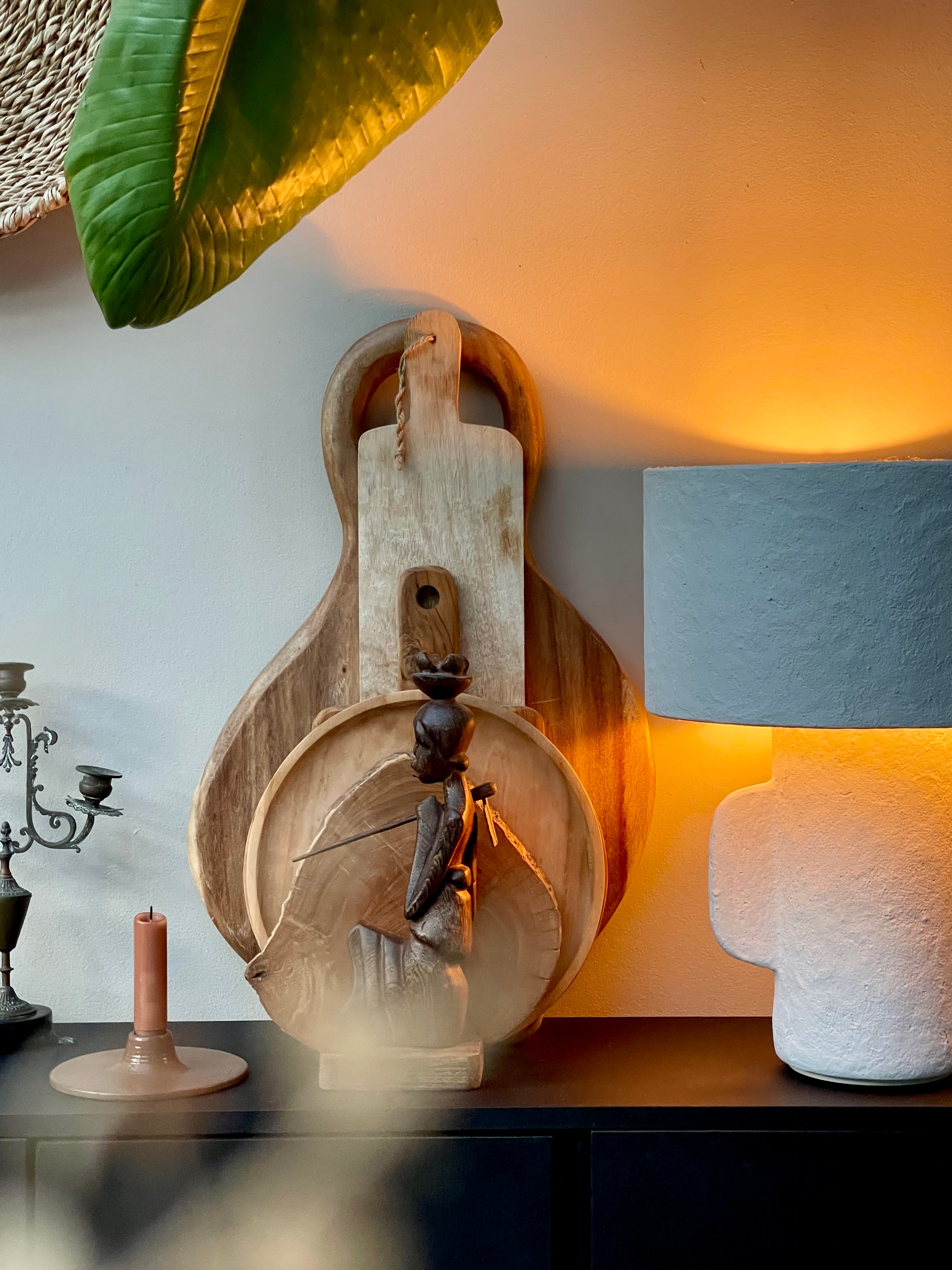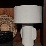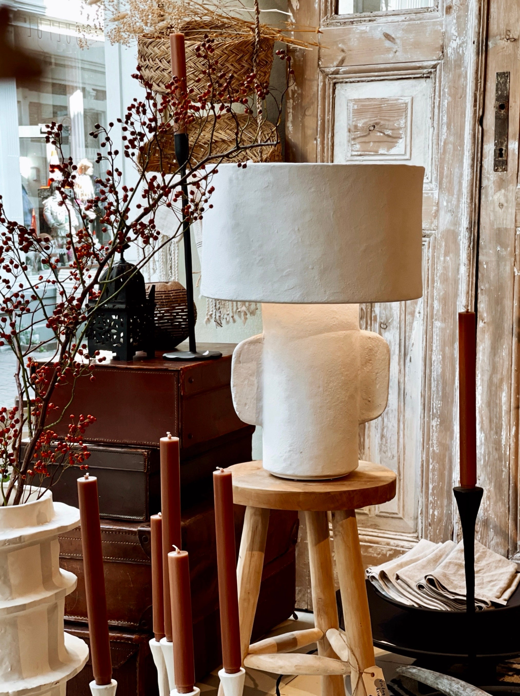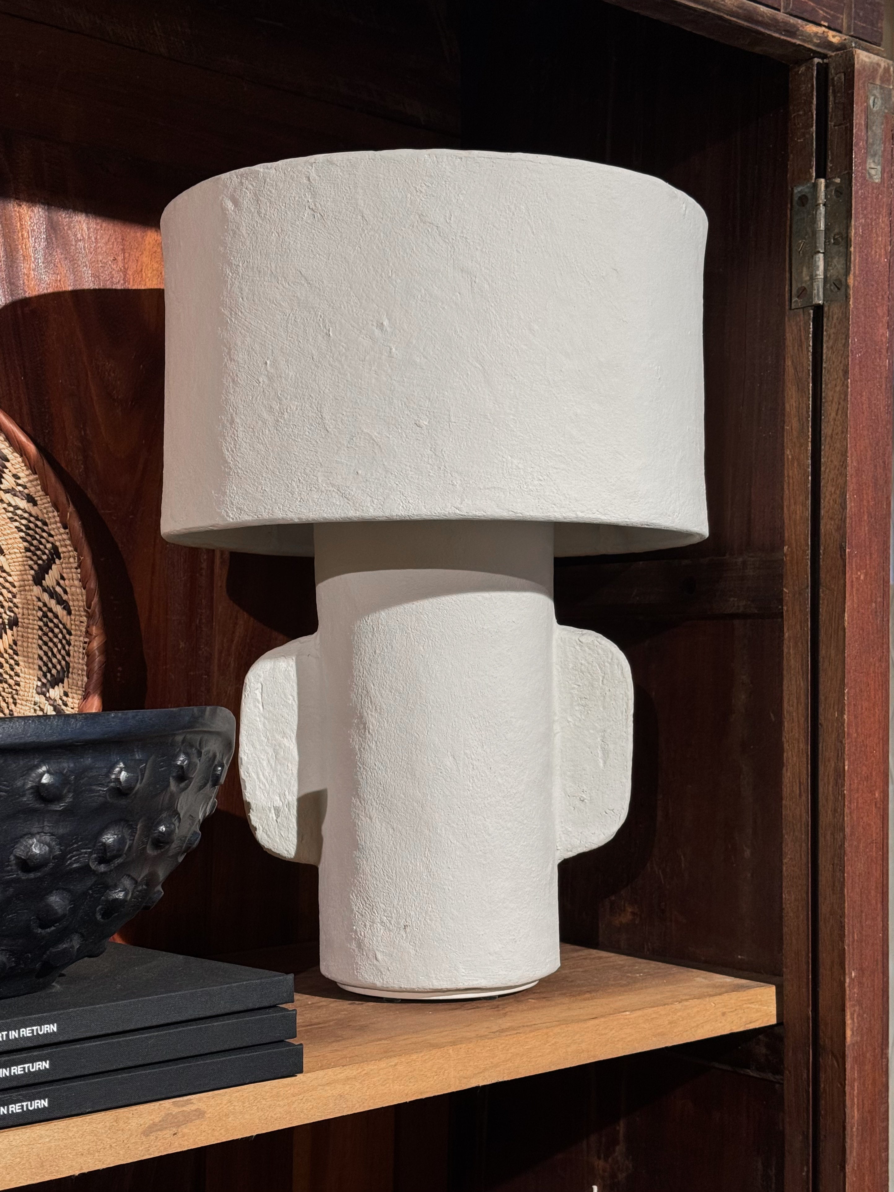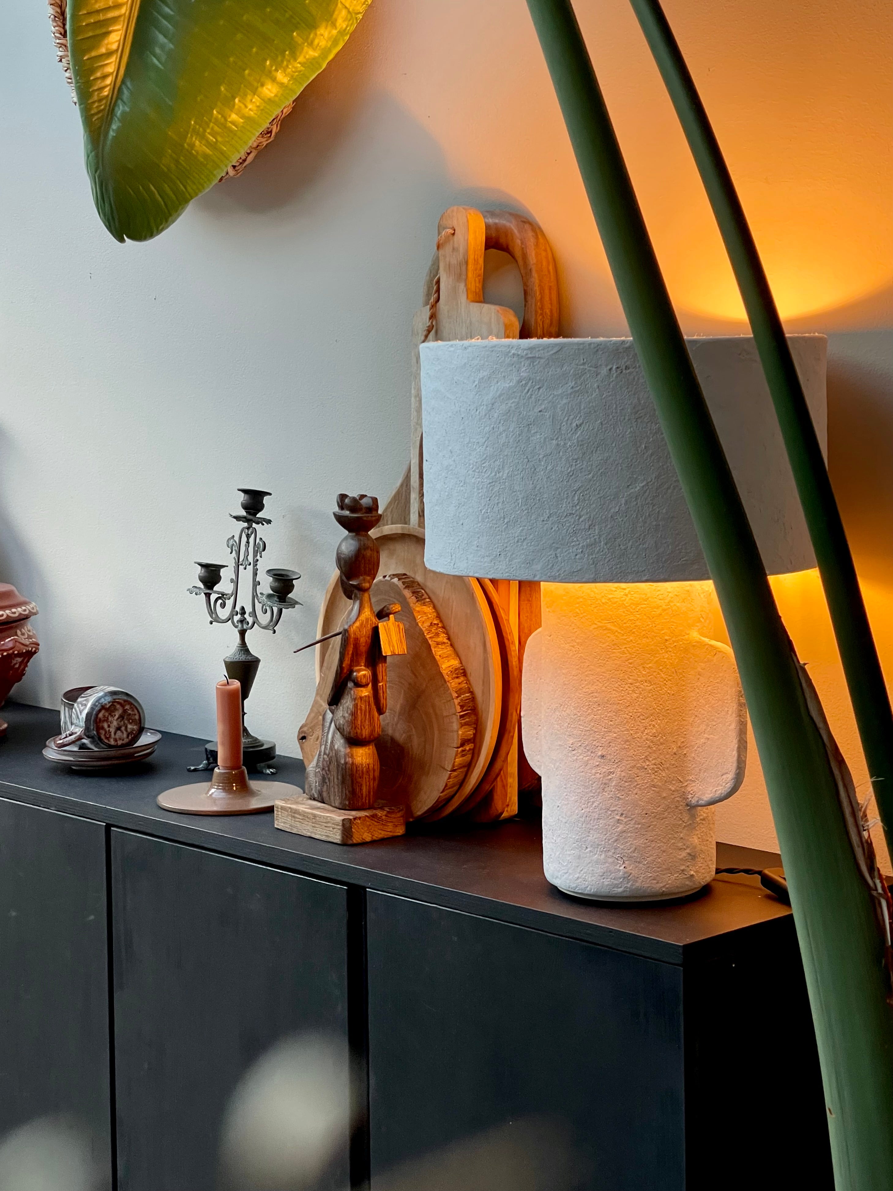 "Olaf" - a table lamp crafted from paper mache, showcasing genuine craftsmanship. This lamp serves as an eye-catching centerpiece in any home, beautifully illuminating the intricate texture of the paper mache material.