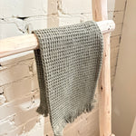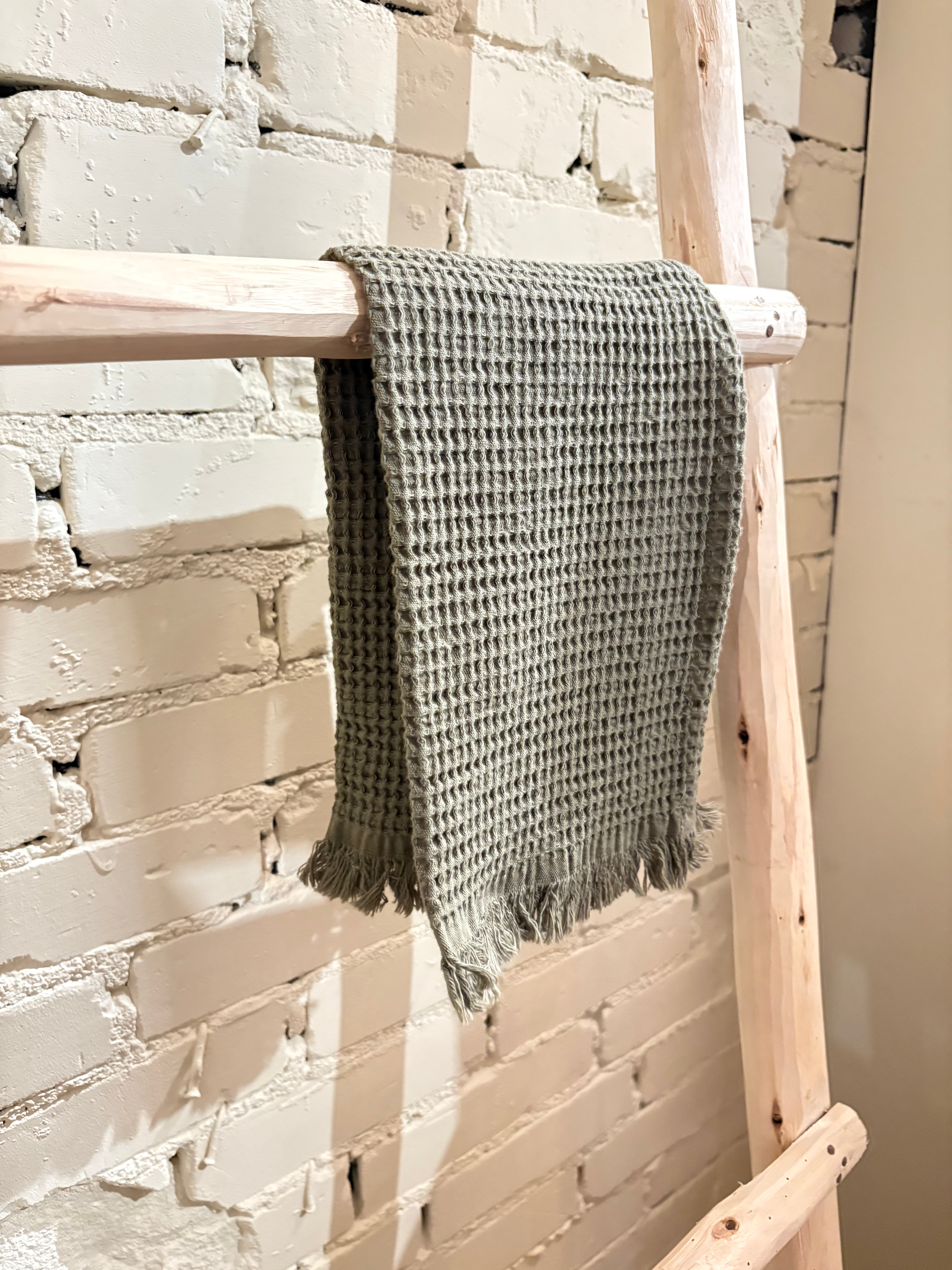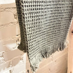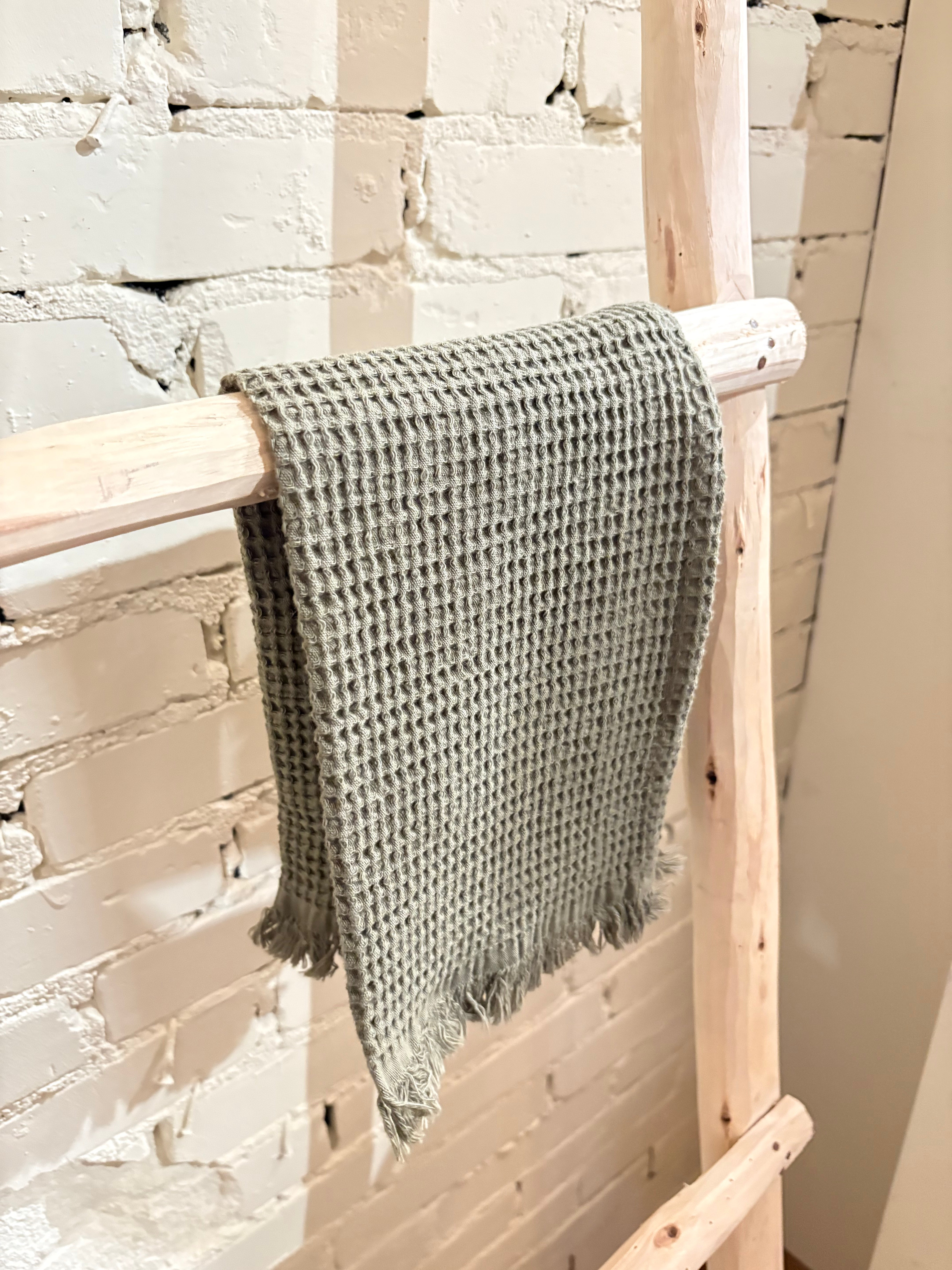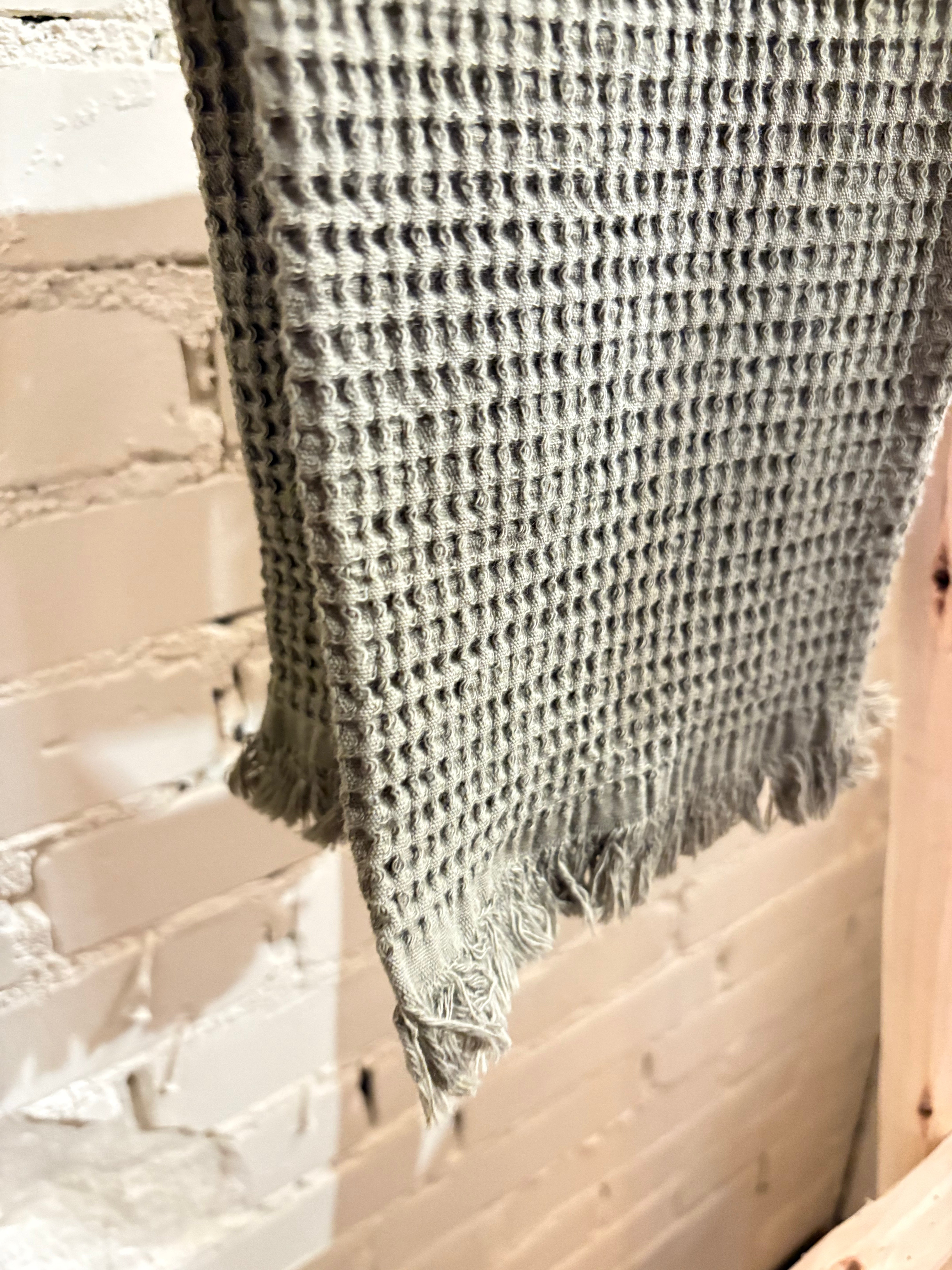 This towel features a pretty waffle pattern with fringe detailing, made from 100% natural cotton. Available in a variety of colors, perfect for mixing and matching with our bath mats and guest towels.