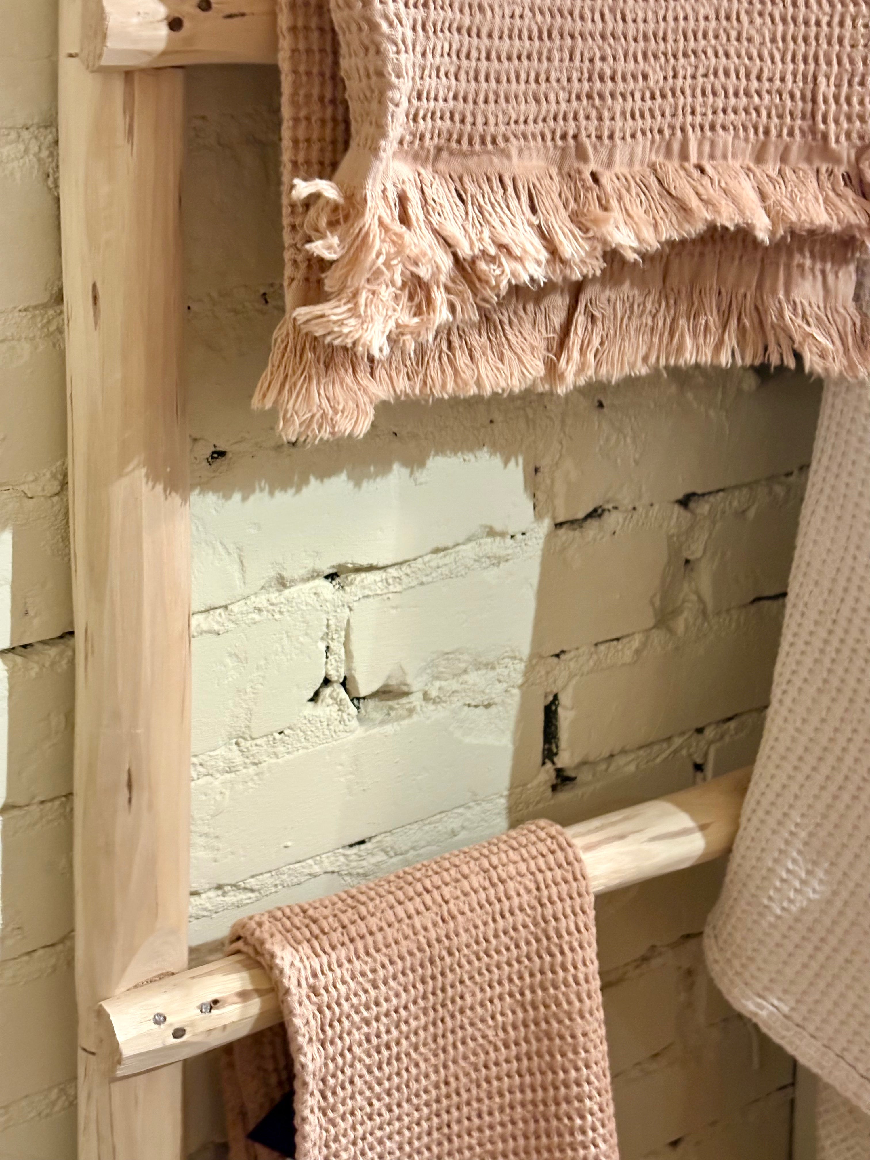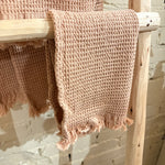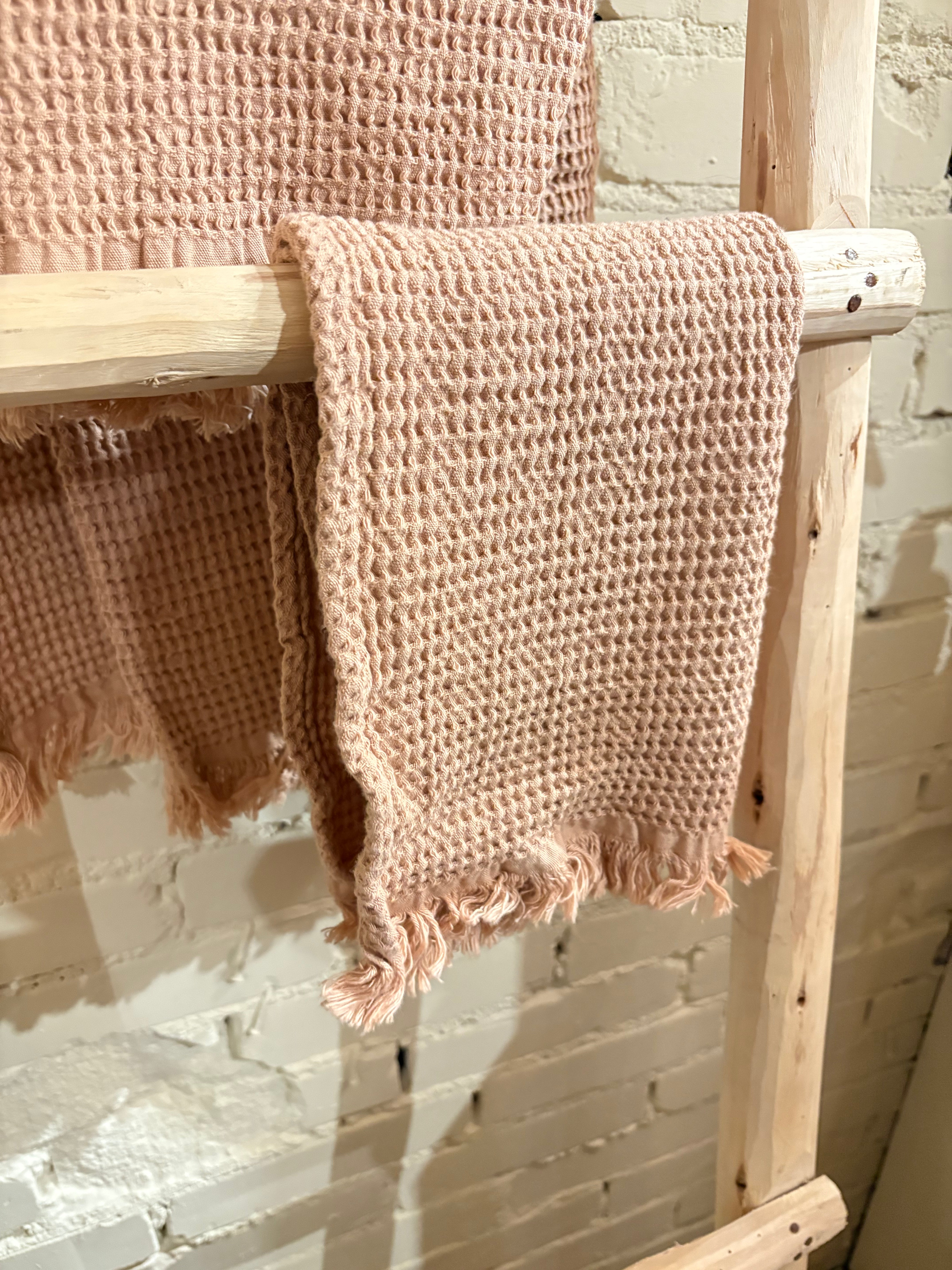 This towel features a pretty waffle pattern with fringe detailing, made from 100% natural cotton. Available in a variety of colors, perfect for mixing and matching with our bath mats and guest towels.