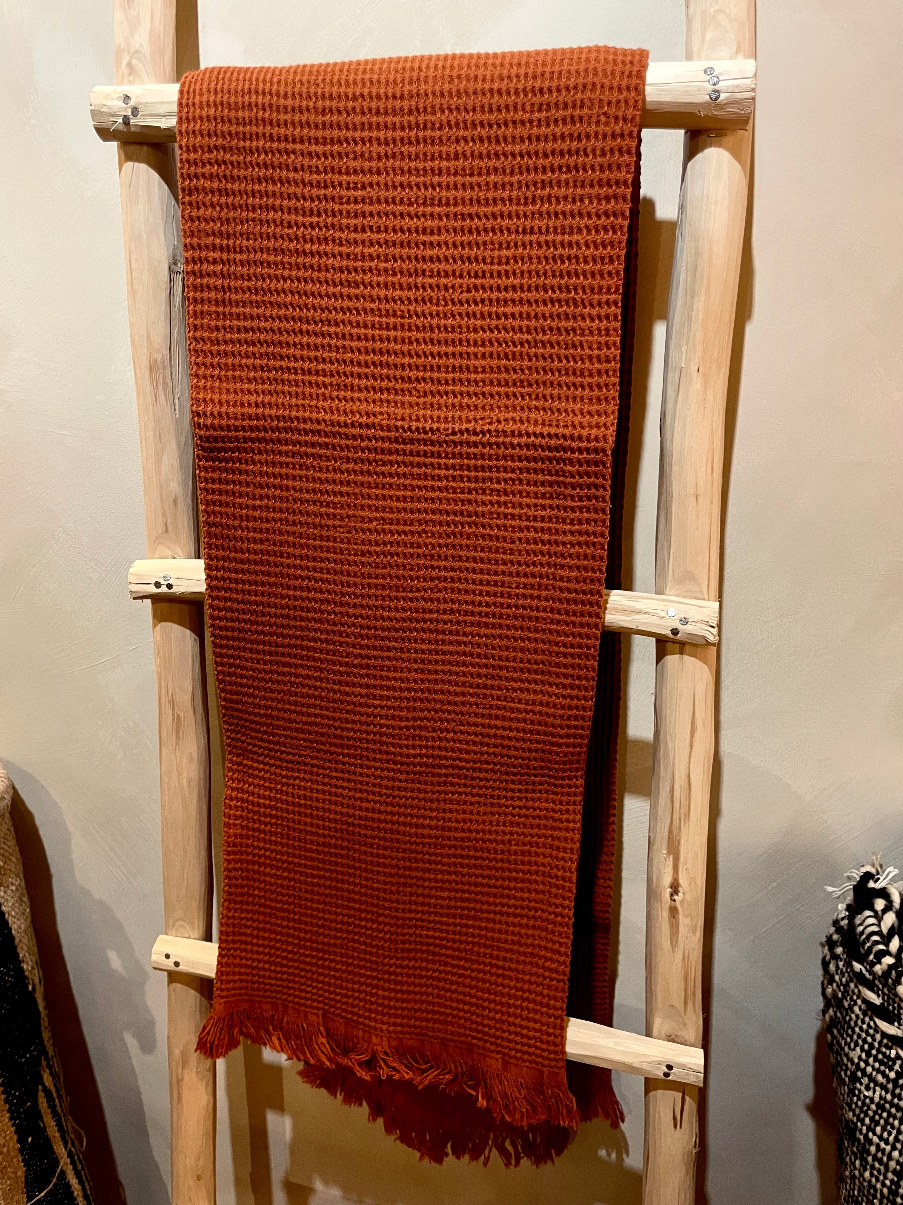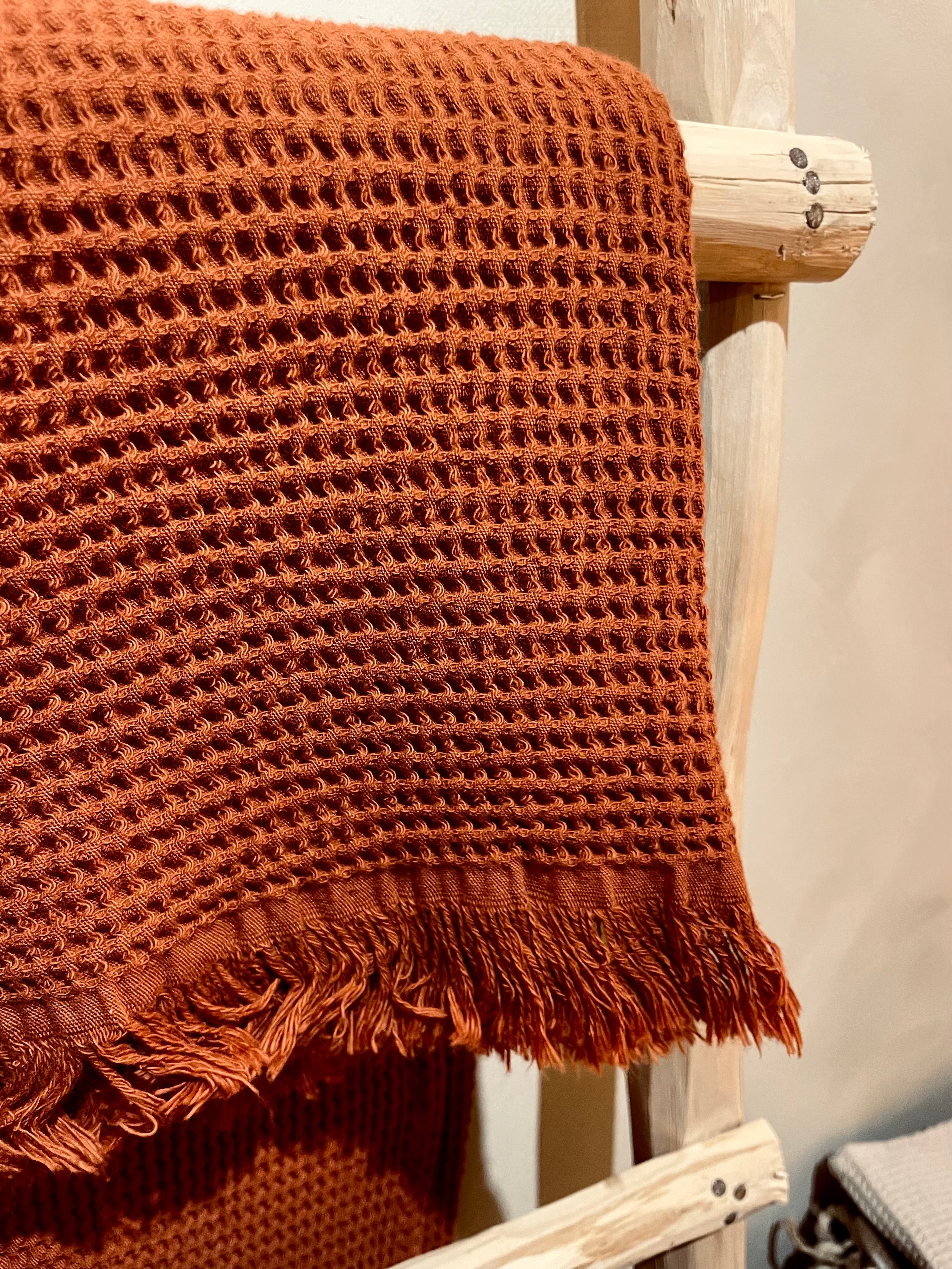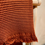 This towel features a pretty waffle pattern with fringe detailing, made from 100% natural cotton. Available in a variety of colors, perfect for mixing and matching with our bath mats and guest towels.