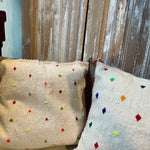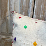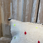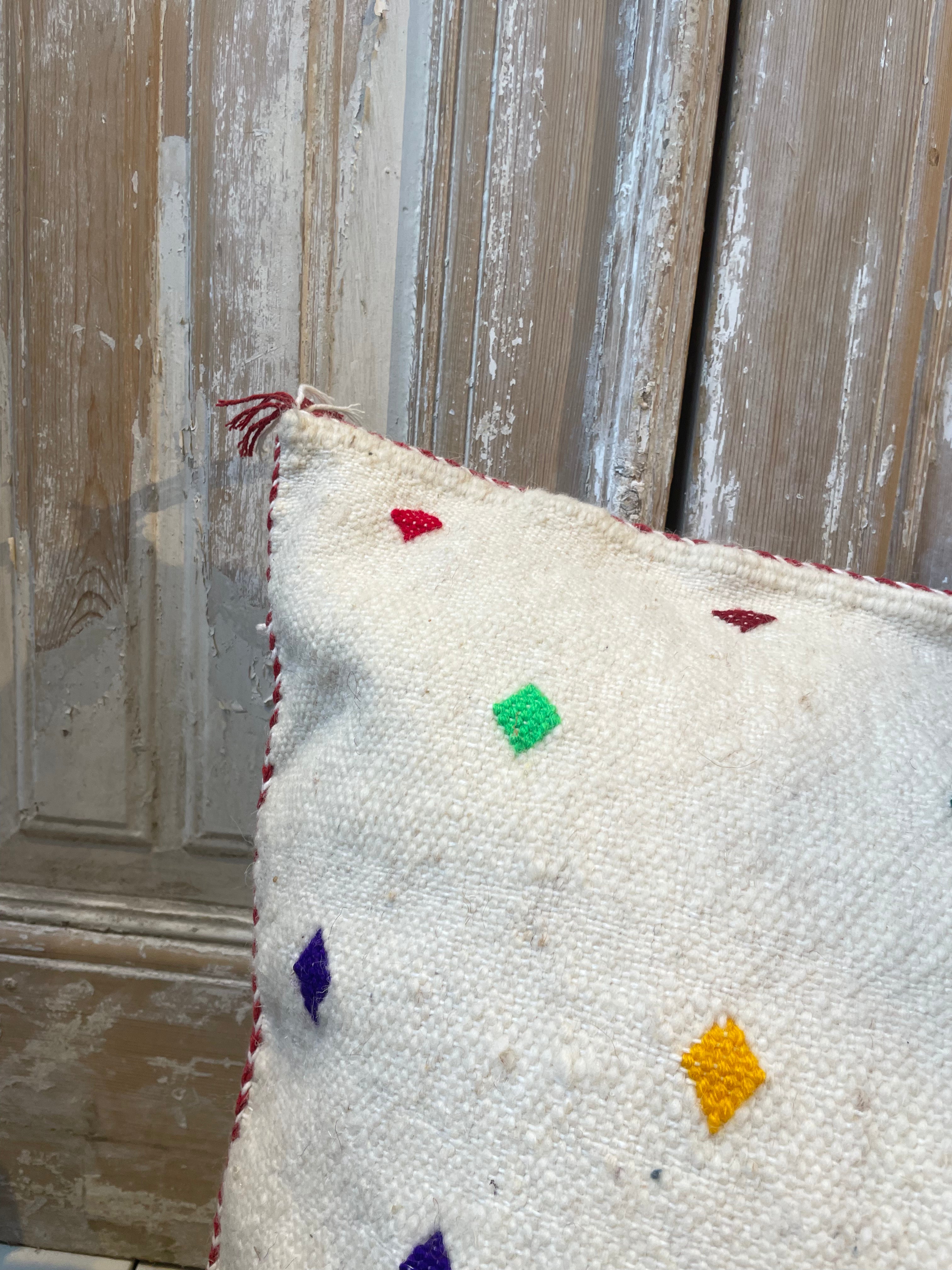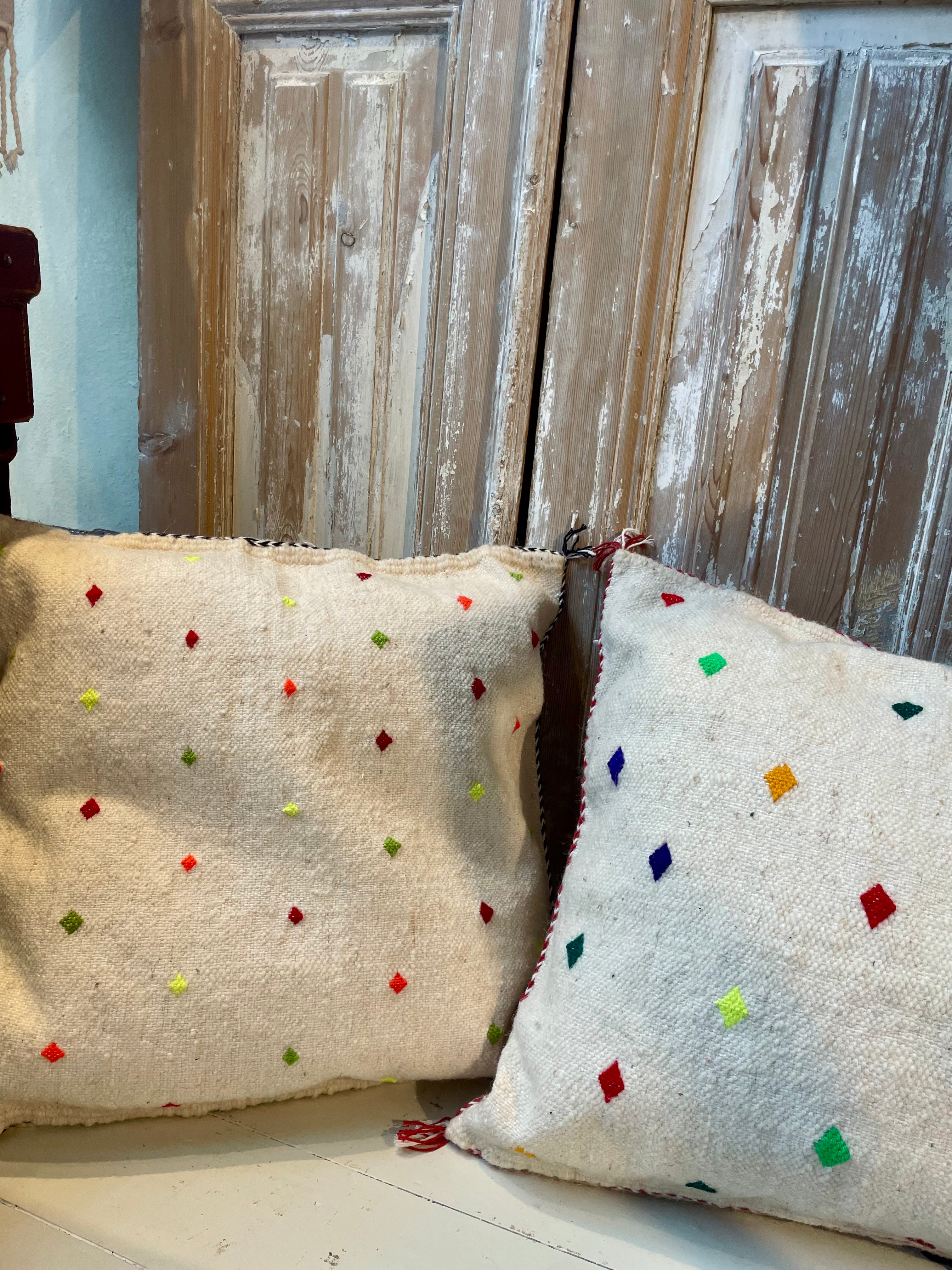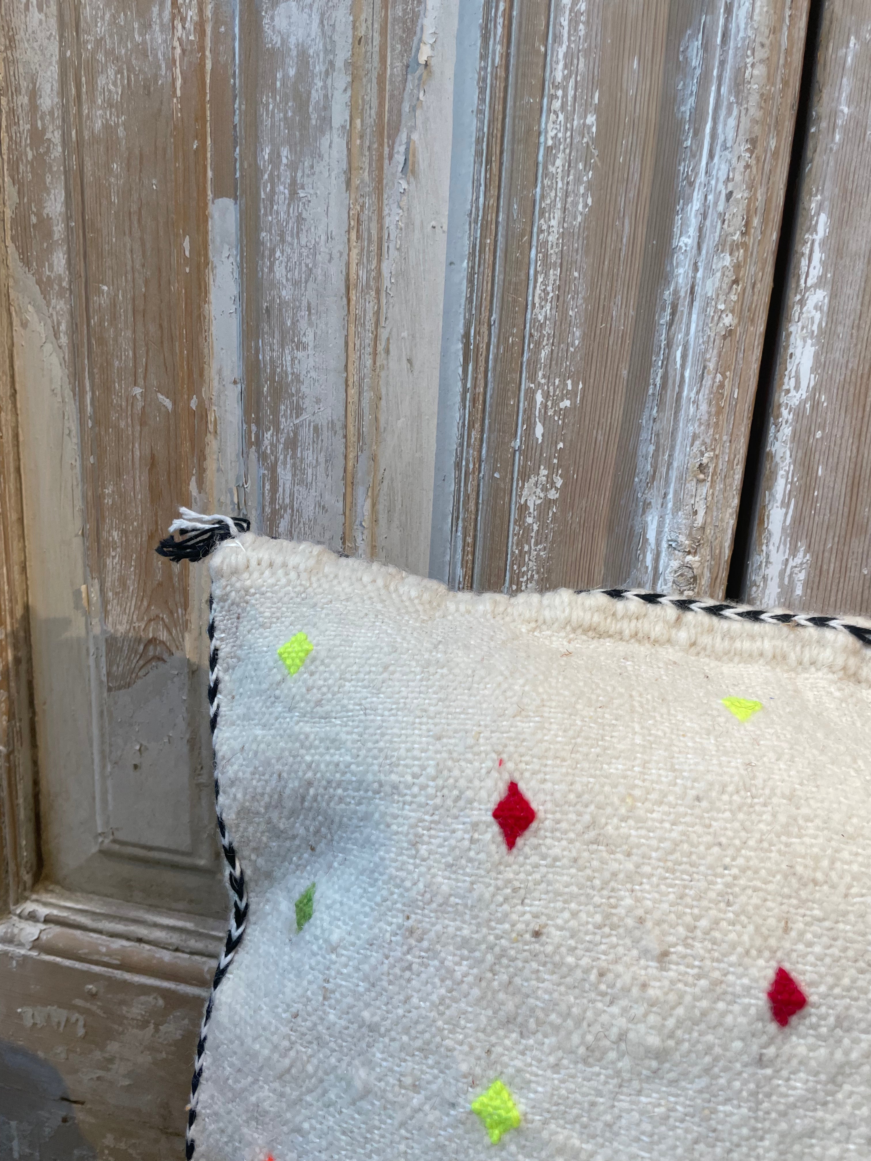 Meet de Polkadot cushion. Een natuurlijke kleur kussen maar wel met kleurijke accenten. Het kussen js gemaakt van 100% wol en is afgewerkt met een zwart of rood biesje rondom. Deze cushion's zijn door Hanne hand picked tijdens haar reis in Marokko. Met deze Polkadot cushion's maak je van elke plek iets vrolijks en spice je meteen je interieur.