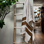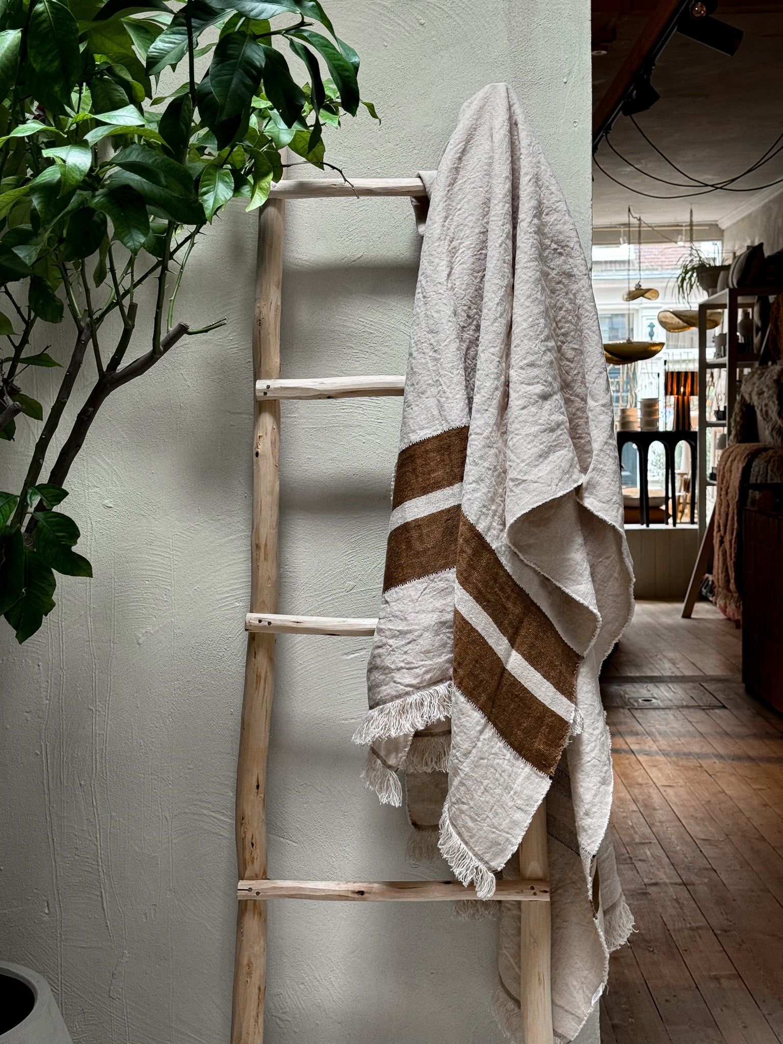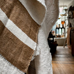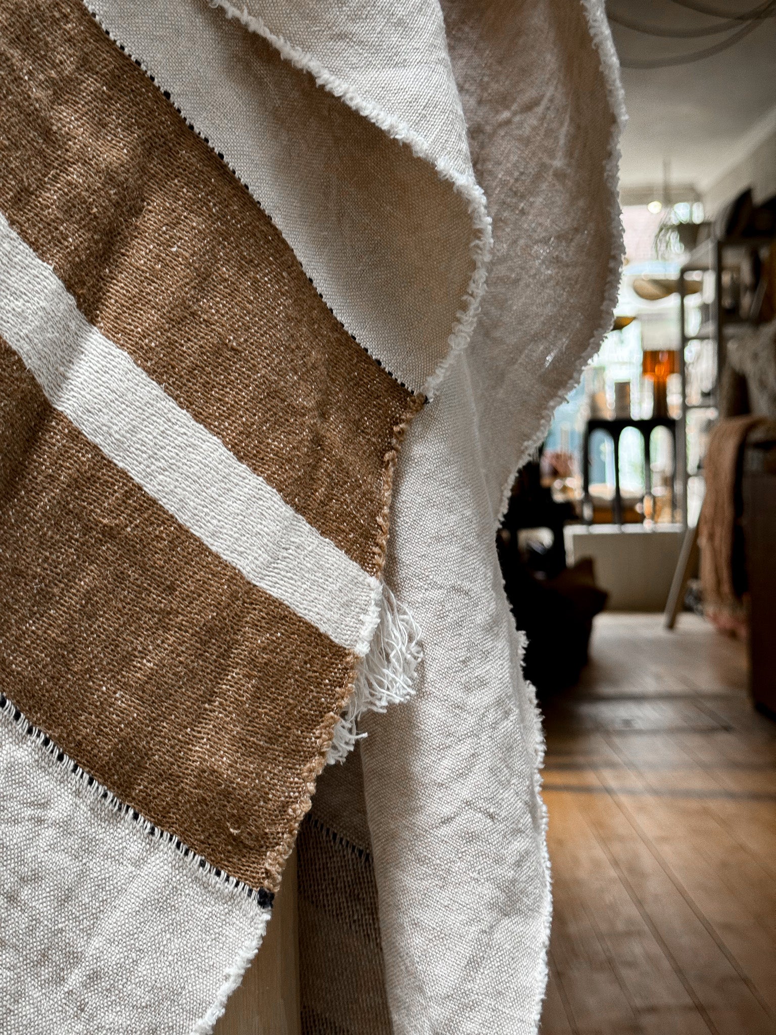 The Tablethrow Sahara Railway, a charming addition to enhance your dining ambiance. Crafted from 100% linen, that is produced in Belgium by experienced Artisans using only the finest flax fibers. The Bruges stripe pattern adds a touch of rustic charm and visual interest to your table setting, creating an inviting atmosphere for gatherings both casual and formal.