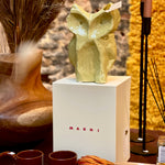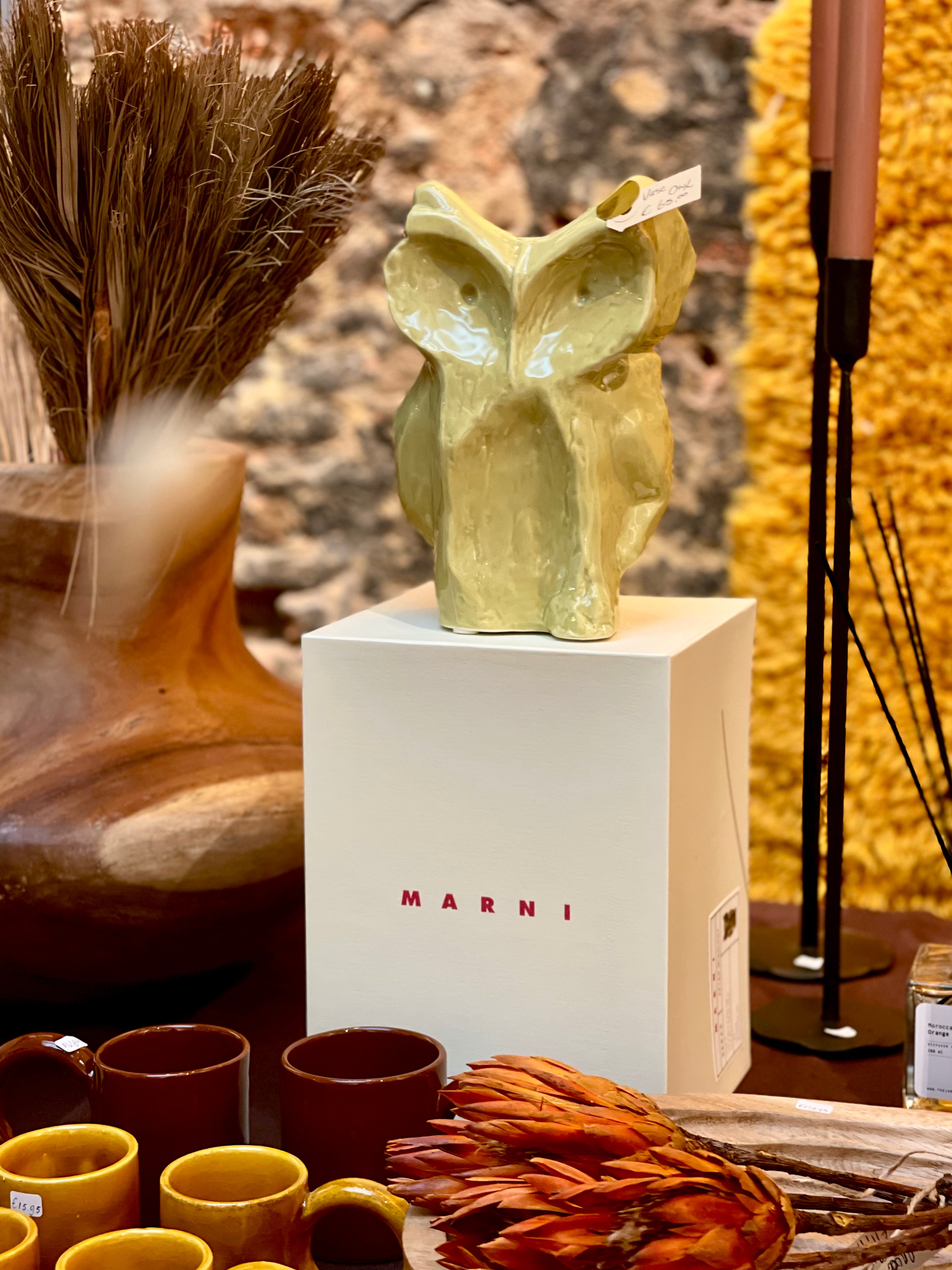 Breng karakter en stijl in je interieur met deze unieke vaas in de vorm van een uil, ontworpen door MARNI. De vaas is geglazuurd in groene en gele tinten en wordt geleverd in een prachtige geschenkverpakking – perfect om te geven of te koesteren als pronkstuk in huis.