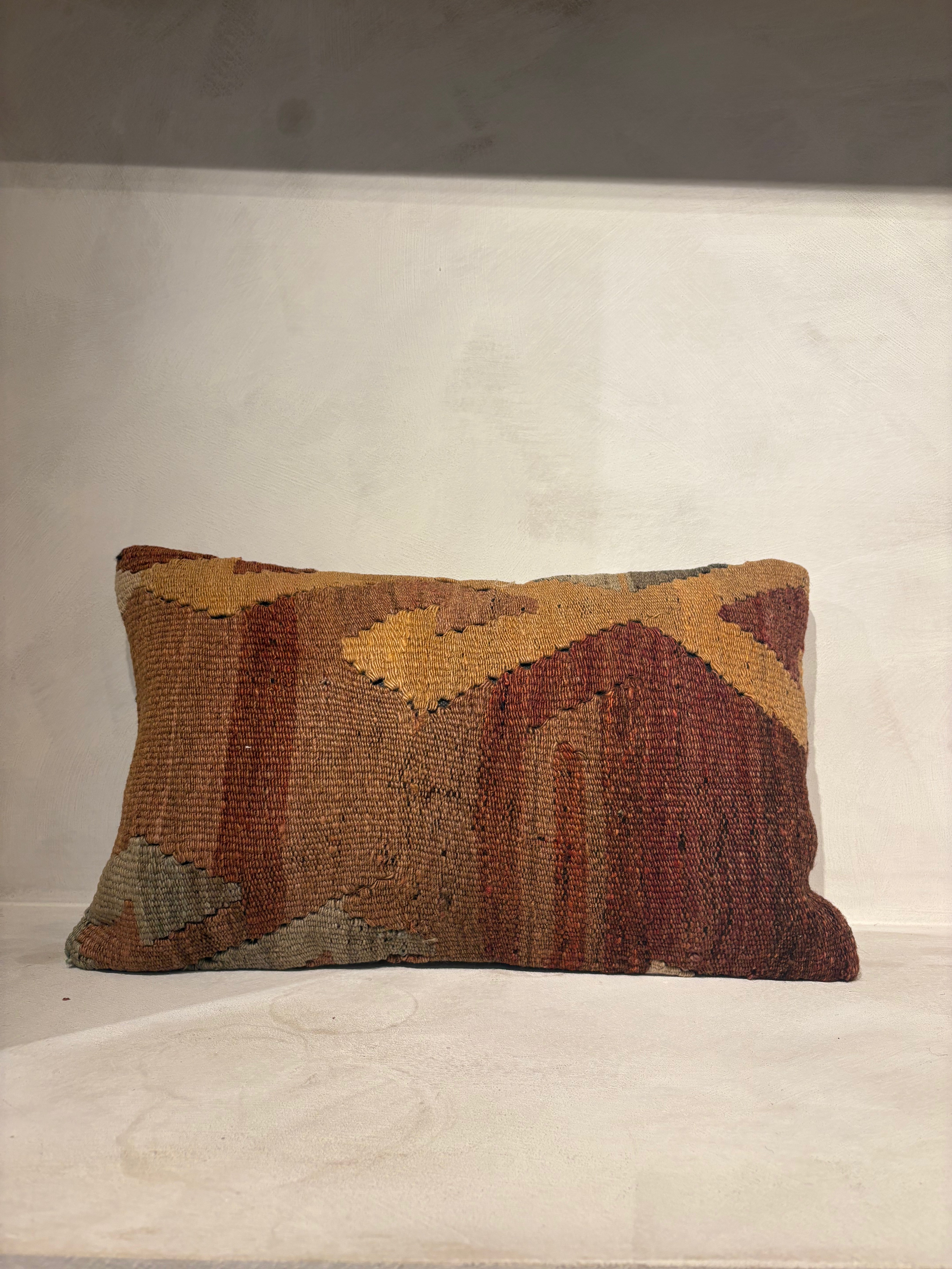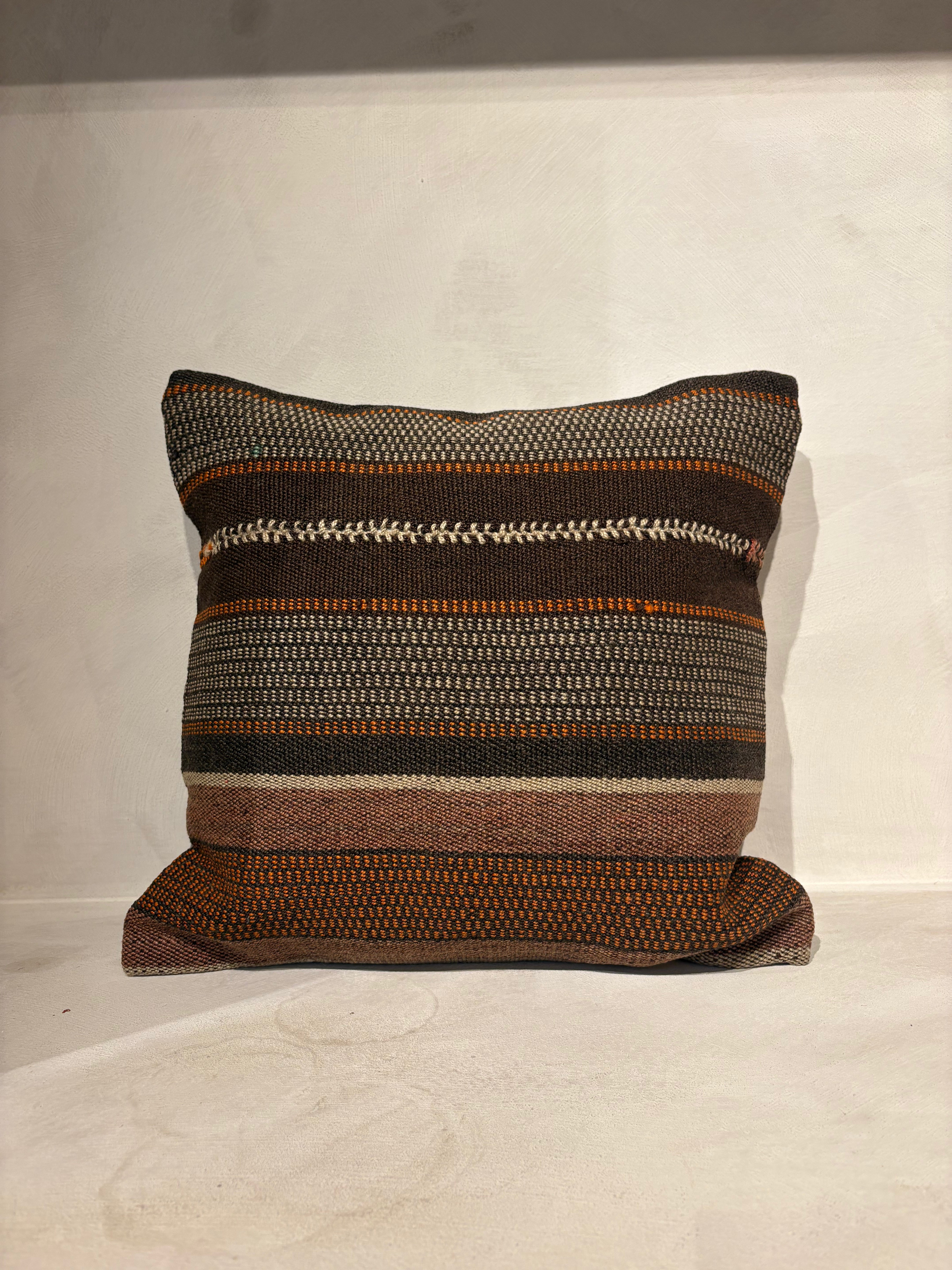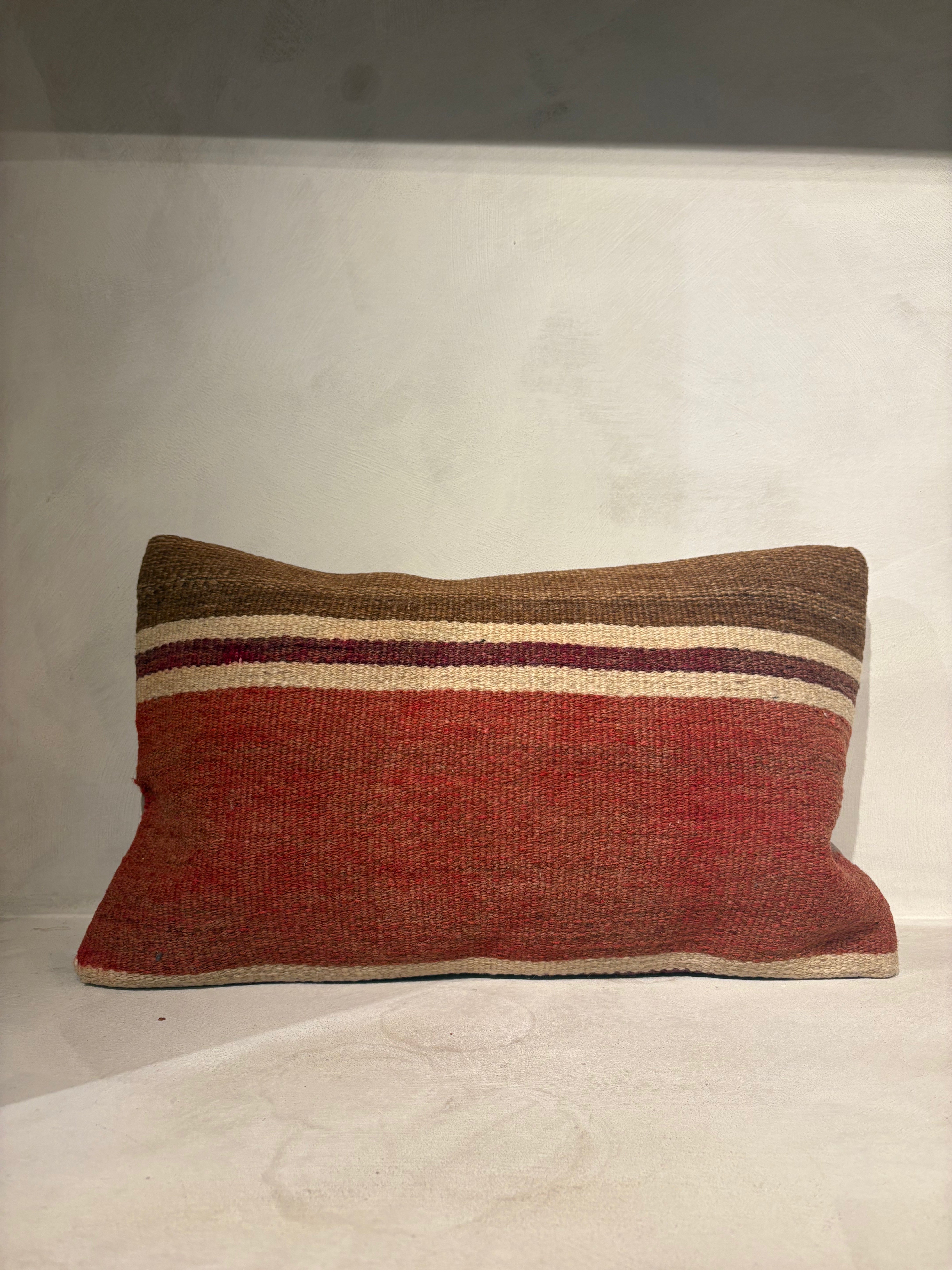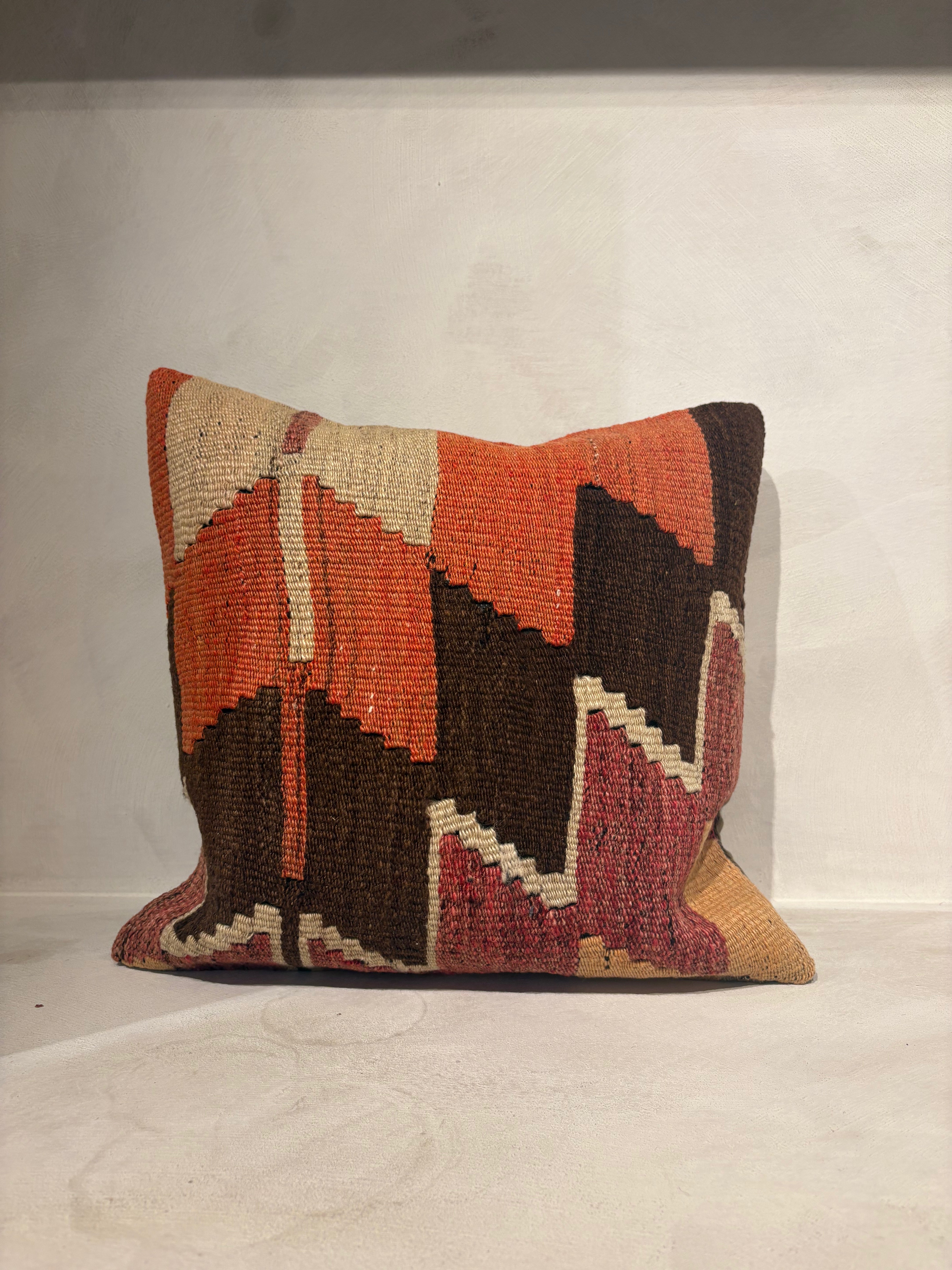 Geef je interieur een warme, stijlvolle touch met dit handgeweven sierkussen. Het geometrische patroon in bruin, rood en oranje tinten zorgt voor een unieke, bohemian uitstraling. Ideaal als statement piece op je bank of fauteuil.